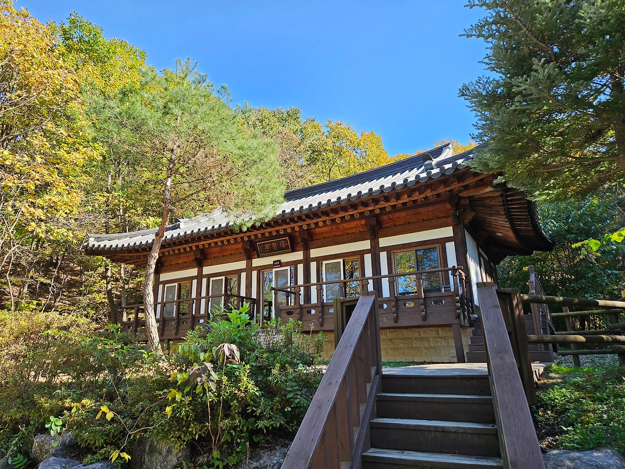 연립동 C마지막 운악산 자연휴양림의 최고 숙소인 운현정으로 발길을 옮겼다. 가장 안쪽에 위치한, 유일한 숲 속의 집. 어떤 모습인지 궁금했다. 운악산 정상에서 쏟아져 내려오는 단풍의 물결을 즐기며, 하늘 위로 펼쳐진 금빛 햇살을 느끼면서 산책로를 걸었다. 그리고 저 멀리 뭔가가 보이기 시작했다. 바로 운현정이었다.
