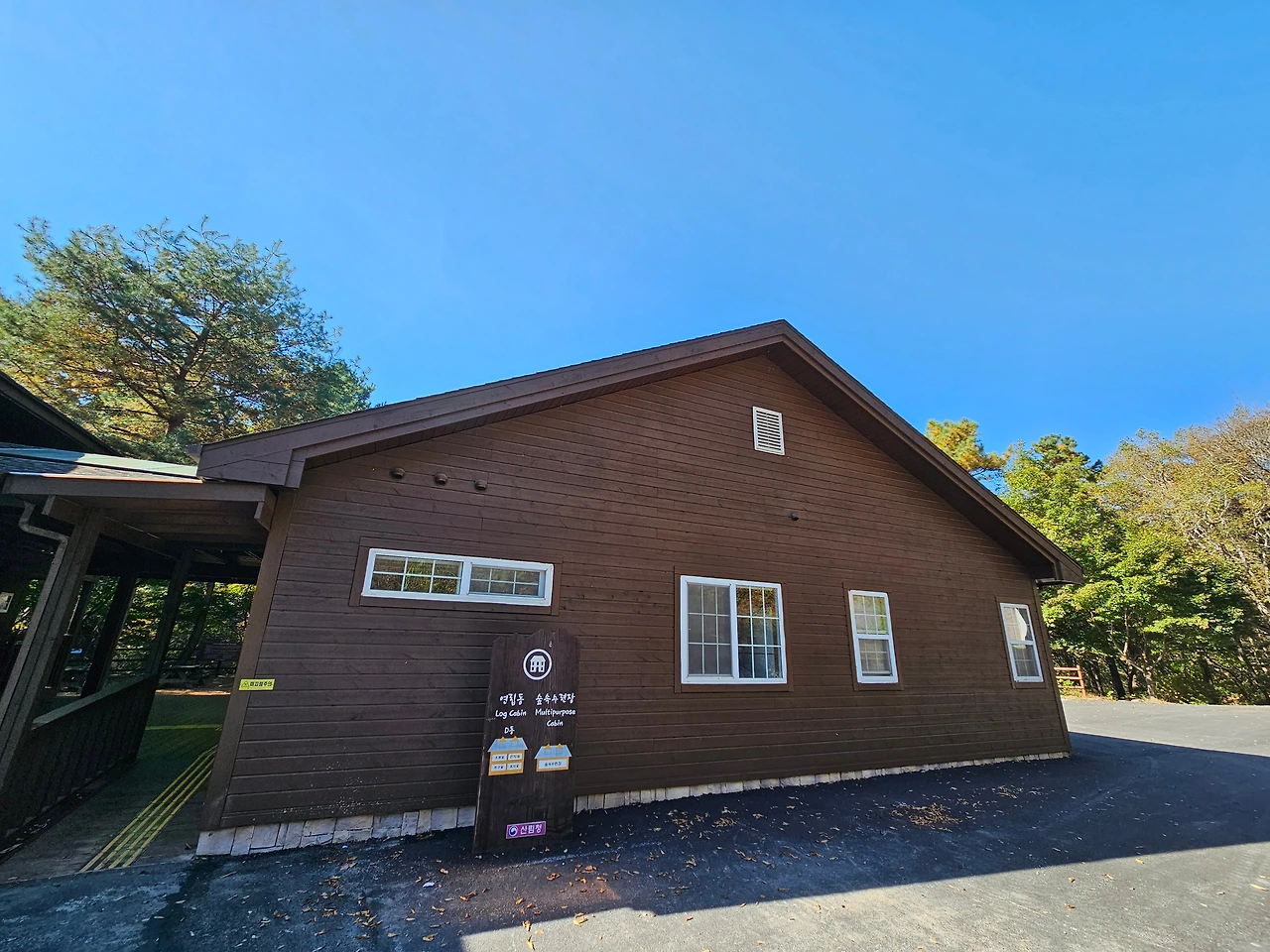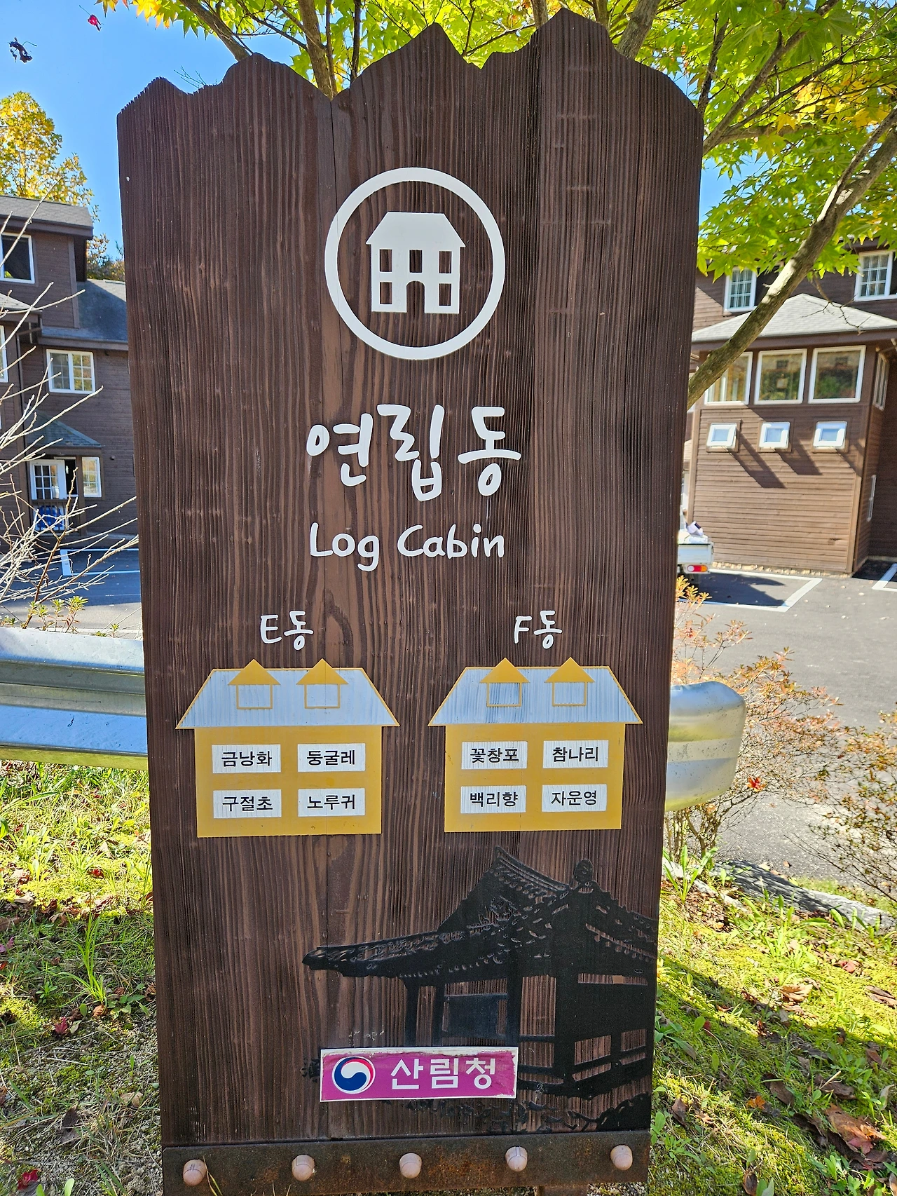 짐 정리를 하고 휴양림을 한 번 둘러보기로 했다. 다시 밖으로 나오니 우리 숙소 옆에서는 F동과 똑같이 생긴 E동이 있었다. 여기가 가장 안쪽에 있는 숙소. 조용한 힐링을 원한다면 옆의 E 숙소도 나쁘지 않아보였다.