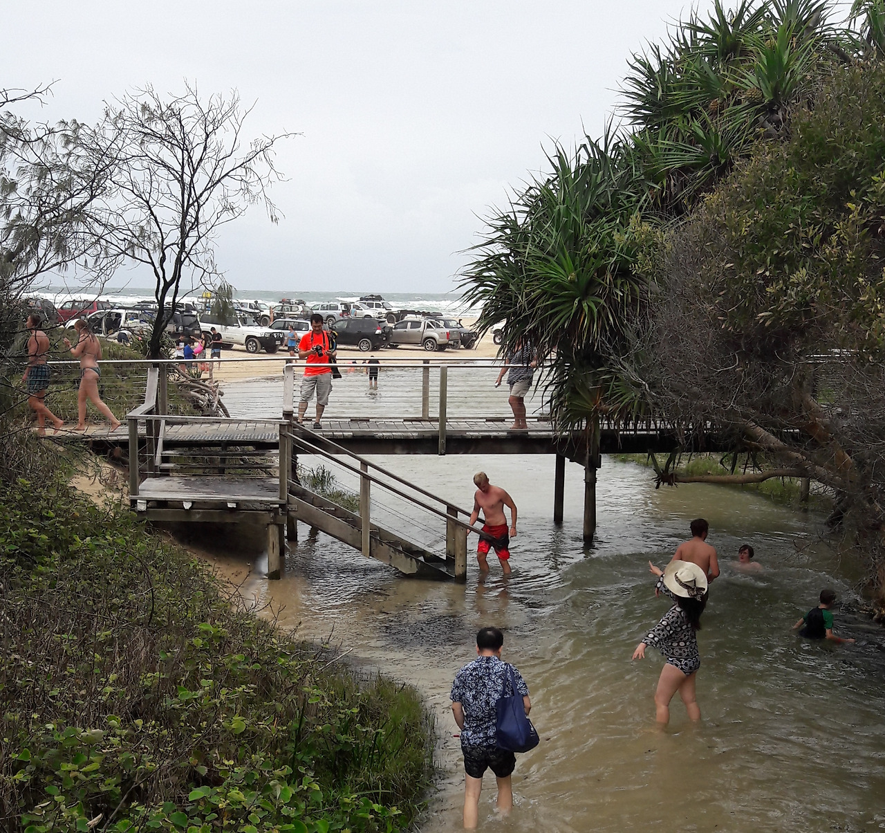 난파선에서 사진 몇 장을 찍고 다시 차에 올랐다. 그리고 아주 오래전부터 꼭 물놀이 하고 싶었던 Eli Creek으로 향했다. 이 섬의 안쪽에서 내려온 물이 바다와 맞닿은 곳에 만들어진 개울. 개울을 흐르는 물이 너무나 맑고 깊이도 얕기 때문에 아이들 물놀이와 어른들 산책 코스로 최고였다. 맥켄지 호수와 함께 사람들이 가장 많이 찾는 프레이저 섬의 명소이기도 하다. 바다와 접해있지만 완벽한 민물이기에 먹어도 문제가 없을 듯 했다. 한 마디로 순수! 그 자체였다. 보는 것만으로, 그리고 그 속을 걷는 것만으로 행복 그 자체였다. 사람들이 모여있는 곳을 가보니 딩고 한 마리가 내려와서 물을 마실려고 대기하는 모습이 보였다.