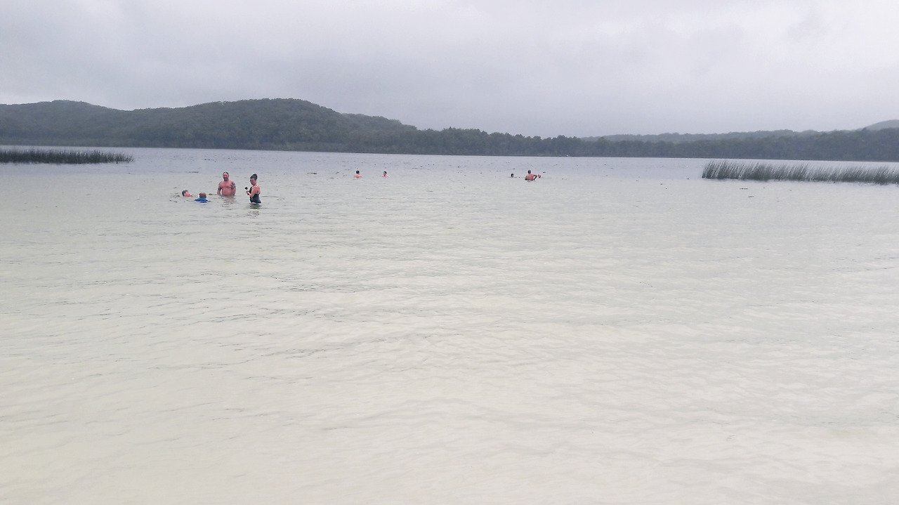 바닷가 근처 작은 모래 해변에서 투어 차량은 빠르게 이동선에 올라탔다. 마치 바지선에 오른 것처럼 페리는 우리 차량을 태우고 15분 정도 바닷길을 건너갔다. 어제의 폭우 때문인지, 프레이저 섬의 모래사장은 여기저기 떠내려온 나무들로 가득했다. 페리는 차량이 운행하기 좋은 곳을 찾아 우리를 내려놓았다. 바다를 건넌 것이었다. 그때부터 우리 차량은 모래사장을 달렸다. 그 유명한 76마일 비치였다. 비행기가 착륙이 가능할 만큼 단단하게 다져진 모래해변. 총길이가 123km나 되는 어마어마한 모래 도로를 달렸다. 오른편에는 태평양의 거센 파도가 우리에게 몰려오고 있었지만 모래해변은 10차로 고속도로처럼 넓었기에 섣불리 다가오지 못했다. 주위를 둘러보니 수많은 투어 차량과 4륜 구동 차량들이 경주하듯 우리 앞 뒤로 달리고 있었다. 바닷물에 잠겨 있는 지역이 나오면 해안의 작은 돌들이 이어진 공간을 이용하여 도로로 활용하고, 오고 가는 차량들이 충돌하지 않도록 보이지 않는 규칙 속에서 자연의 길이 만들어지고 있었다. 완벽한 오프로드를 달리는 생전 처음 하는 경험에 짜릿한 기분까지 느껴졌다. 그렇게 1시간여를 달려서 프레이저섬 중심부에 위치한 숙소 지역인 유롱 (Eurong) 리조트를 지났다. 여기부터는 해변에서 다시 섬 안쪽으로 들어갔다. 섬 안쪽은 지구상에서 유일하게 열대우림이 모래 언덕 위에 위치한 지역이다. 그 안쪽에는 빗물이 만들어낸 거대한 호수들이 있었고 우리의 젓 목적지는 그곳이었다. 프레이저 섬은 모래와 나무만이 존재한다. 때문에 포장된 길은 전혀 없었다. 단단히 굳어진 좁고 좁은 모래 도로 뿐이었다. 4륜 구동의 특별히 개조된 차량이 아니면 움직일 수 없었다. 강력한 출력의 4륜 구동 차량들도 가끔씩 모래 구덩이에 빠져서 움직이지 못하는 경우가 허다하다. 그런 길을 우리 차량은 시속 20~40km 정도의 속도로 달렸다. 좁은 언덕길에서 반대편에서 오는 차량을 만나면 상상하기도 어려운 고난도의 후진이 이어졌고, 아찔한 곡선 드라이브 장면을 이어가며, 섬 중앙의 호수로 이동했다. 11시 정도가 되어서 꿈에 그리던 호수에 도착했다. 폭풍우가 지나간 다음 날이기에 관광객들이 상당히 많이 몰린 맥켄지 호수 (Lake McKenzie) 대신 조용한 비라빈 호수(Lake Birrabeen)로 우리는 이동했다. 가이드는 맥킨지 호수보다도 더 아름다운 호수라며 우리 일행들만 특별한 시간을 즐길 수 있을 것이라고 말했다. 설레는 마음에 호수 입구로 향했다. 하얀 모래와 투명한 호수의 물. 그리고 살포시 낀 안개까지.. 마치 영화 속 한 장면을 보고 있는 듯 했다. 너무나 고요했다. 역시 우리 일행 말고는 호수에는 아무도 없었다. 흐린 하늘이 아쉽기는 했지만, 호수 자체만으로 상상 그 이상이었다.