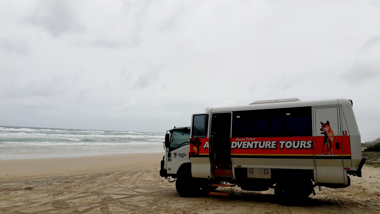 간단히 가방을 챙겨서 숙소 앞 큰길로 나가보았다. 다행히 밤새 내리던 비는 어느덧 그쳐있었다. 픽업 차량은 약속 시간보다 5분 정도 늦은 5시 50분에 숙소 앞에 도착을 했다. 내 이름을 확인한 후에 투어를 위해 개조된 특별한 4륜 구동 차량에 오를 수 있었다. 오늘에서야 꿈에 그리던 '프레이저 아일랜드'에 간다는 생각만으로 기대가 가득했다. 누사에서는 여기저기 숙소를 돌면서 투어 신청자들을 픽업했다. 노부부부터 젊은 연인들, 그리고 가족까지 여러 그룹이 차에 올랐다. 혼자 여행온 사람은 오직 나뿐이었다. 누사(Noosa)에서 투어 멤버들을 태우고 차량은 레인보우 비치(Rainbow Beach)로 1시간 30분을 달렸다. 레인보우 비치의 휴게소에 잠시 들러 마지막 가족 1팀을 태웠다. 오전 9시 드디어 프레이저 아일랜드로 투어 차량은 이동했다.