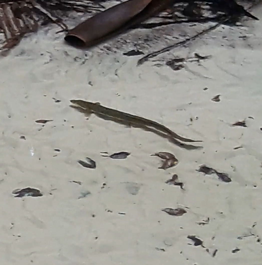 프레이저 섬의 중앙 우림 (Central Station/Rainforest)이었다. 맑은 호수에서 내려온 개울이 흐리고 열대 우림이 가득한 지역이었다. 그곳에 도착하니 다시 비가 내리기 시작했다. 큰 폭우는 아니었지만 주룩주룩 열대 우림 속에 내리는 비는 불편함보다는 여행객의 감성을 자극하기 충분했다. 비를 맞으며 열대우림 걷는 것도 하나의 추억이었다. 우리 일행은 열대우림을 산책하고 차량 기사는 식사 장소에서 바비큐 요리를 하며 관광객들의 점심 식사를 준비했다. 열대우림을 걸으면서 우연히 개울 속의 민물장어 한 마리를 발견했다. 실제 자연 속에서 민물장어를 만난 것은 처음이었다. 크기도 어마어마했다. 하류를 향해 내려가는 모습. 문뜩 신해철의 '민물장어의 꿈' 노래 가사가 생각이 났다.