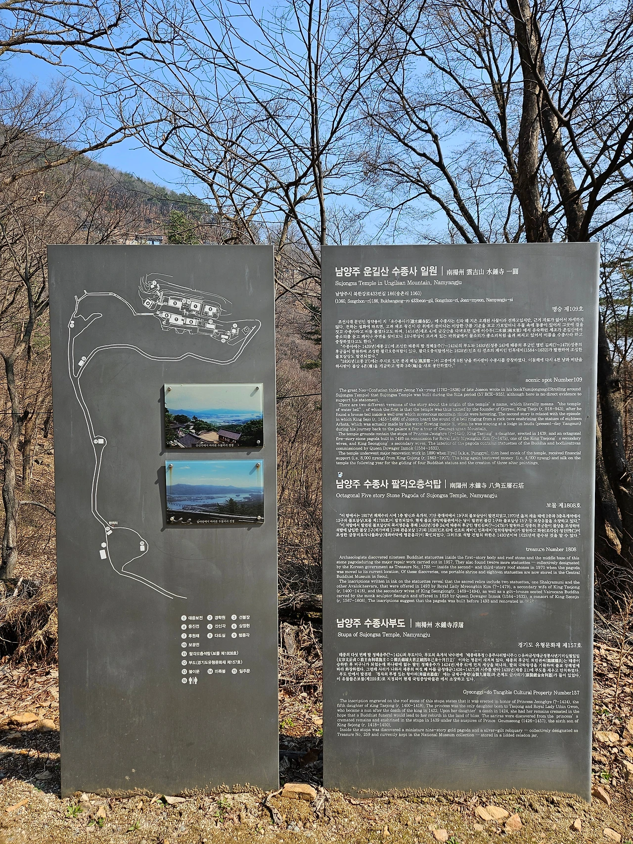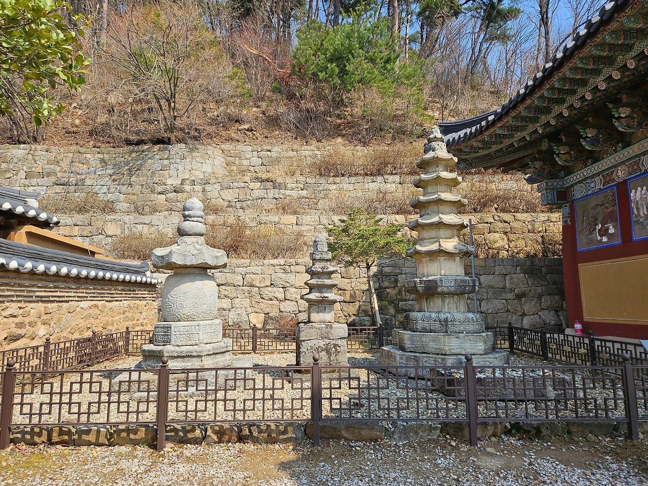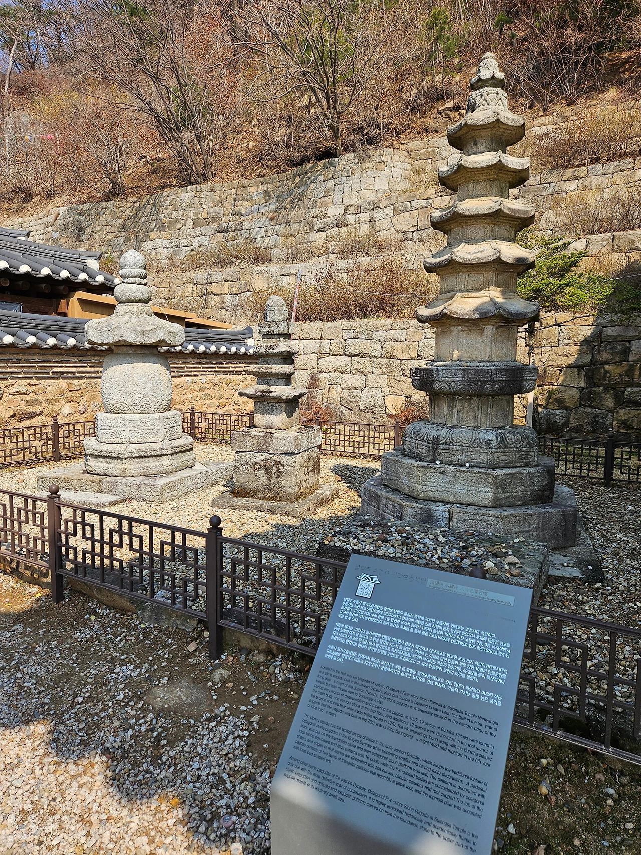 나의 시선을 가장 먼저 끈 것은 대웅전 옆의 근사한 팔각오층석탑과 사리탑이었다. 두 개 모두 보물로 지정되어 있었다. 팔각오층석탑은 고려시대 팔각석탑의 전통을 이어 조선시대에 건립된 석탑이었다. 1493년에 건립되어 1628년에 중수(重修)된 오래된 석탑이었다. 그 옆으로 사리탑이 있었는데 태종 이방원의 딸 정혜옹주를 위해 만들어진 사리탑이라고 한다. 총 높이 2.3m의 석조 사리탑으로 8각을 기본 형태로 하고 있다. 2단을 이루는 기단 위에 둥근 구형의 탑신을 올리고 옥개석(지붕돌)과 머리 장식을 얹었다고 설명되어 있었다. 소박하지만 역사와 전통이 가득한 명사찰임이 틀림없었다.