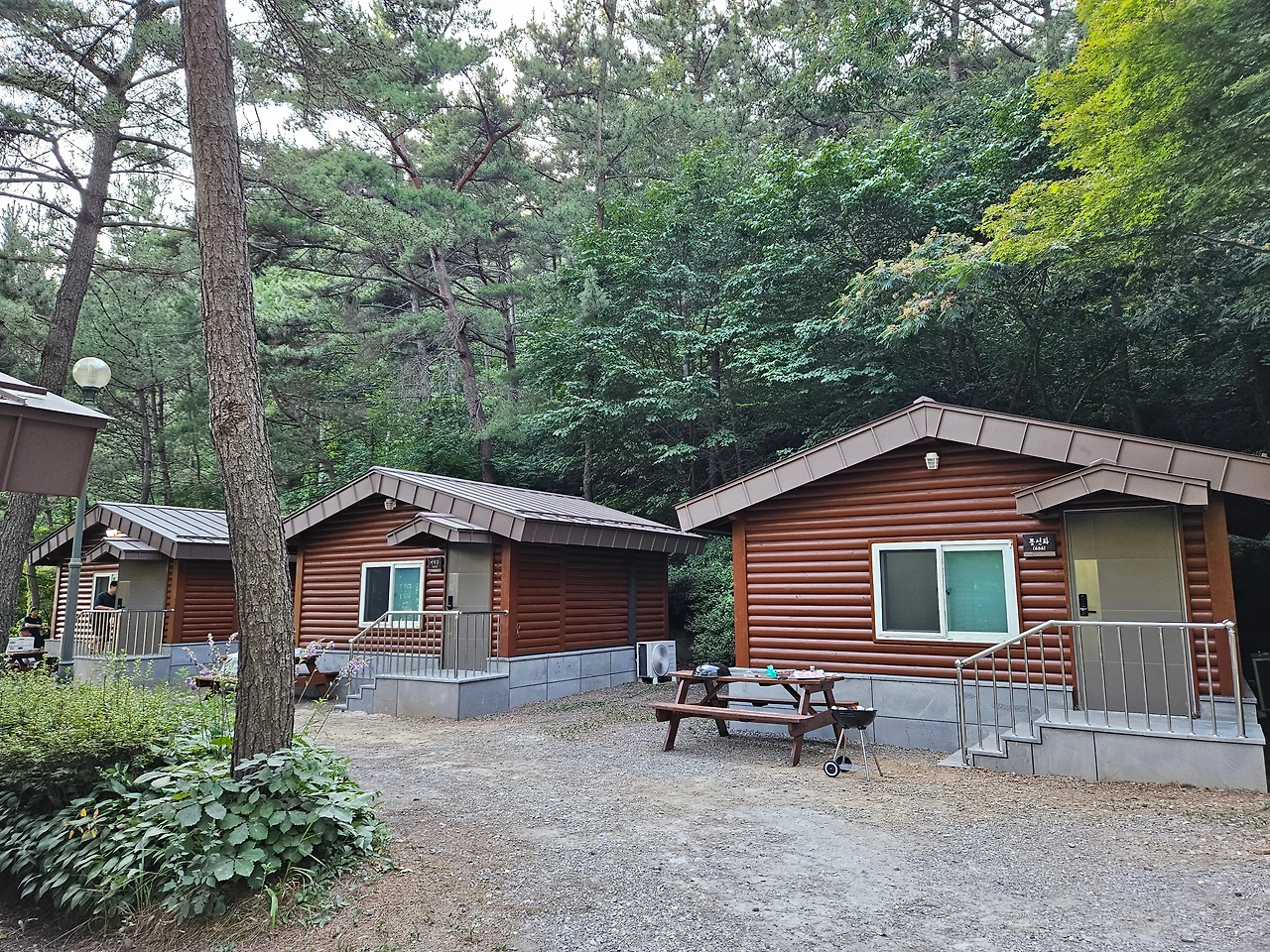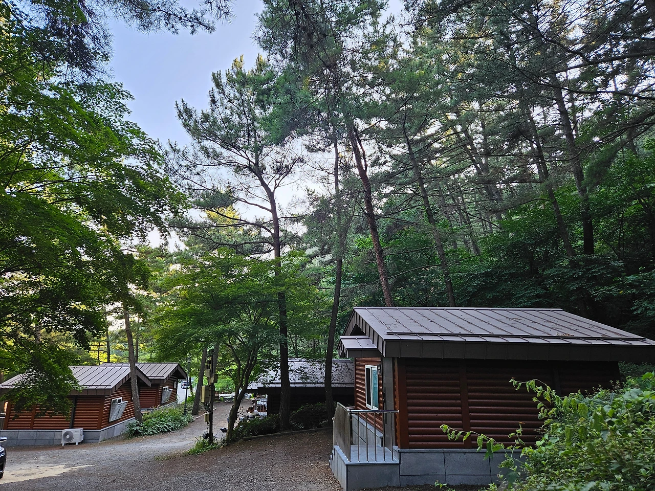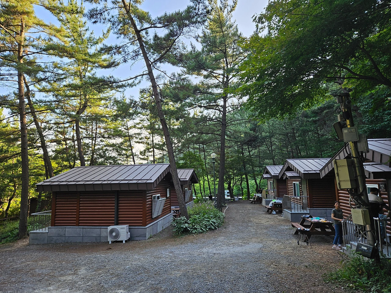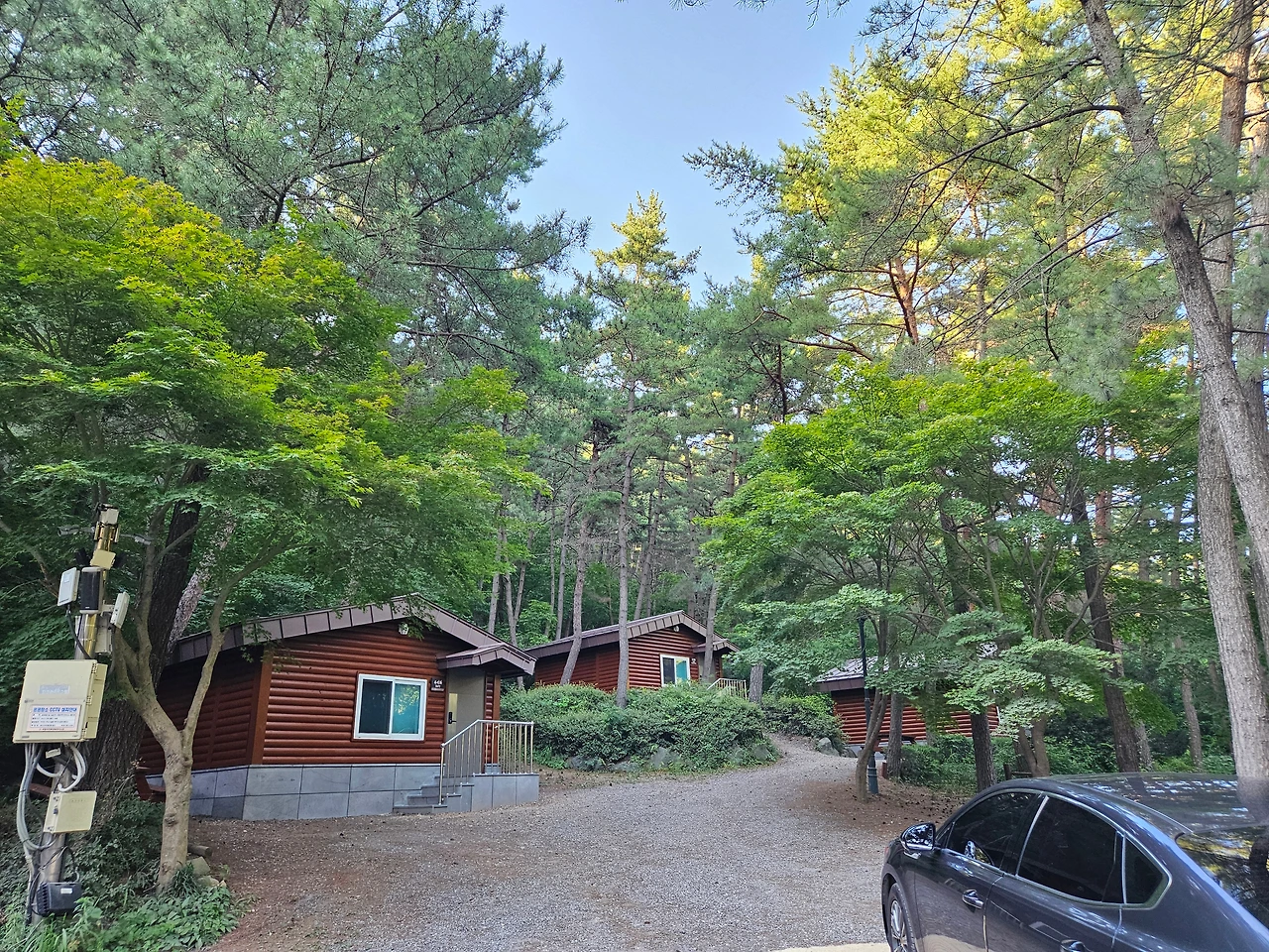 숲 속의 집 모두가 비슷한 모양이고 창은 그리 크지 않았다. 날씨가 더워서일까? 대부분 이용객들은 밖에 있는 데크로 나와서 음식을 준비하고 있었다. 옹기옹기 모여 있는 숲 속의 집들을 보니 마치 스머프가 살고 있는 신비한 숲에 들어온 기분이었다. 이곳은 주차 공간도 넓지 않기에 몇 대 정도는 숙소 앞이 아닌 오토캐핑장 인근이나 개울 건너편에 주차를 해야 할 듯했다.