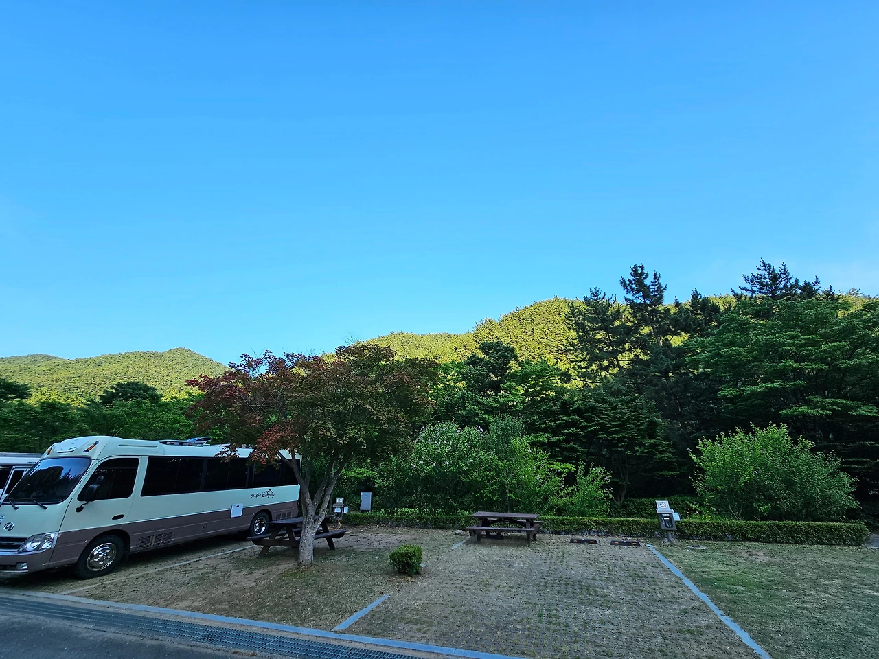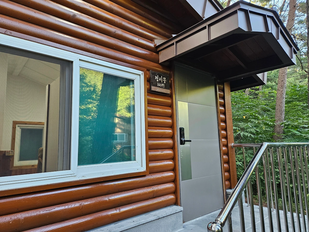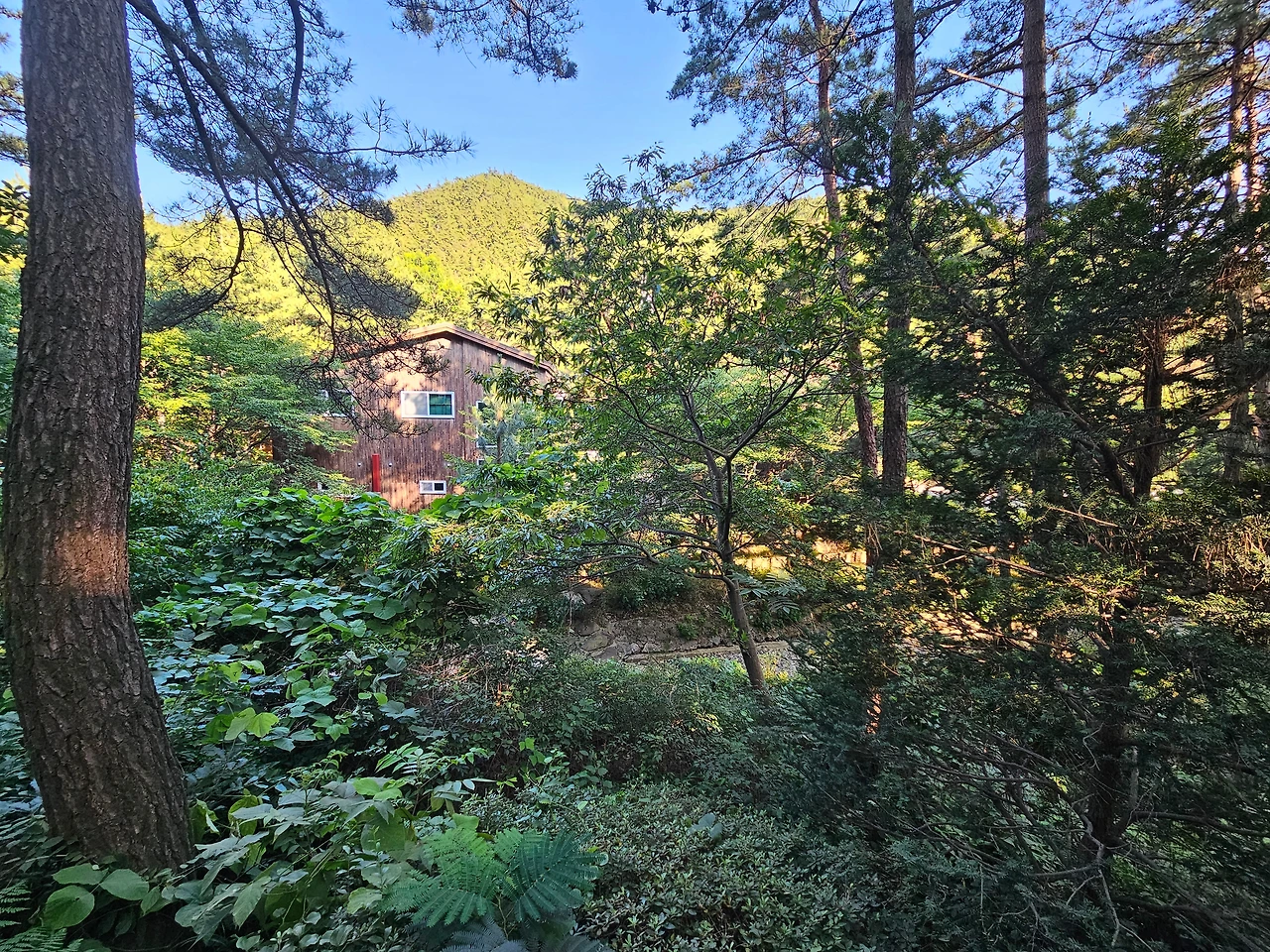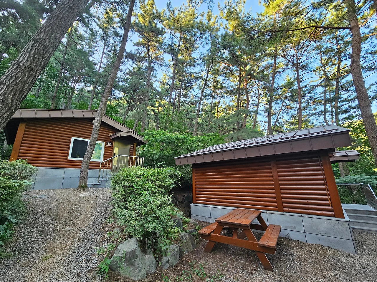 숲 속의 집 모두가 비슷한 모양이고 창은 그리 크지 않았다. 날씨가 더워서일까? 대부분 이용객들은 밖에 있는 데크로 나와서 음식을 준비하고 있었다. 옹기옹기 모여 있는 숲 속의 집들을 보니 마치 스머프가 살고 있는 신비한 숲에 들어온 기분이었다. 이곳은 주차 공간도 넓지 않기에 몇 대 정도는 숙소 앞이 아닌 오토캐핑장 인근이나 개울 건너편에 주차를 해야 할 듯했다.