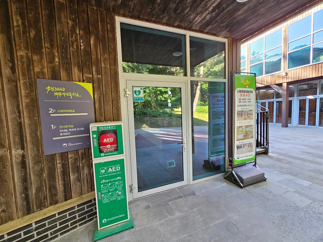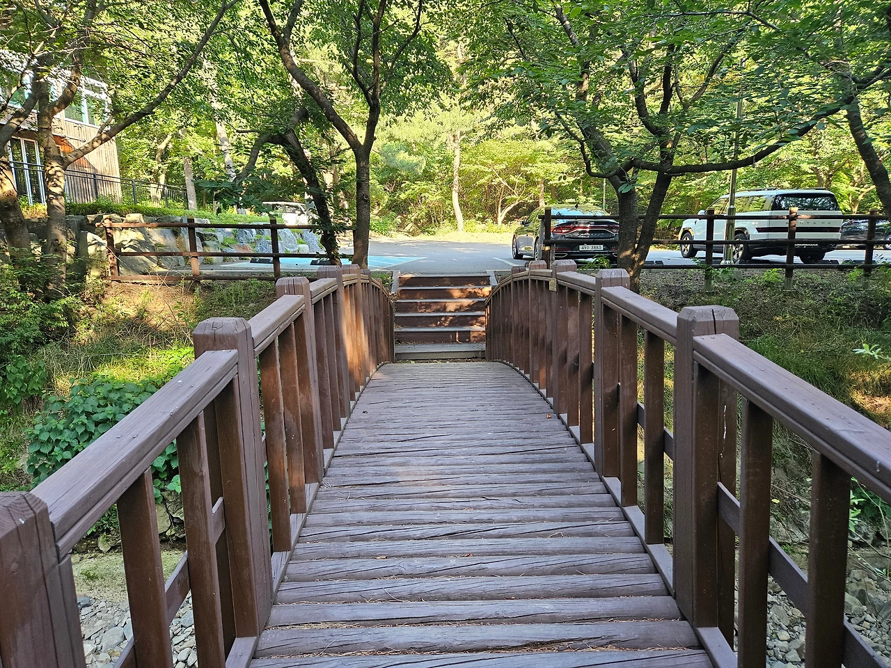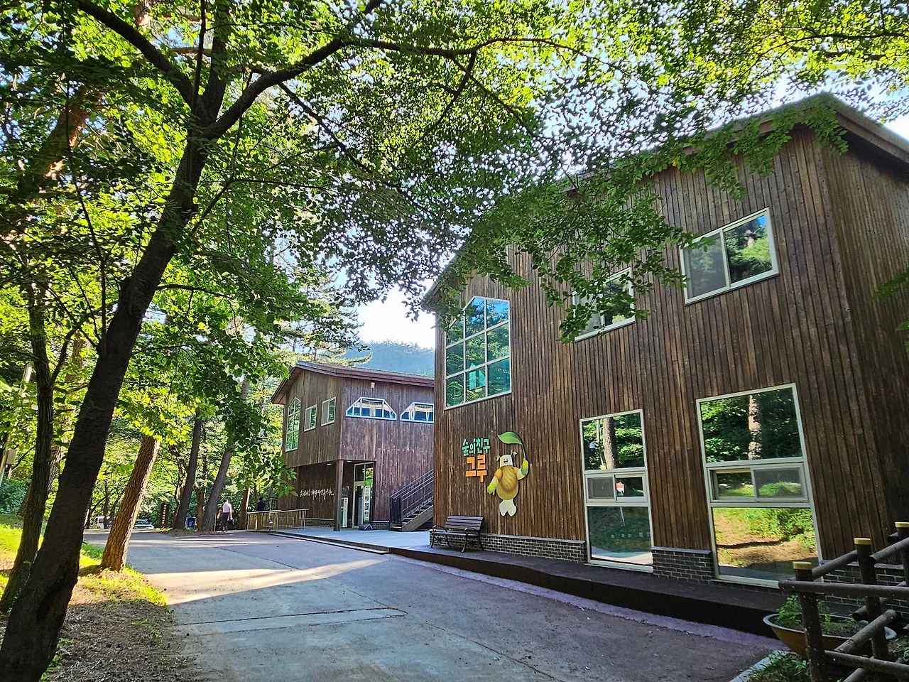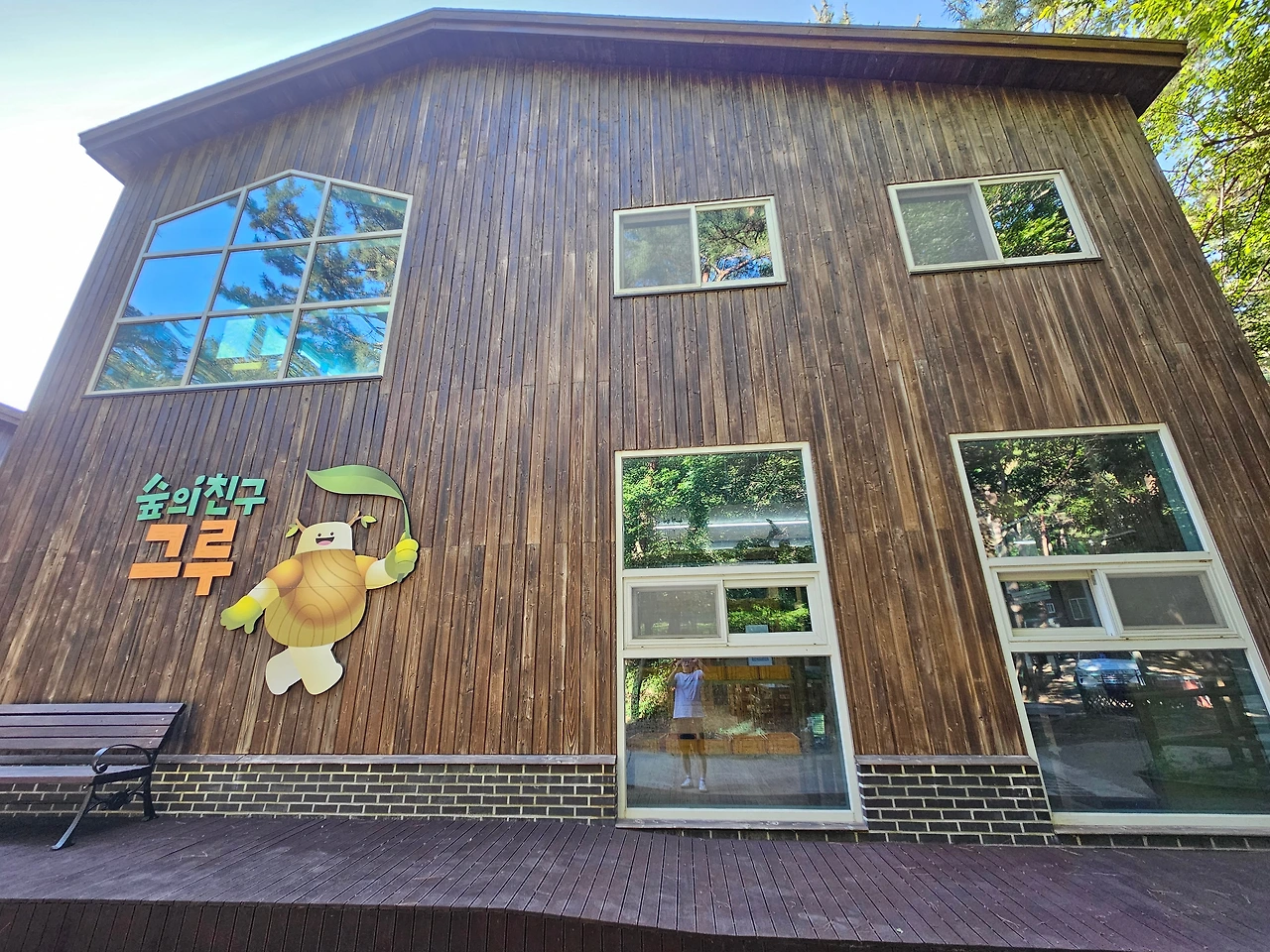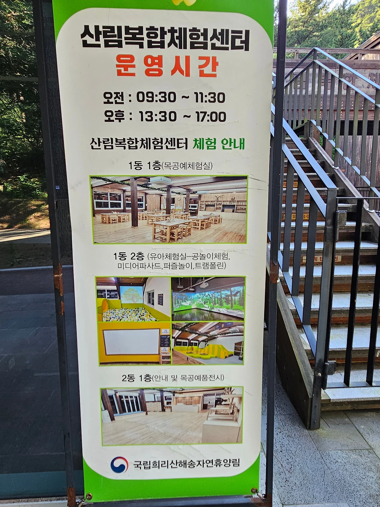 짐을 풀고 휴양림 나들이를 나섰다. 작은 계단을 걸어서 내려가니 작은 개울이 나타났고 건너편에는 확 트인 주차장이 나왔다. 그 앞에 산림복합체험센터가 있었다. 늦은 시간이라서 문을 닫았지만 평소에는 오전 9시 30분부터 17시까지 목공예 체험 등을 즐길 수 있다고 했다.