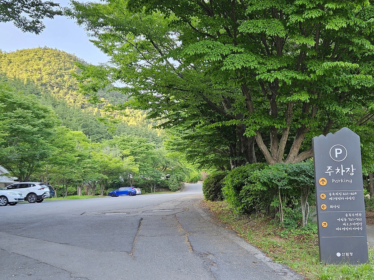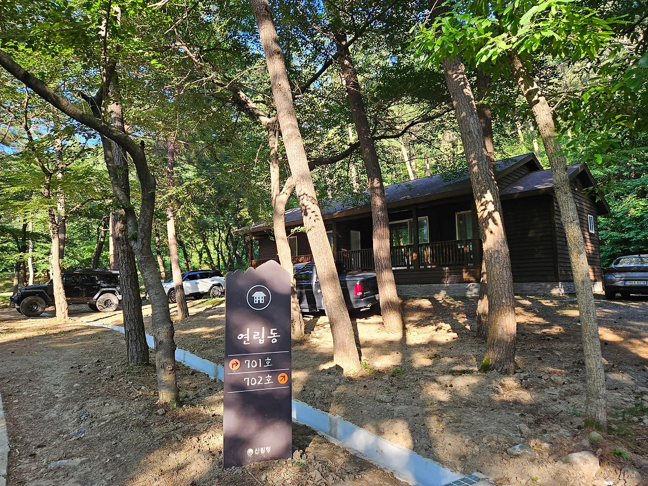 입구를 지나니 크게 펼쳐진 오토캠핑장에 먼저 눈에 보였다. 이미 많은 사람들이 차를 주차하고 바로 옆에 텐트를 치고 분주하게 오토 캠핑을 준비하고 있었다. 몇 팀은 의자를 이미 의자를 펴고 책을 읽거나 테이블에 둘러 않아서 고기를 굽고 있었다. 진정한 캠핑의 계절, 여름이 온 것이 분명했다. 차를 타고 조금 더 올라가니 숲 속의 집 구역 표시가 눈에 보였다. 이곳에는 9개의 숲 속의 집이 나란히 줄지어 있었다. 크기를 보니 대부분이 4인용 방인 듯했다.