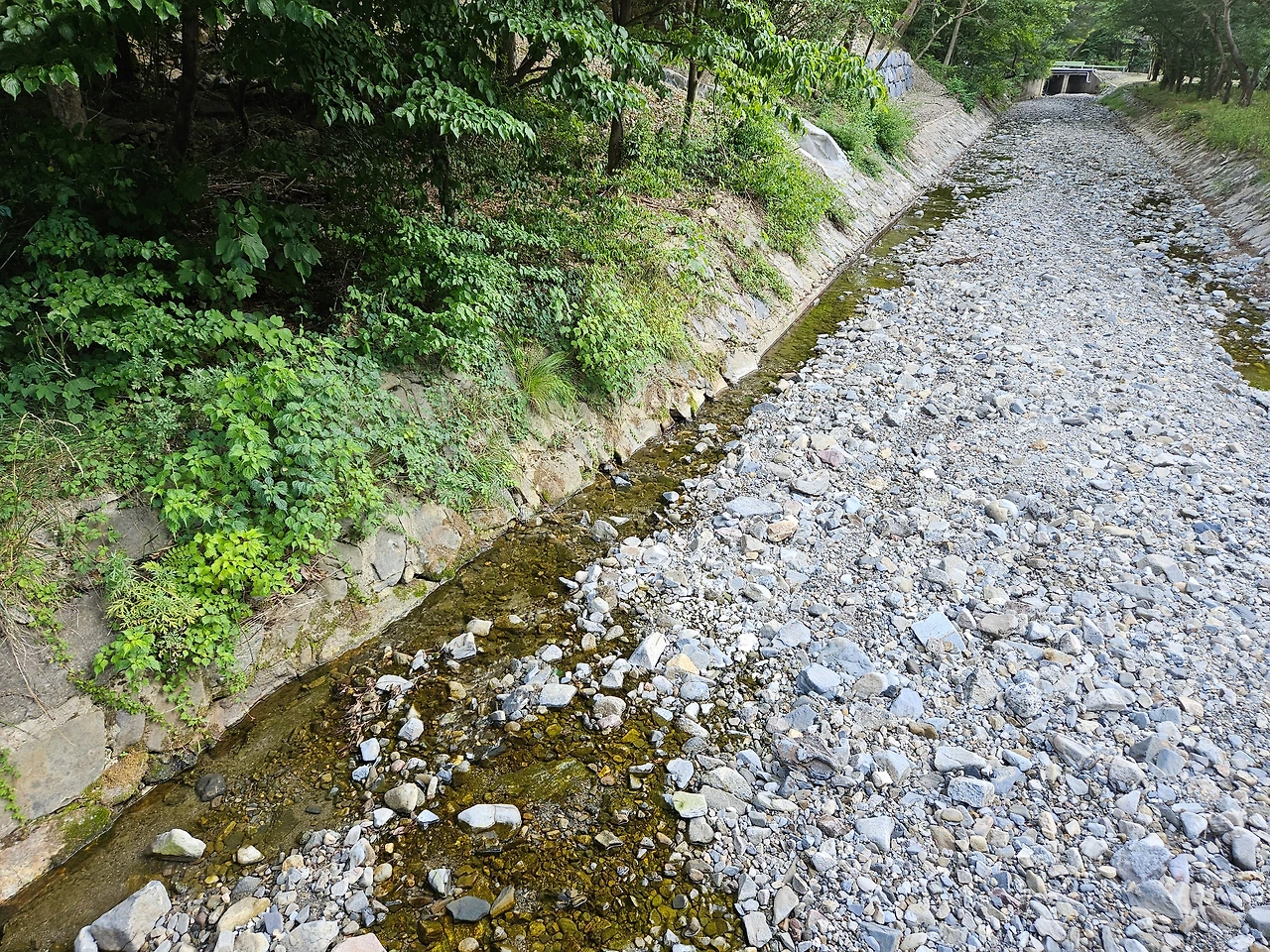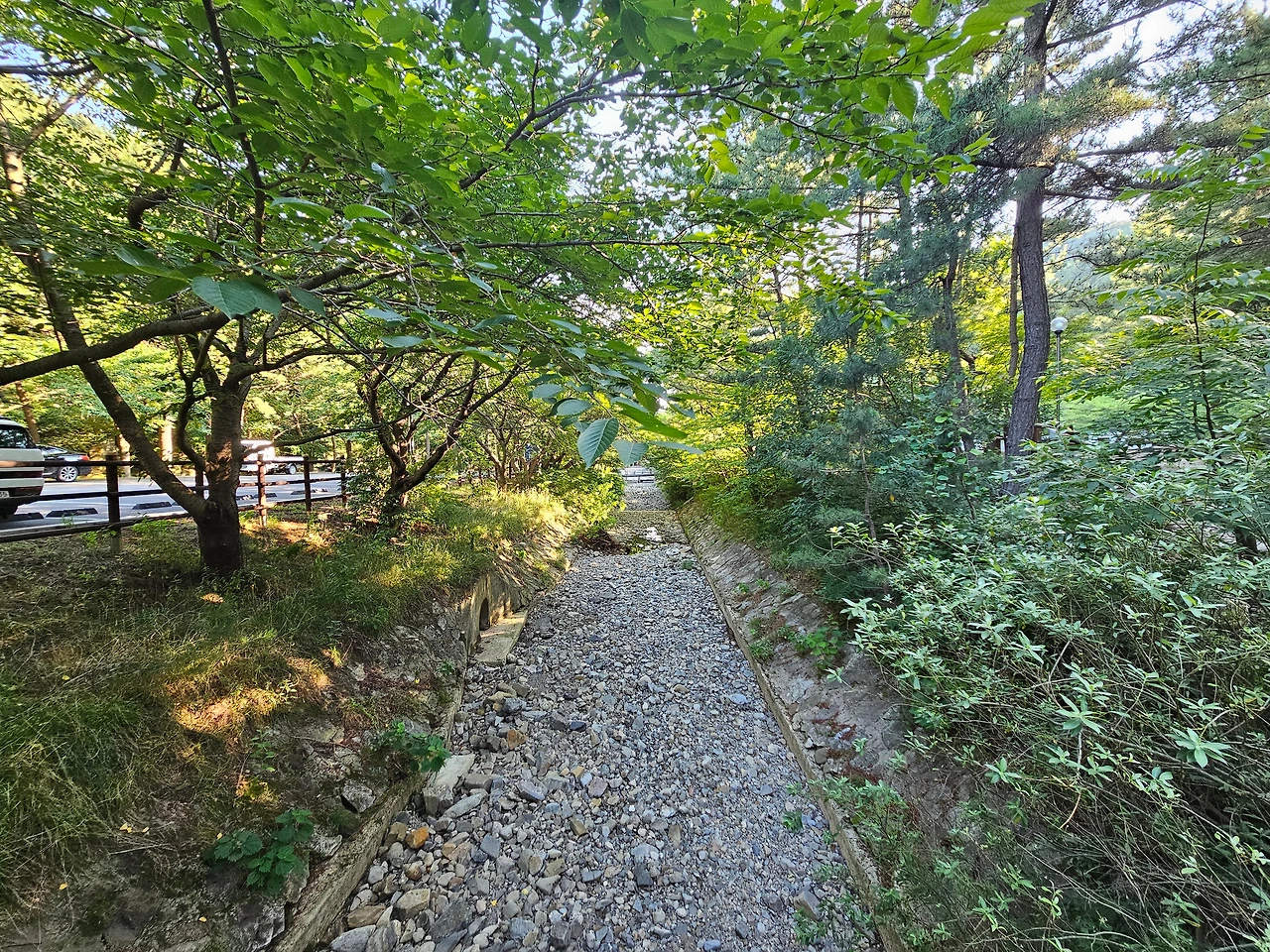 날씨가 더워서 살포시 개울가로 내려갔다. 무더위 때문인지 개울은 말라있었지만 몇몇 곳은 잔잔히 맑은 물이 흐르고 있었다. 손을 담가보니 얼음처럼 참으로 시원했다. 더위가 싹 사라졌다. 비가 조금 더 내린다면 깊이가 적당하여 충분히 맑은 개울물 속에서 물놀이를 즐길 수 있을 듯했다.