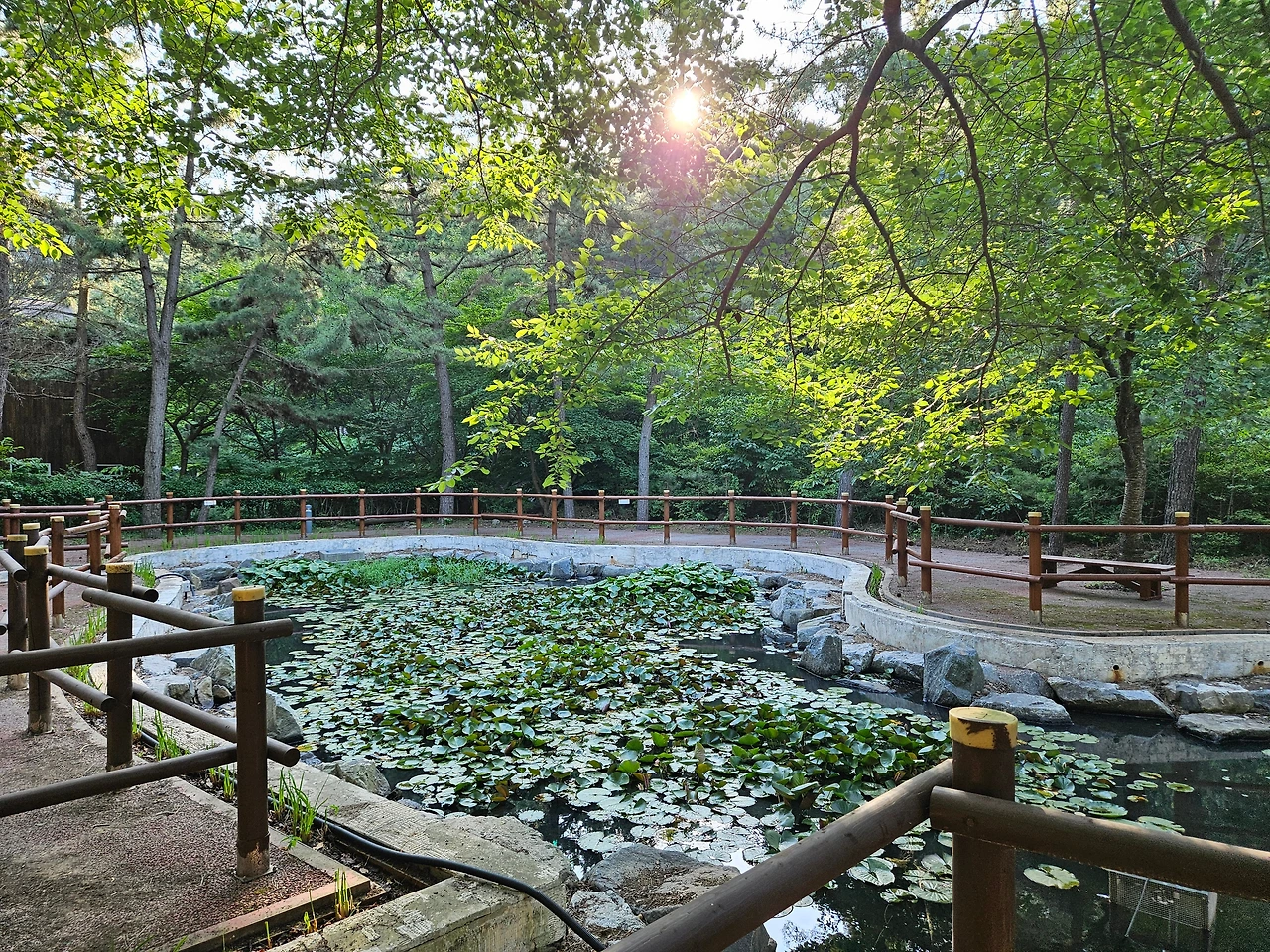 그 뒤쪽으로는 멋진 연못이 있었다. 연꽃이 예쁘게 피어 있는 공간으로 근사한 풍경을 자아내고 있었다. 여기부터는 뒤쪽의 야영장까지 하늘높이 뻗는 소나무들이 이어지고 있었다. 가족끼리 손을 꼭 잡고 걷기 좋은 길이었다. 날씨가 조금 더웠지만 시원한 소나무 그늘 속에서 이런저런 얘기를 나누면서 오붓하게 산림욕을 즐기기 최고의 길이었다. 바로 그 길 옆에는 연립동이 있었는데 대가족이 희리산 휴양림을 즐길 때 이용하기 유용한 숙소로 보였다.