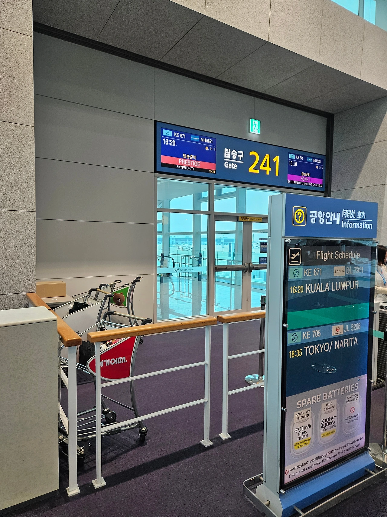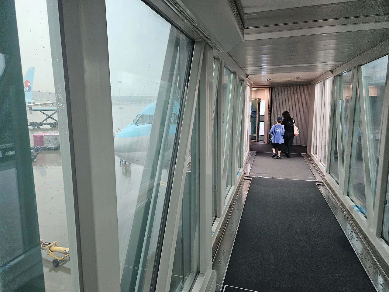 우리 항공편은 KE671. 인천공항을 오후 4시 20분에 출발하여 말레이시아 쿠알라룸푸르에 오후 10시 정도에 도착하는 일정이었다. 라운지에서 간단히 점심을 먹고 보딩 시간에 맞춰서 탑승구로 향했다. 아들 녀석의 손을 잡고 가장 먼저 항공기에 탑승했다.