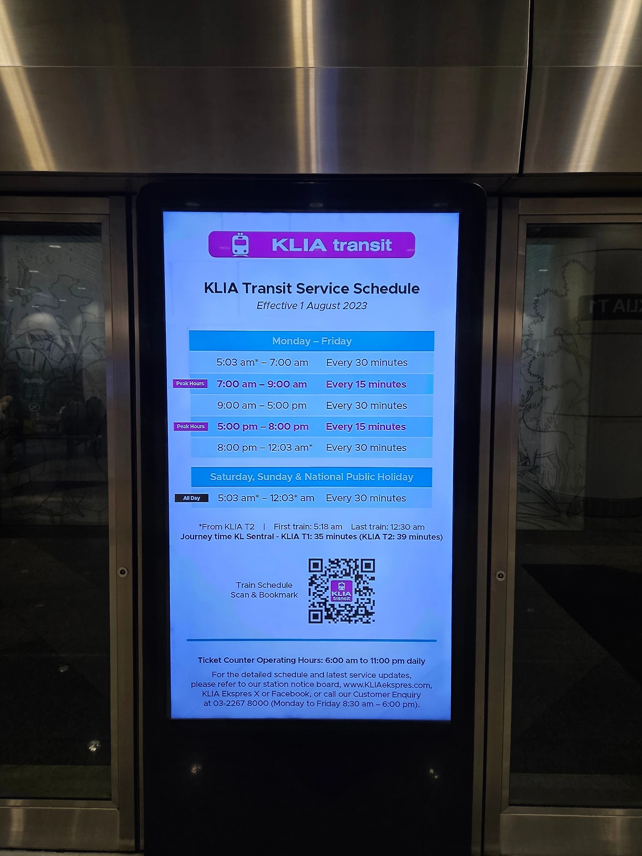 우리는 지하 1층으로 내려와서 KLIA EXPRESS 열차를 기다렸다. 공항에서 쿠알라룸푸르 센트럴역까지 28분 만에 이동할 수 있는 가장 빠른 교통수단으로, 오전 5시부터 자정까지 20분 간격으로 운행하고 있었다.