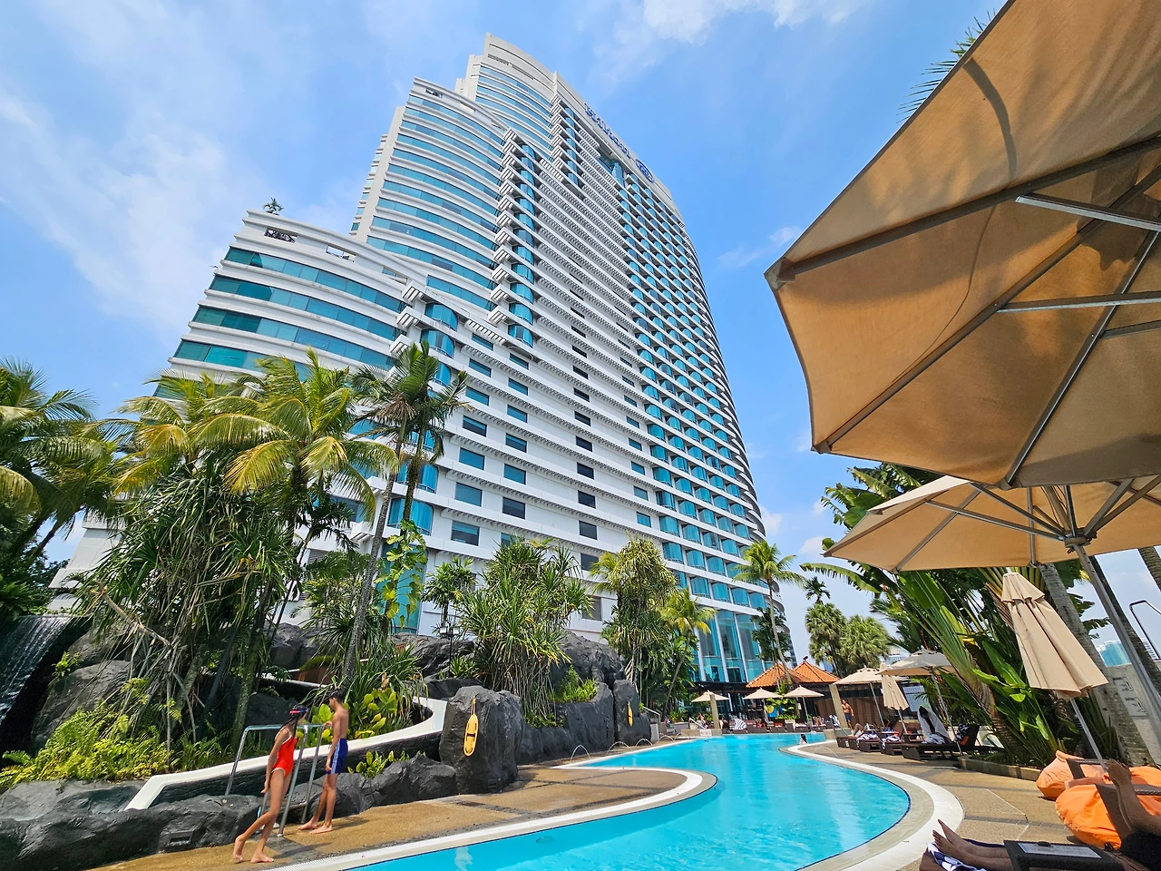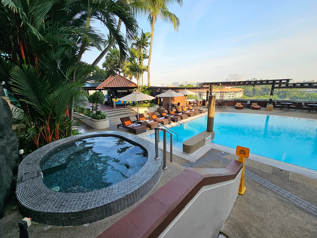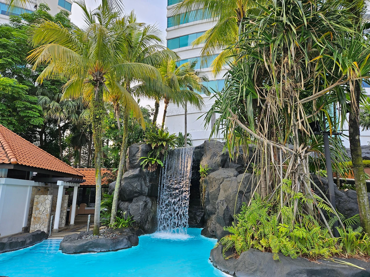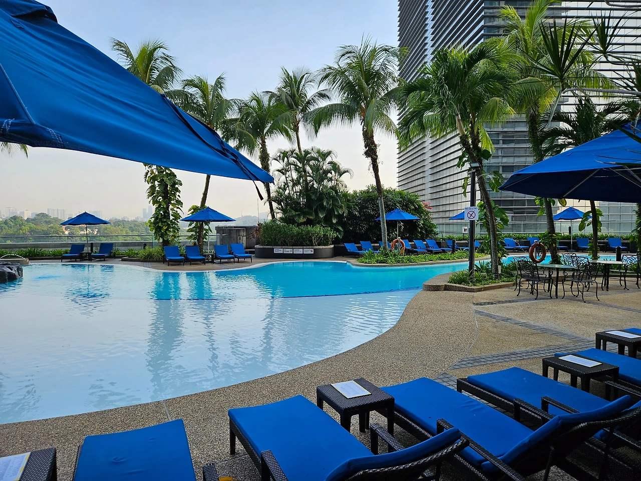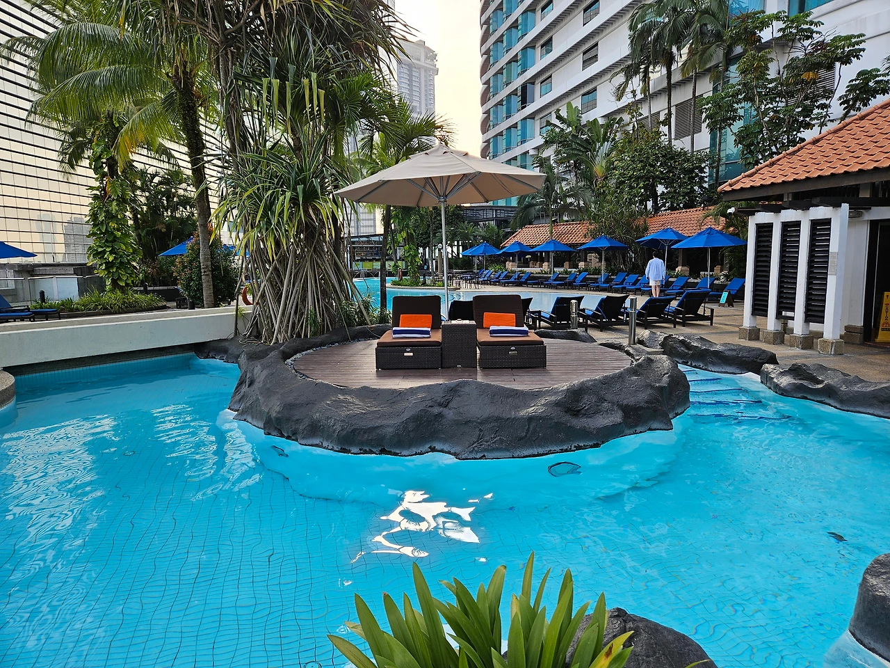 식사를 하고 호텔을 한 바퀴 둘러보았다. 가장 눈에 띈 것은 8층에 있는 수영장이었다. 오전 6시부터 밤 11시까지 이용한 가능했고 규모도 상당히 컸다. 시원한 폭포수부터 워터 슬라이드, 근사한 바까지 갖추고 있었다. 자세히 둘러보니 쿠알라룸푸르 힐튼 호텔과 쌍둥이 호텔인 르메르디앙이 함께 공유하는 수영장이었다. 두 호텔 투숙객들은 비치타울만 다를 뿐, 어떤 공간을 사용해도 된다고 했다. 공간이 넓어서 선배드도 상당히 여유가 있었다.