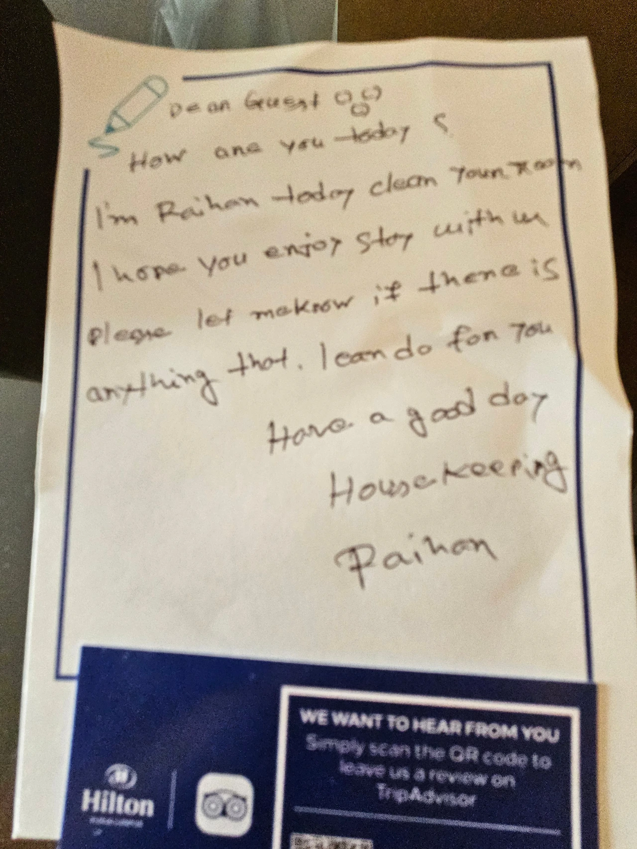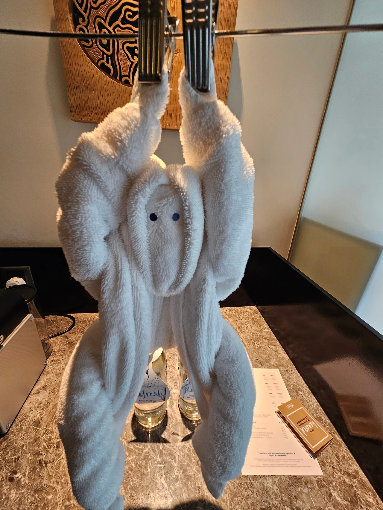 오후 4시. 슬슬 배가 고프기 시작했다. 아이 녀석이 밥을 먹고 싶다고 했다. 아내는 센트럴역 앞에 있는 쇼핑몰에서 저녁을 먹으러 가자고 했다. 우리 가족은 수영장에서 짐을 챙겨서 방으로 올라갔다. 그 사이에 방은 깔끔하게 정리된 상태. 손편지와 함께 수건으로 만든 예쁜 인형까지 있었다. 직원들의 친절함에 반하지 않을 수 없었다.