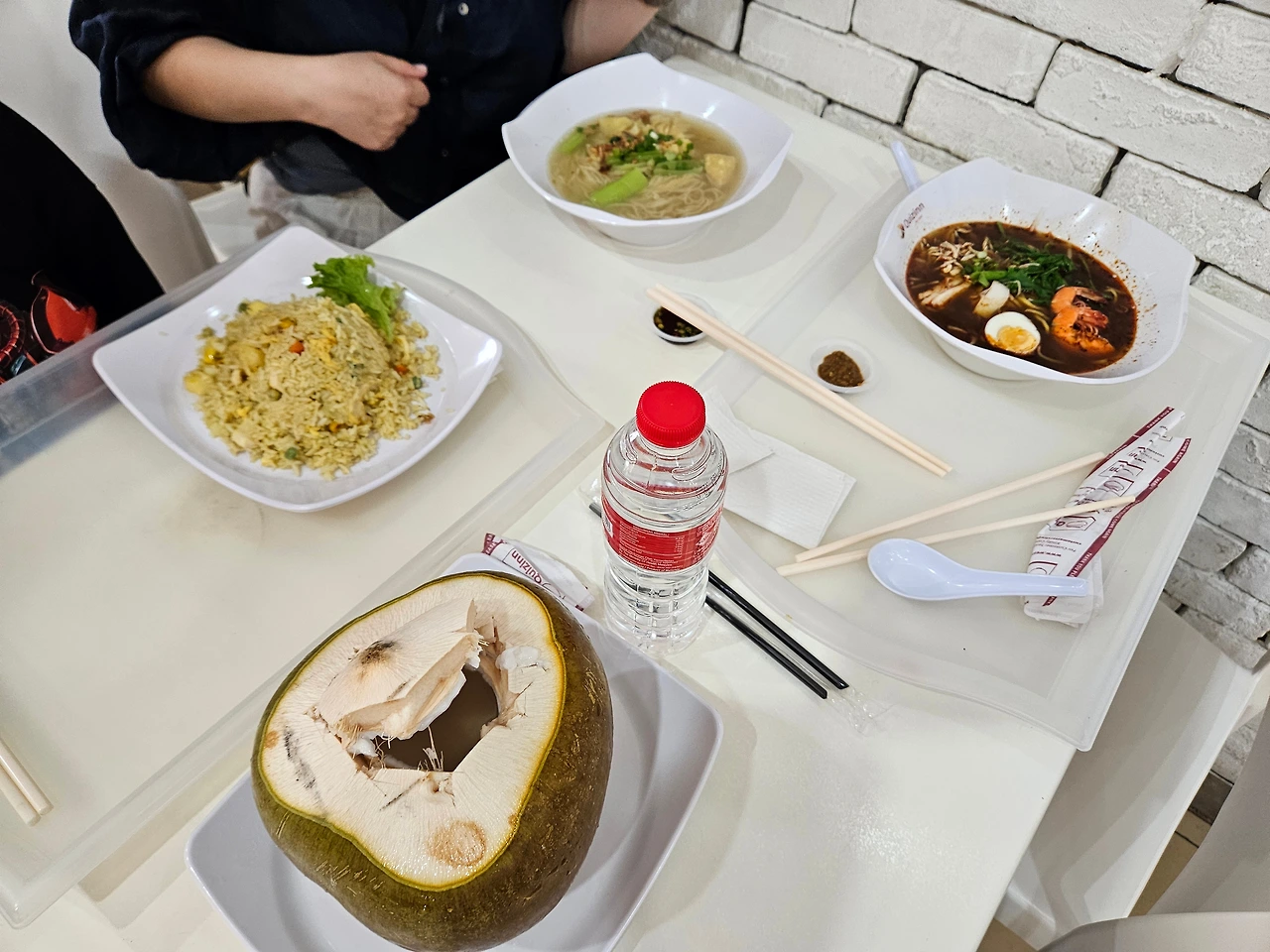 호텔 연결 통로를 따라서 내려가면 쿠알라룸푸르 센트럴역으로 바로 연결되었다. 역 반대편에 바로 쇼핑몰이 있었다. NU central mall이라고 적혀있었고 입구부터 간식과 음료를 파는 상점들이 이어졌다. 현대식으로 잘 만들어진 어마어마한 쇼핑몰이었다. 관광객들보다는 현지인들이 많아 보였고 슈퍼마켓부터 푸드코드, 다양한 상품까지 없는 것이 없을 정도였다. 우리 가족은 3층에 있는 푸드코트로 향했다. 음식 종류가 다양했고 가격도 비싸지 않았다. 우리 돈 4000~5000원 정도면 한 끼를 해결할 수 있을 정도. 여기저기를 둘러보다가 파인애플 볶음밥과 새우탕, 완탕면을 주문했다. 아들 녀석은 코코넛 음료가 먹고 싶다고 해서 그것도 하나 주문했다. 사실 아무 맛도 없기에 코코넛 주문을 막았지만 생애 처음으로 먹어보고 싶다는 아들의 마음에 상처를 주고 싶지는 않았다. 잠시 후에 음식이 나왔고 배고픔을 반찬 삼아서 열심히 음식을 먹었다. 조금 짠다는 느낌이었는데, 나름 먹을만했다.