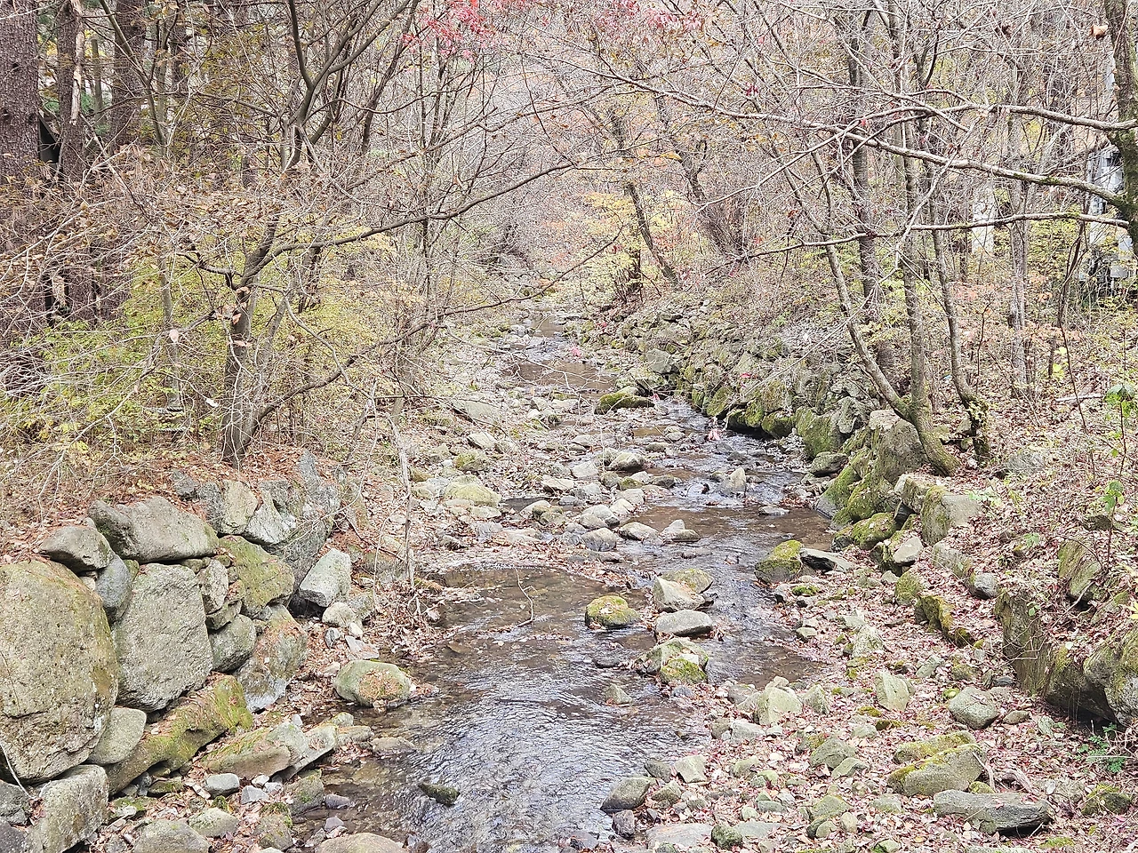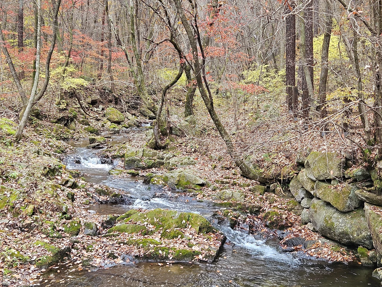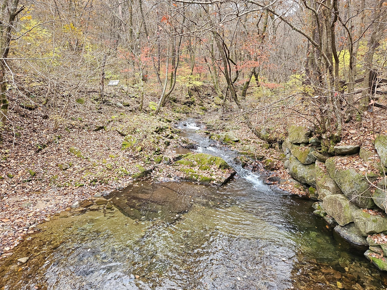 다시 휴양림 아래쪽으로 내려왔다. 우리 곁에는 경쾌한 소리를 내며 흐르는 작은 계곡물이 있었다. 여름에는 수량이 꽤 많았는데 가을에는 조금 줄어든 느낌이었다. 하지만 중간중간 물이 모여있는 곳에는 남성스러운 계곡의 풍모를 보여주며 경쾌한 물소리를 만들어내고 있었다. 사실 휴양림 주변으로 높은 봉우리가 병풍처럼 둘러싸고 있고 아홉 갈래의 계곡인 산음천을 따라 맑은 물이 풍부하게 흐르고 있었다.