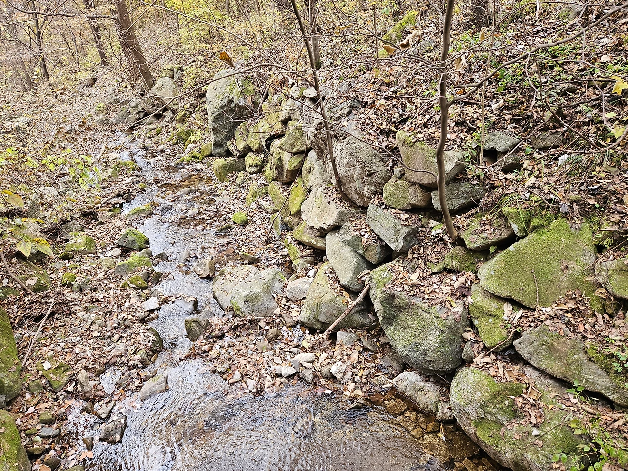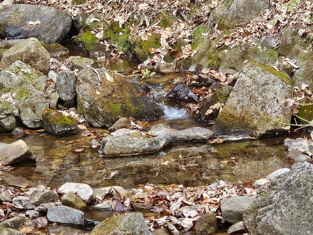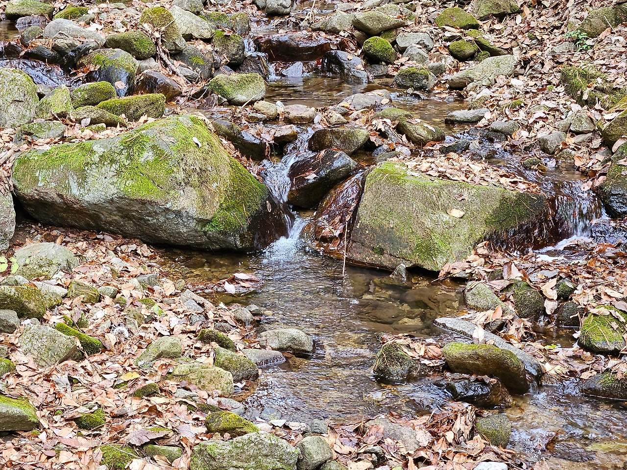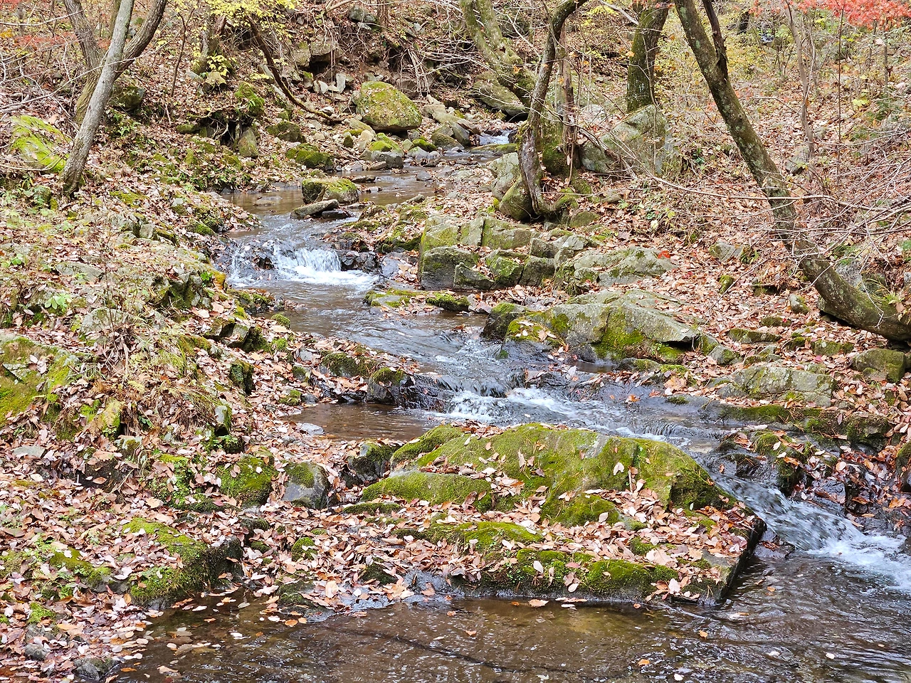 다시 휴양림 아래쪽으로 내려왔다. 우리 곁에는 경쾌한 소리를 내며 흐르는 작은 계곡물이 있었다. 여름에는 수량이 꽤 많았는데 가을에는 조금 줄어든 느낌이었다. 하지만 중간중간 물이 모여있는 곳에는 남성스러운 계곡의 풍모를 보여주며 경쾌한 물소리를 만들어내고 있었다. 사실 휴양림 주변으로 높은 봉우리가 병풍처럼 둘러싸고 있고 아홉 갈래의 계곡인 산음천을 따라 맑은 물이 풍부하게 흐르고 있었다.