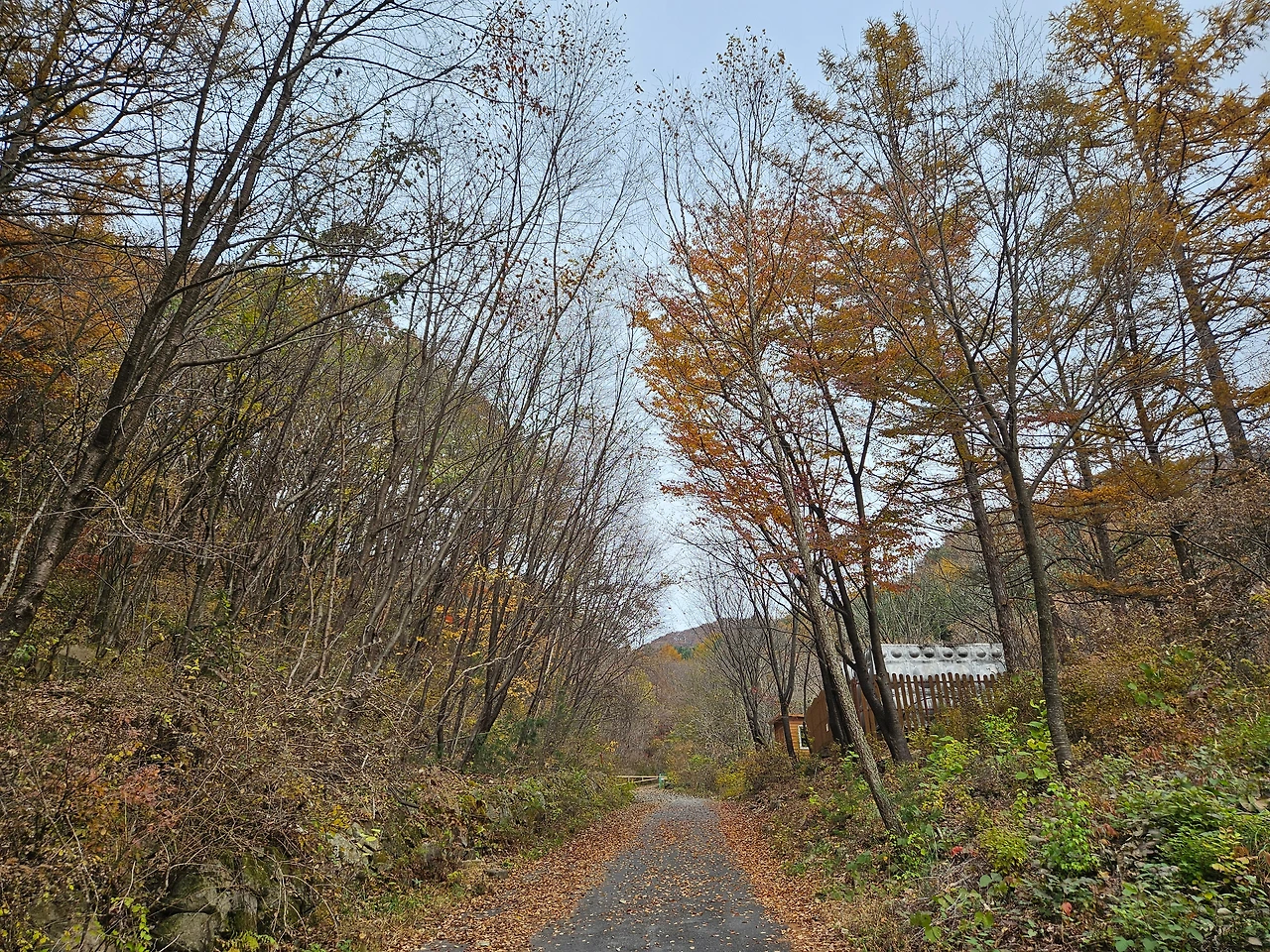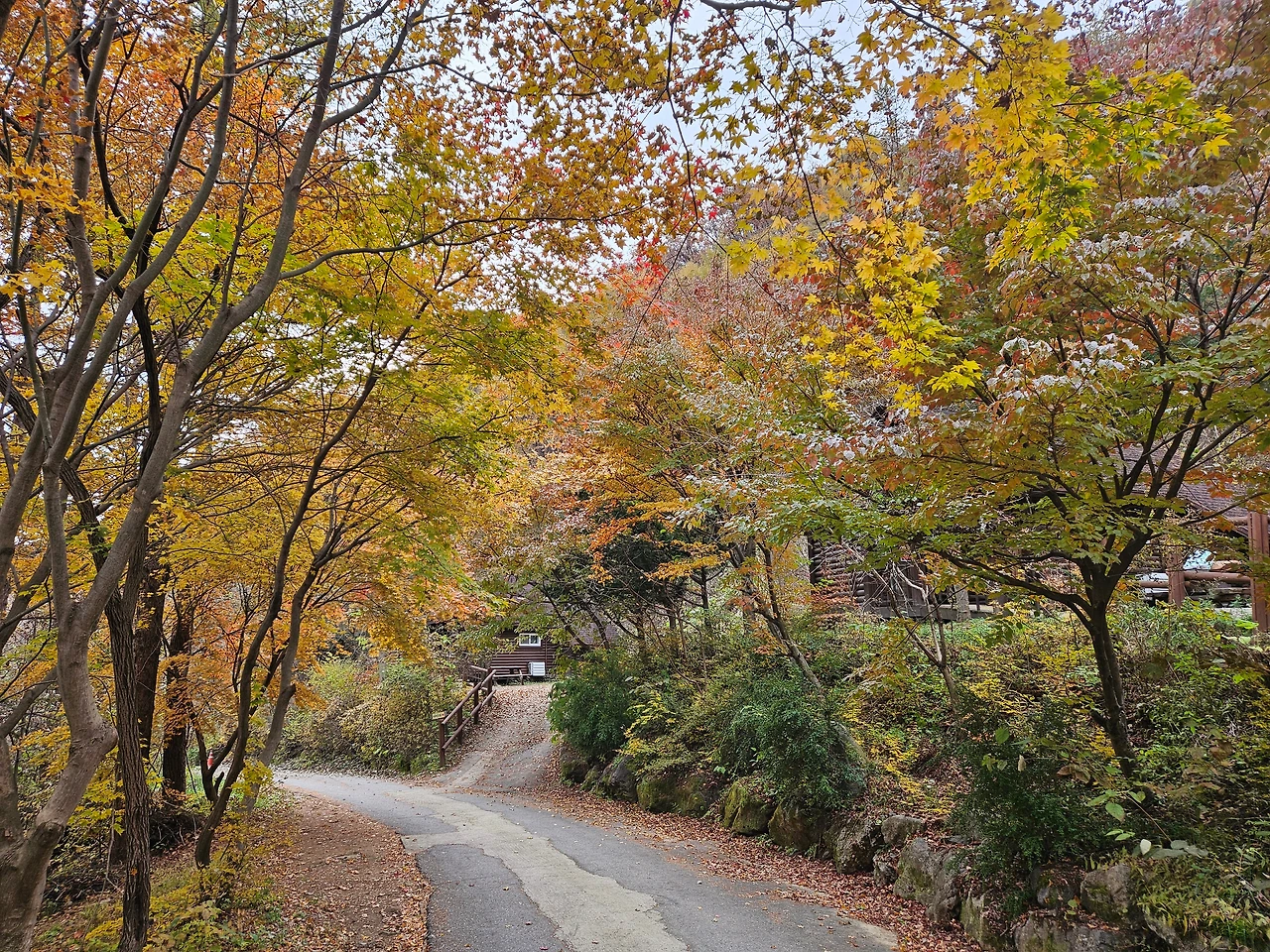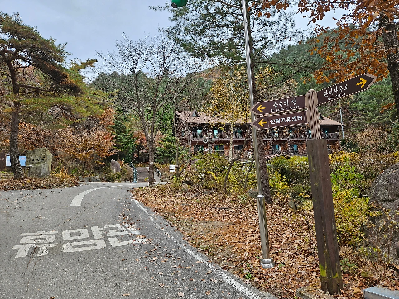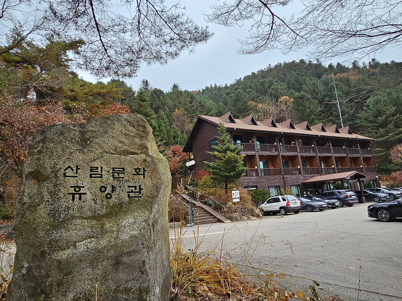 산음 자연휴양림은 서울에서 차를 타고 약 1시간 30분 정도 걸린다. 양평을 지나서 홍천 비발디파크 가는 길에 있는데, 가는 길에 굽이굽이 산을 넘어야 한다. 경기도의 오지 중에 오지가 바로 산음 자연휴양림이다. 산음이라는 명칭은 '산그늘'이라는 뜻으로 폭산, 봉미산, 소리산, 싸리봉 등의 준봉들이 사방으로 둘러싸고 있어 항상 산그늘에 있다 해서 붙여진 지명이다. 산음리를 지나니 다양한 캠핑장과 키즈 풀빌라 등이 눈에 들어왔다. 풍광이 수려하고 계곡물이 맑아서 다양한 여가시설이 들어선 듯했다. 좁은 시골길을 10여분 달리니 오늘의 종착지인 산음 자연 휴양림 입구에 도착했다. 사실 오늘은 숙소 예약을 하지 못한 상황. 가을이라서 그런지 예약하기가 쉽지 않았다. 대신 휴양림 산책을 하면서 가을을 즐기고 싶었다.