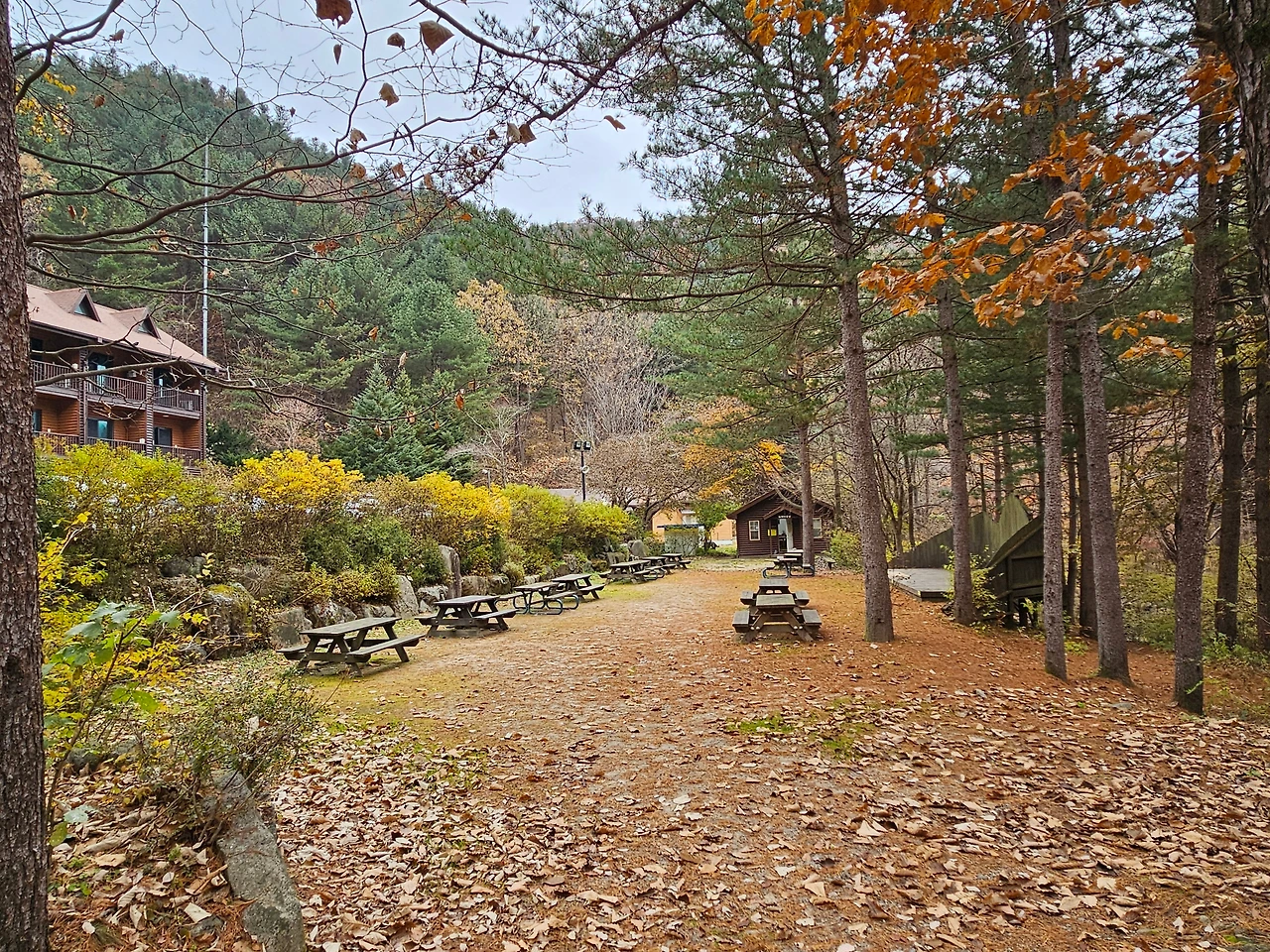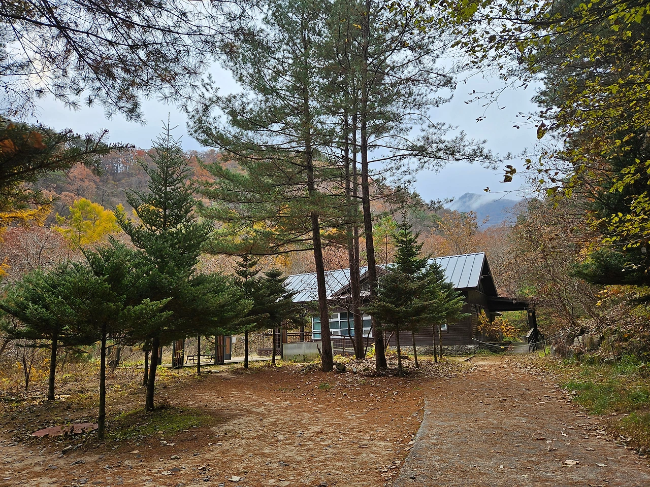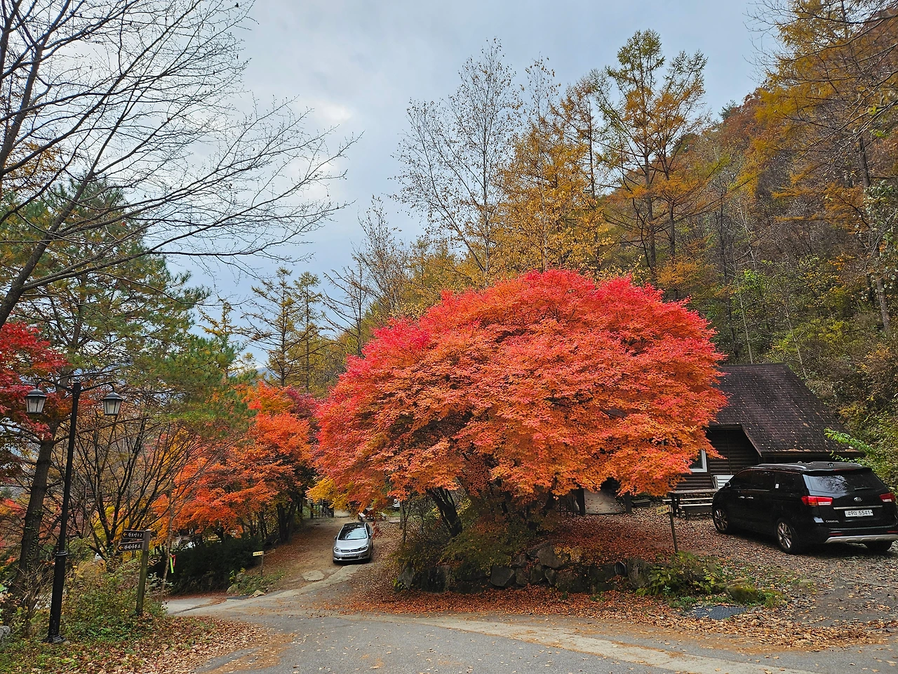 휴양림계곡을 따라 내려오니 야영장이 나타났다. 제법 추워진 날씨로 야영객의 모습은 보이지 않았지만 이곳 야영장은 잣나무와 전나무, 낙엽송, 자작나무 사이로 깔끔하게 정돈되어 있었다. 특히 야영장 편의시설 앞으로 펼쳐진 단풍 한그루. 화려한 가을을 담은 붉은색 옷을 자랑하고 있었는데 우리의 시선을 완전히 빼앗아버렸다. 전나무와 어우러진 모습이 한 폭의 그림 같았다. 가을이 아니면 볼 수 없는 최고의 풍경이었다.
