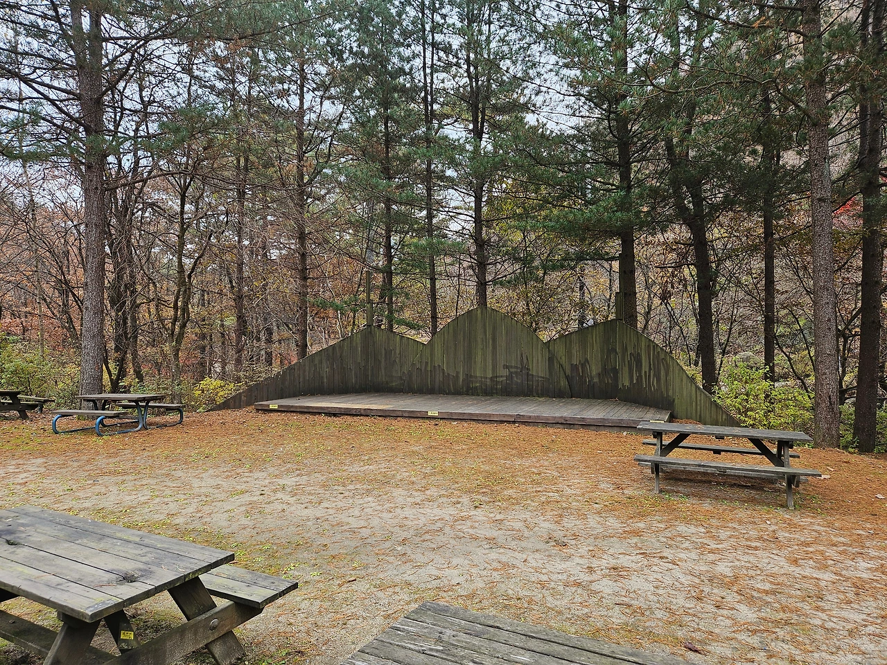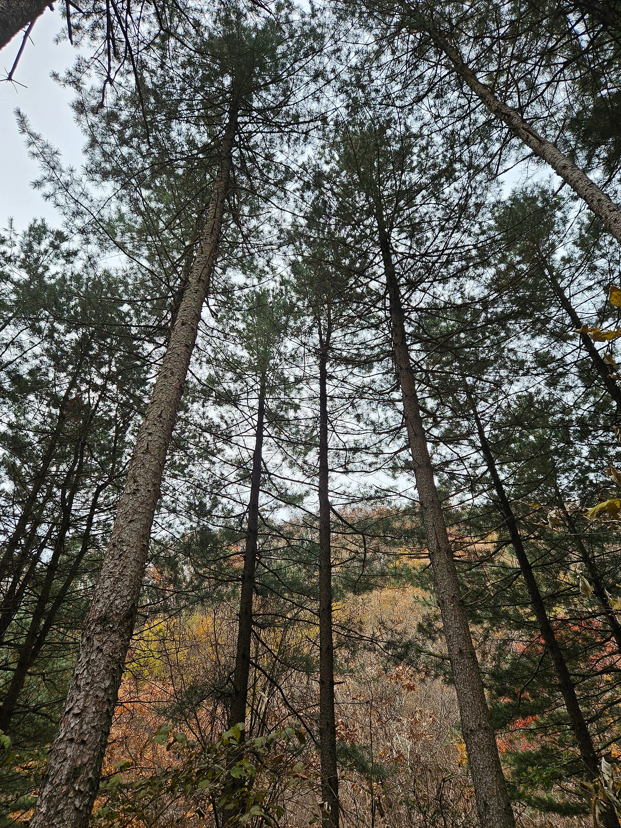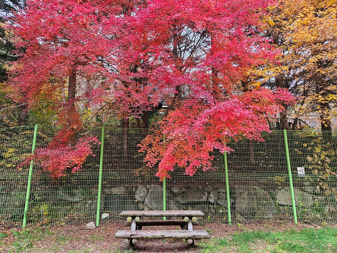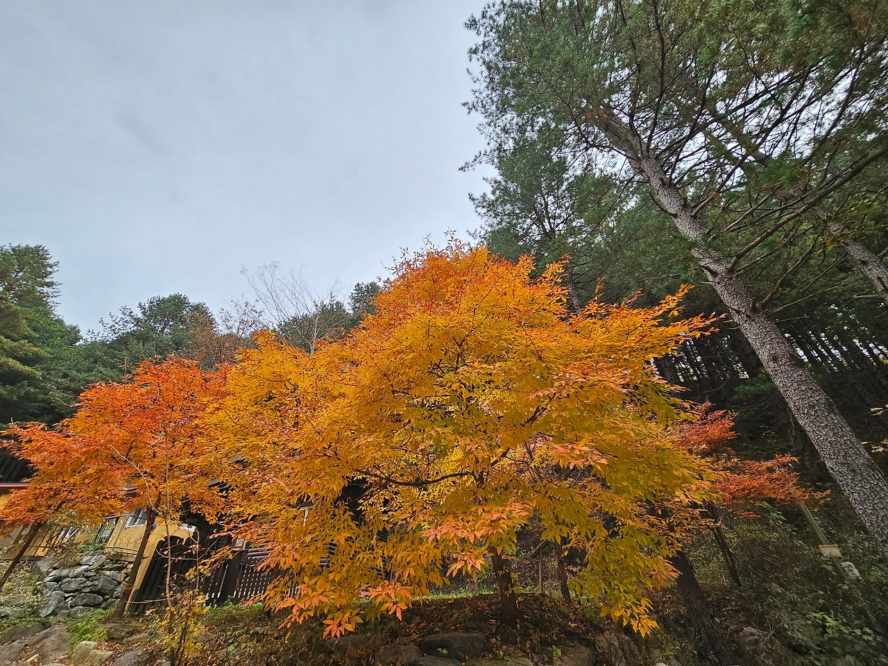 휴양림계곡을 따라 내려오니 야영장이 나타났다. 제법 추워진 날씨로 야영객의 모습은 보이지 않았지만 이곳 야영장은 잣나무와 전나무, 낙엽송, 자작나무 사이로 깔끔하게 정돈되어 있었다. 특히 야영장 편의시설 앞으로 펼쳐진 단풍 한그루. 화려한 가을을 담은 붉은색 옷을 자랑하고 있었는데 우리의 시선을 완전히 빼앗아버렸다. 전나무와 어우러진 모습이 한 폭의 그림 같았다. 가을이 아니면 볼 수 없는 최고의 풍경이었다.