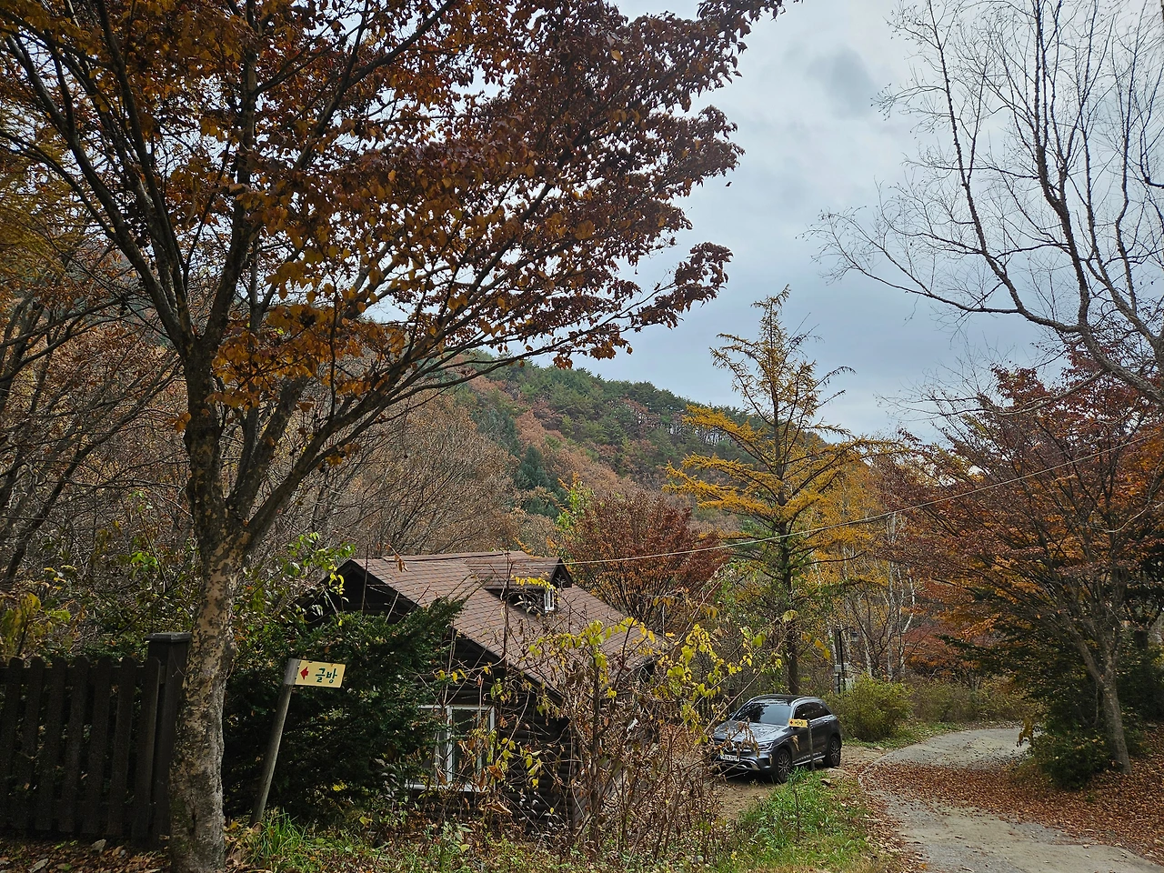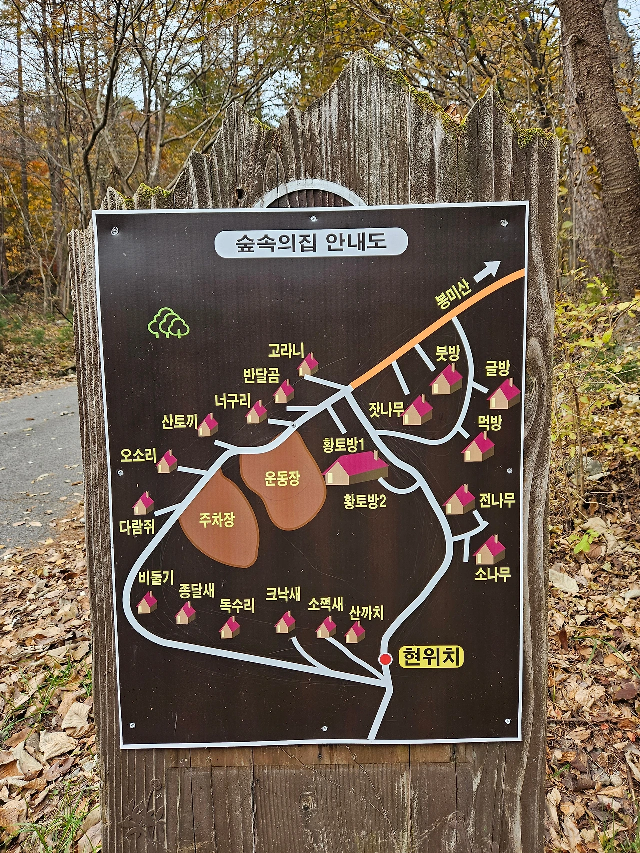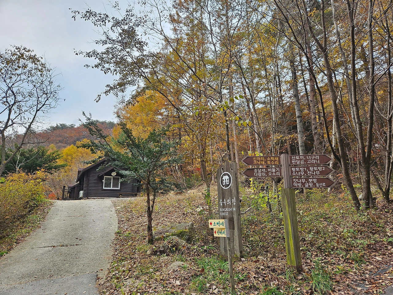 부릉부릉 살짝 가파른 오르막길을 오르니 숲 속의 집이 옹기종기 모여있는 작은 마을이 나타났다. 안내판을 보니 상당히 많은 숲 속의 집들이 산음자연휴양림에 있었다. 입구 쪽은 대부분 3인실이었다. 산까치동과 소쩍새동, 크낙새동, 독수리동, 종달새동, 비둘기동이 나란히 줄지어 있었다. 노랗게 물든 나무들이 이들 숲 속의 집들을 감싸 안고 있었다.