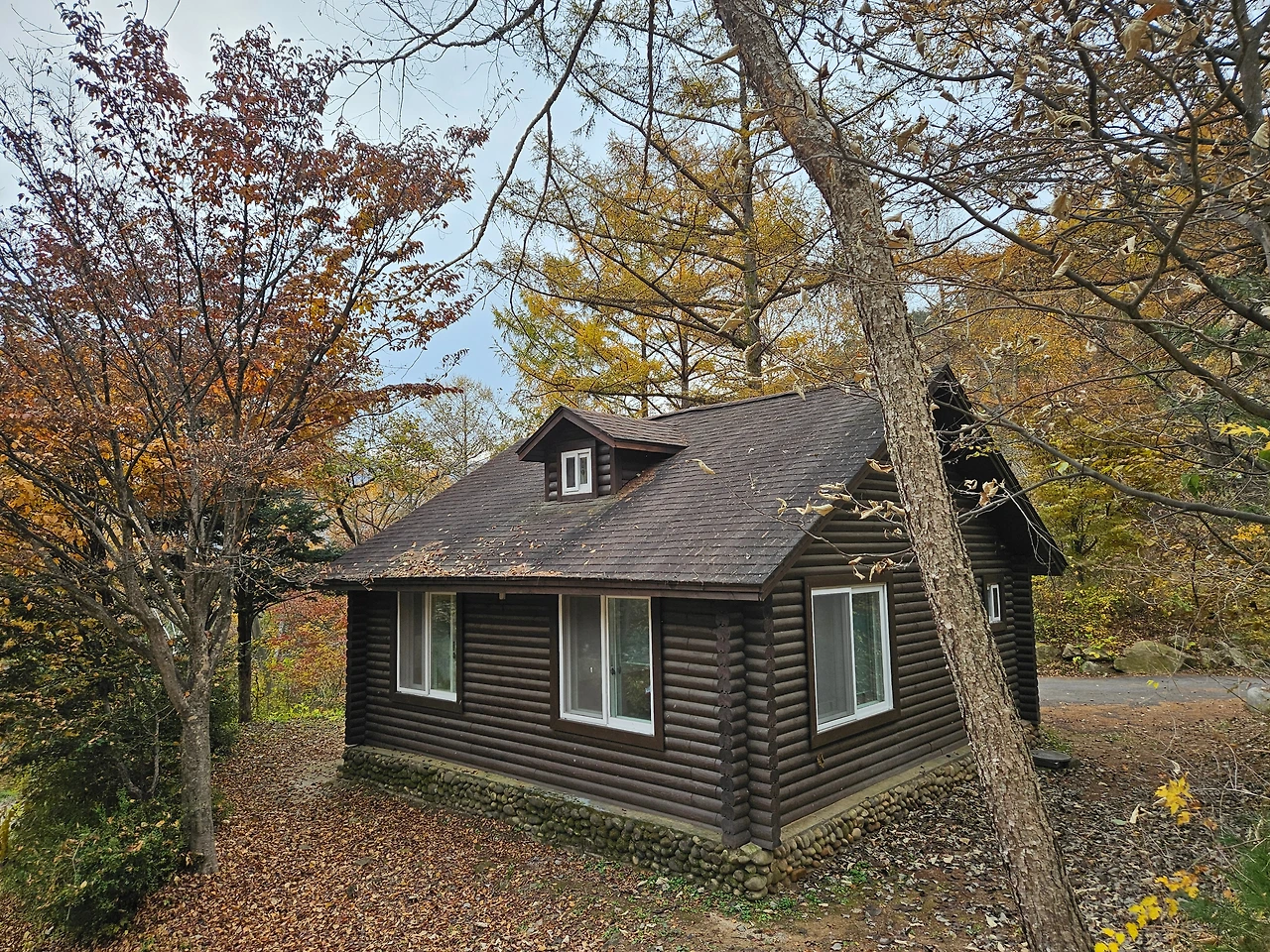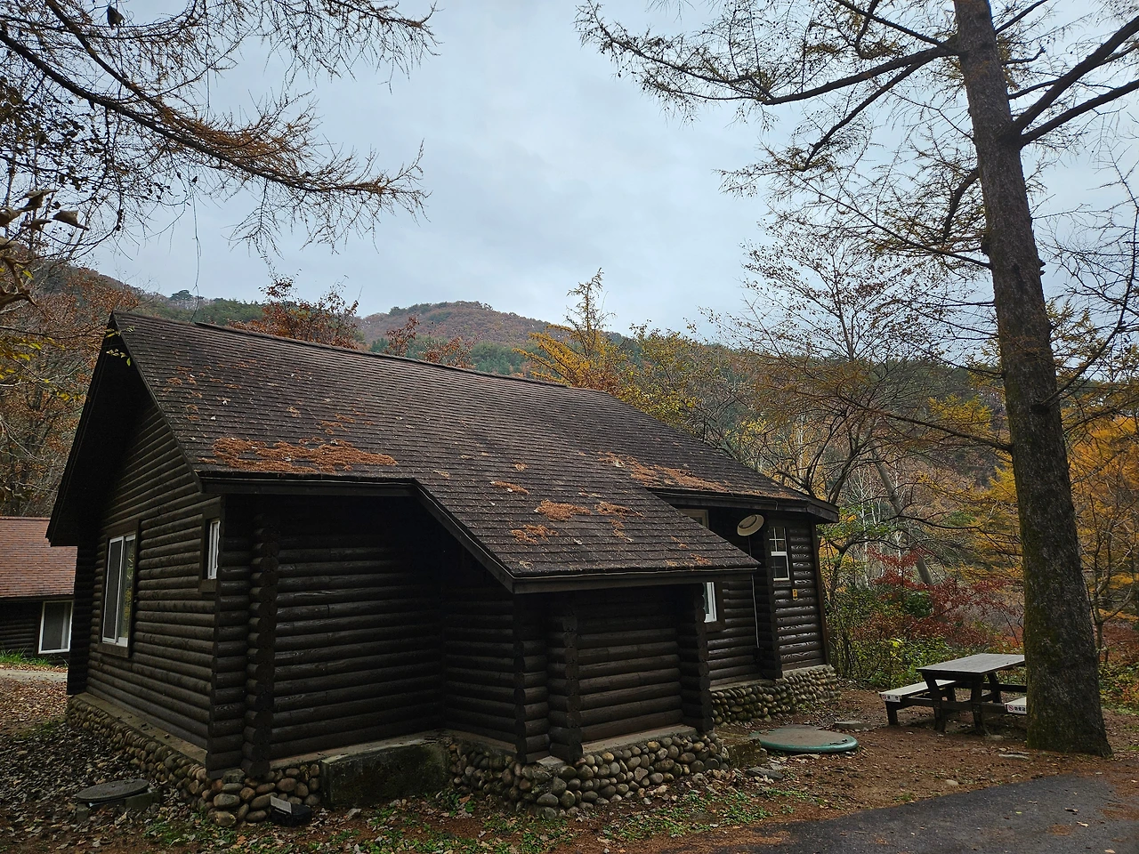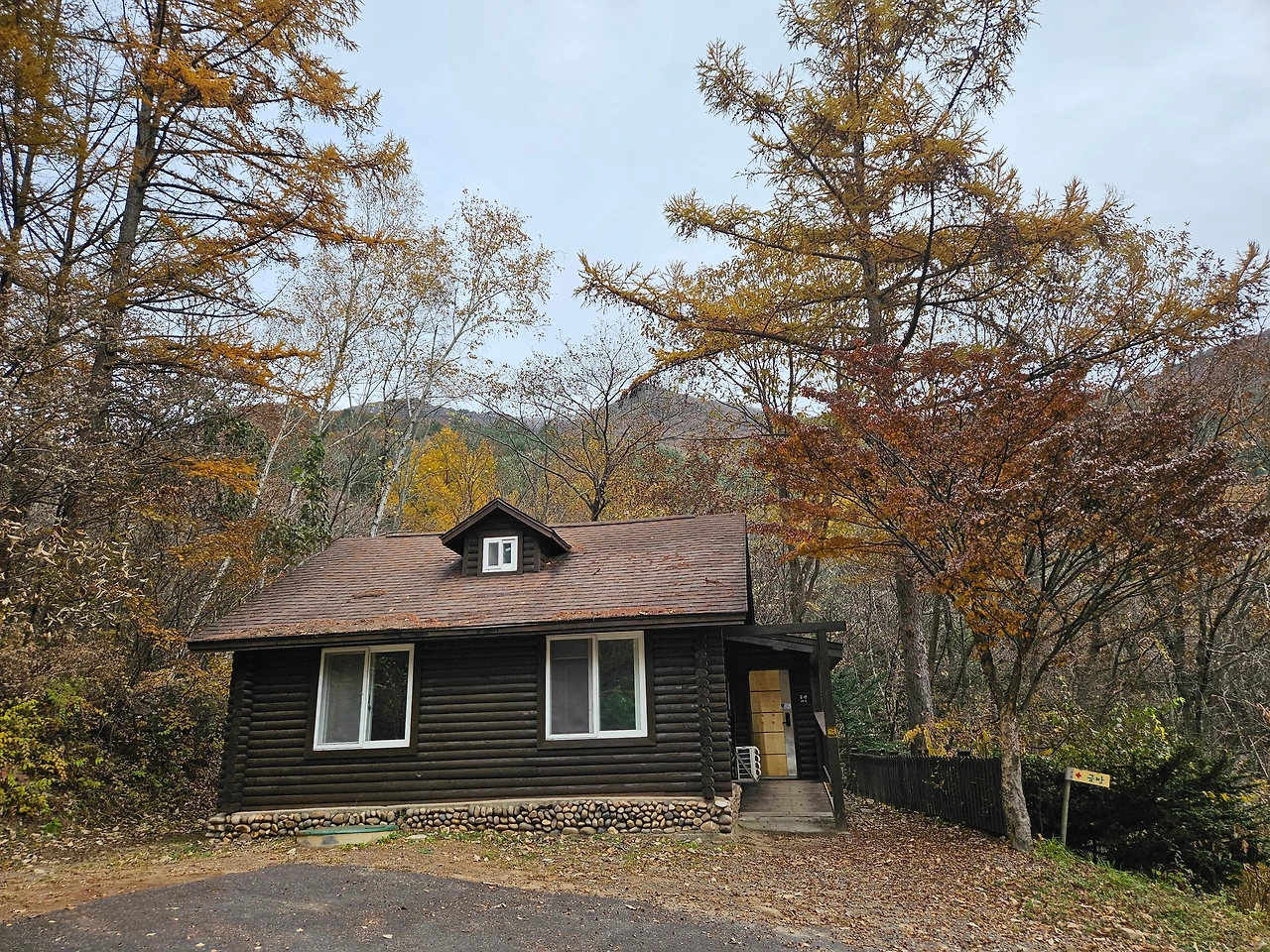 부릉부릉 살짝 가파른 오르막길을 오르니 숲 속의 집이 옹기종기 모여있는 작은 마을이 나타났다. 안내판을 보니 상당히 많은 숲 속의 집들이 산음자연휴양림에 있었다. 입구 쪽은 대부분 3인실이었다. 산까치동과 소쩍새동, 크낙새동, 독수리동, 종달새동, 비둘기동이 나란히 줄지어 있었다. 노랗게 물든 나무들이 이들 숲 속의 집들을 감싸 안고 있었다.