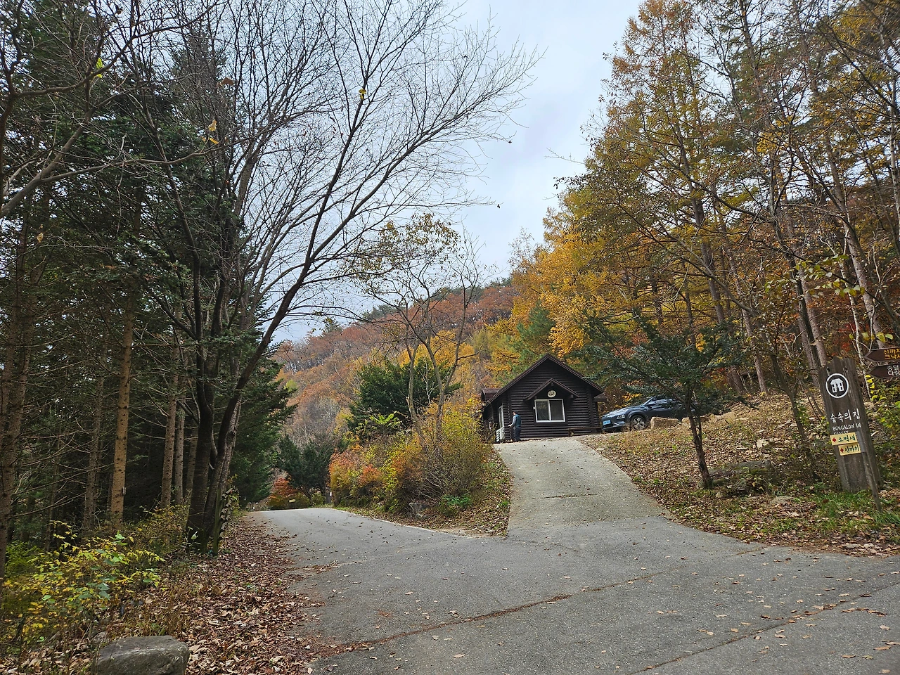 티켓을 끊고 조금 안쪽으로 들어가니 산음 자연휴양림은 완연한 가을 세상이었다. 형형색색으로 물든 단풍나무가 가득했고, 여기저기에서 갈색으로 물든 낙엽들이 바람에 날리고 있었다. 숲 내음도 신록이 아닌 낙엽향 가득한 가을 냄새가 채우고 있었다. 졸졸졸 흐르는 계곡을 건너니 휴양관이 나왔다. 휴양관 앞에는 가을을 즐길 수 있는 몇 개의 테이블과 함께 공연장도 있었다. 그 뒤에는 목공예를 할 수 있는 숲체험장도 있었는데 이미 몇몇 아이들은 체험장 안에서 목공예를 즐기고 있었다. 안내판을 둘러보니 숲 속의 집들은 휴양림 깊은 곳에 위치하고 있었다. 차를 돌려서 휴양림의 깊숙한 곳으로 들어가 보았다.