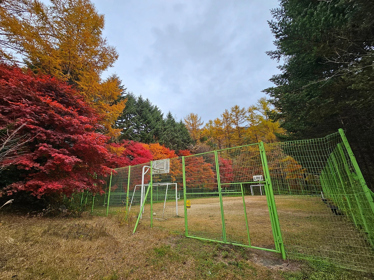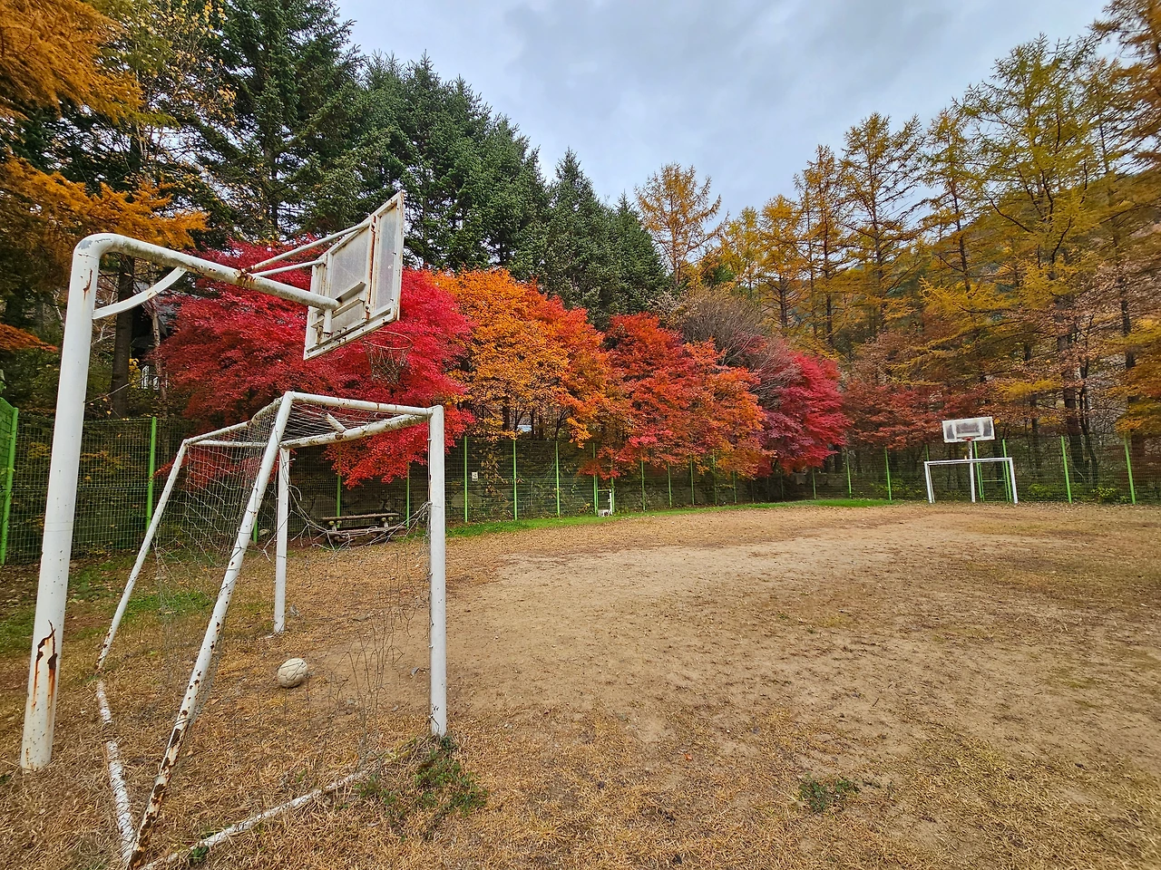 숲 속의 집 중간쯤에 작은 운동장이 있었다. 농구장과 축구장이 있는 공간이었는데 이곳이 바로 가을 운동장이었다. 형형색색 가득한 화려한 나무들 속에 아담하게 놓인 작은 운동장이었다. 나와 아내는 이곳에 벤치에 잠시 앉아서 따뜻한 캔커피 한 잔을 마셨다. 하늘을 보면서 마시는 따뜻한 커피 한 잔의 여유. 마치 영화 속의 주인공이 된 듯한 느낌이었다. 우리만의 소확행이었다.