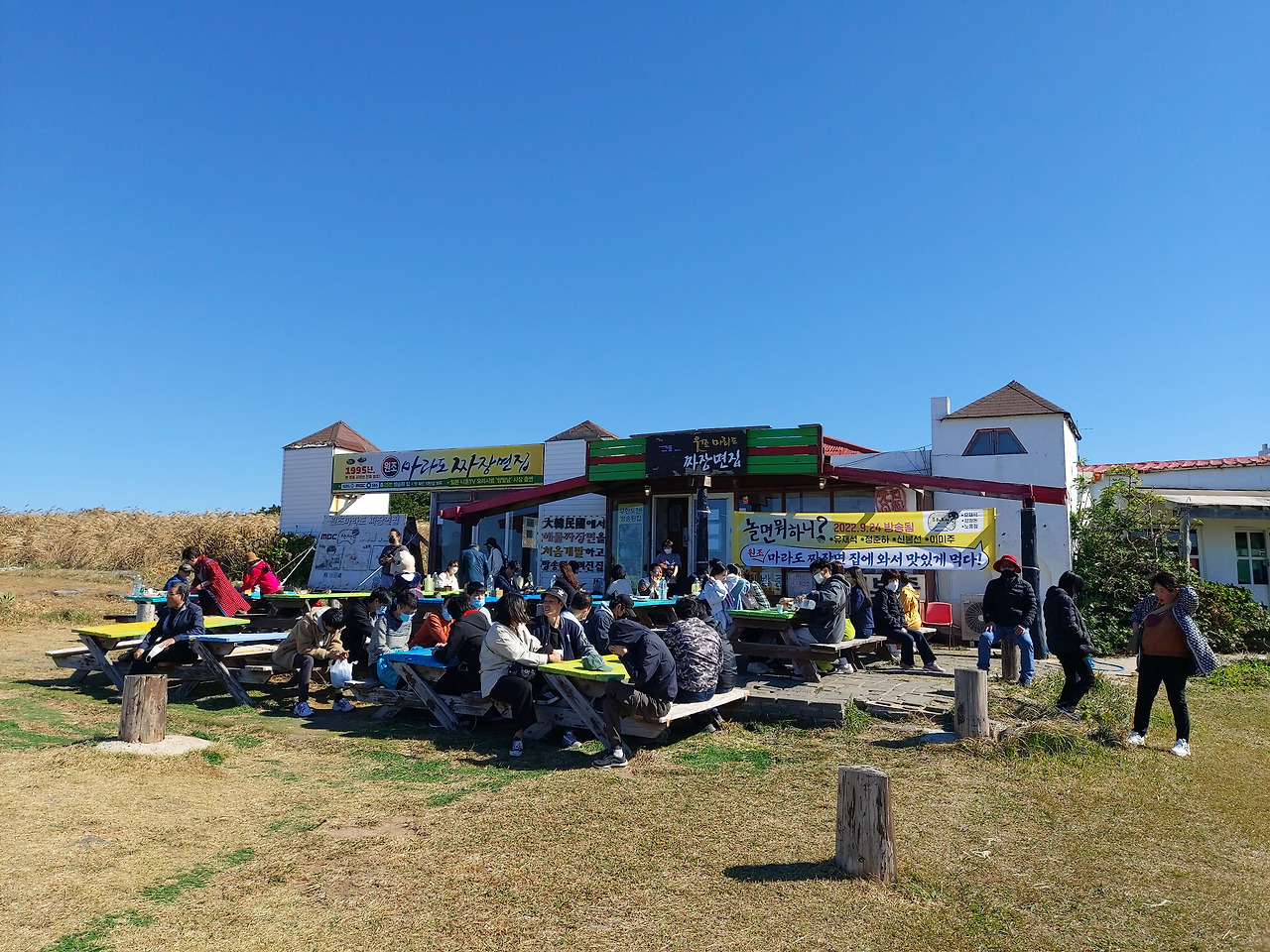 우리의 마라도 첫 번째 목적지는 짜장면 가게였다. 20여 년 전 이동통신 광고에서 '짜장면 시키신 분!'이라는 카피로 유명했던 마라도. 최근에는 무한도전, 놀면 뭐하니 등에서 이곳에 짜장면을 먹기 위해 찾으면서 대한민국 짜장면 성지로 마라도가 떠오르고 있었다. 이런 이유 때문인지 마라도 대부분의 식당에서는 짜장면을 팔고 있었다. 최근 방송에서 나왔던 그 집을 찾았다. 바람도 잔잔했고, 햇살도 따뜻해서 야외에서 아내와 아들과 함께 고대했던 마라도 짜장면을 싹싹 비벼서 입 안에 넣었다. 톳과 해물이 올려진 해물 짜장면. 그 맛은 특별했다. 옛날 짜장의 맛과 바다의 향이 그대로 느껴졌다. 아이도 맛있다는 표정으로 엄지 손가락을 치켜세웠다. 마라도에 온다면 꼭 짜장면을 먹기를 추천한다. 다만 사람이 많다면 이거 먹느라고 배편을 놓칠 수 있으니 유의해야 한다.