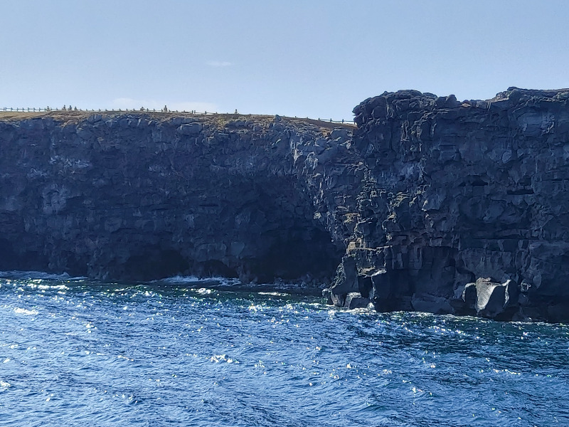 10시 30분! 운진항에서 배를 타고 대한민국 최남단 마라도로 향했다. 다행히 파도도 잔잔했고, 하늘도 맑았다. 근데 아이가 처음 배를 타서 상태가 좋아 보이지 않아 보였다. 속이 좋지 않다고 하니 약간의 뱃멀미 증상이 있어보였다. 살짝 품에 앉고 아이 안정을 시켰다. 사실 파고가 조금만 높으면 일부 사람들이 멀미를 한다고 하니 사전에 준비가 필요해 보였다. 배가 떠난지 10여 분이 지나서 왼쪽으로 가파도가 보였고, 20분 정도가 지나니 우리의 목적지 마라도가 눈앞에 나타났다. 마라도는 운진항에서 남쪽으로 11km 떨어져 있었다. 배를 타고 약 30분 정도면 도착할 수 있었다. 선착장 근처의 거대한 해식동굴과 웅장한 검은 절벽이 우리를 맞아주었다.