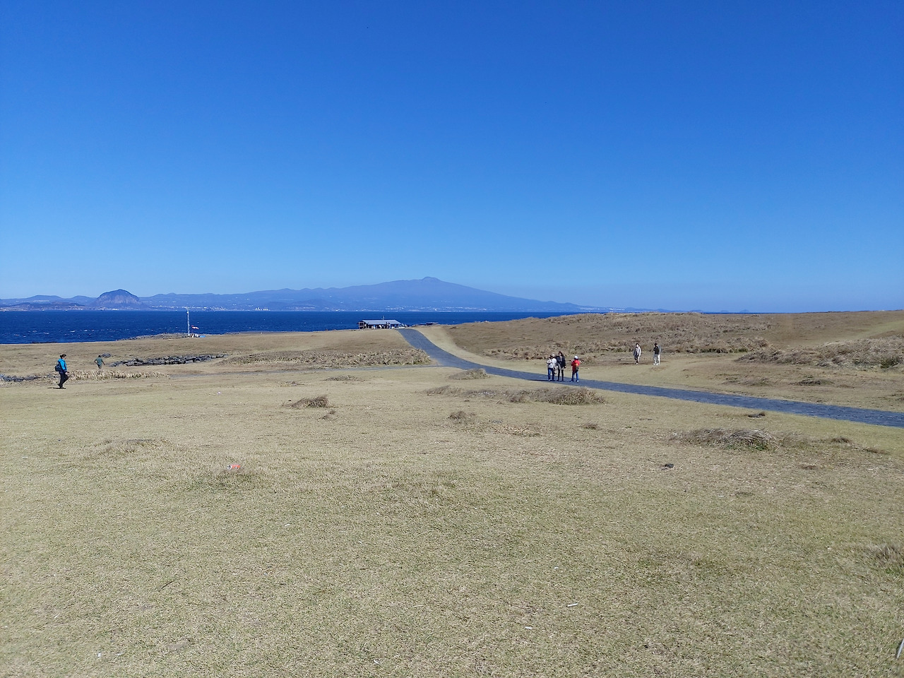 마라도 들판과 바다 건너 멀리 보이는 한라산