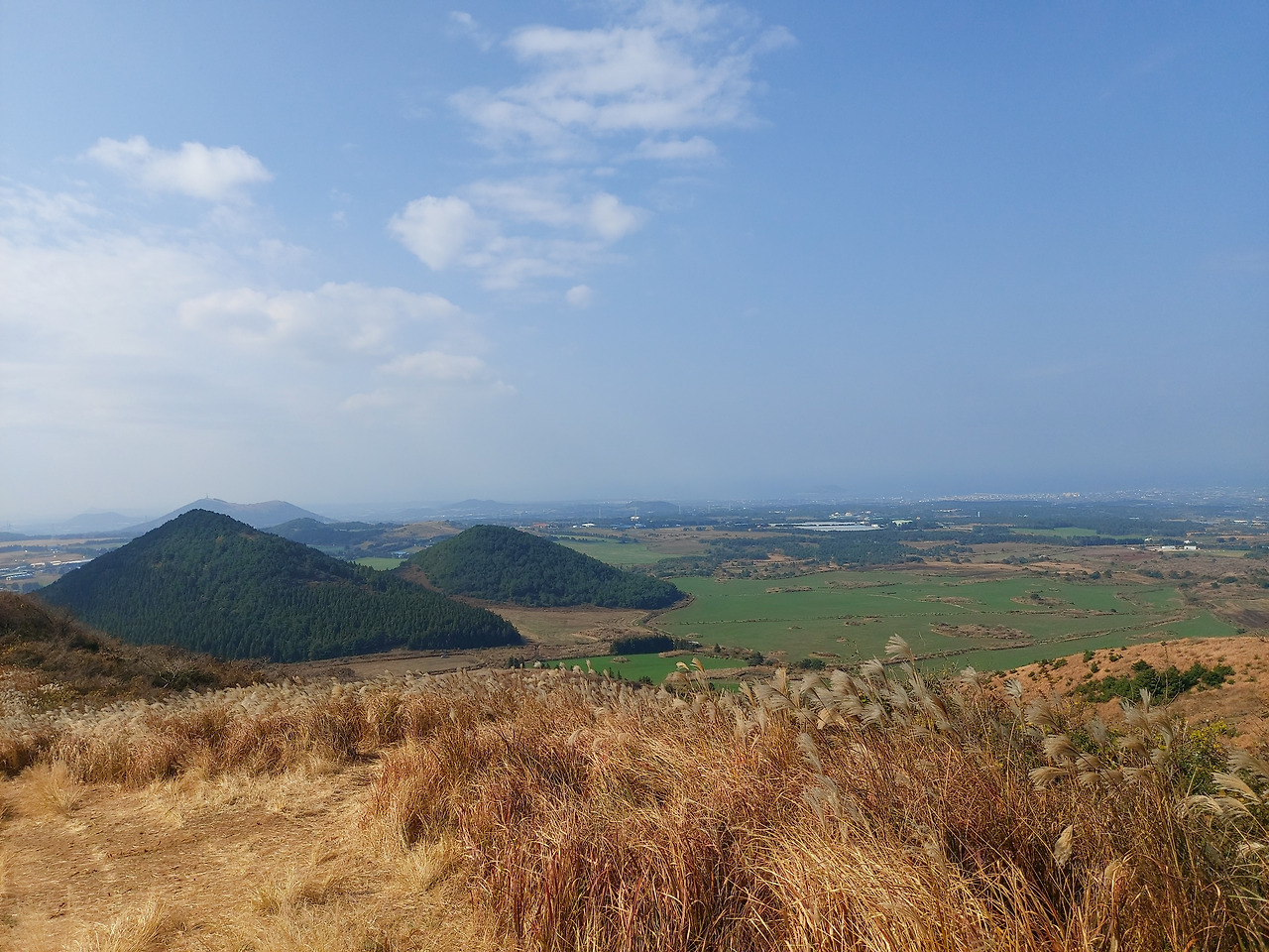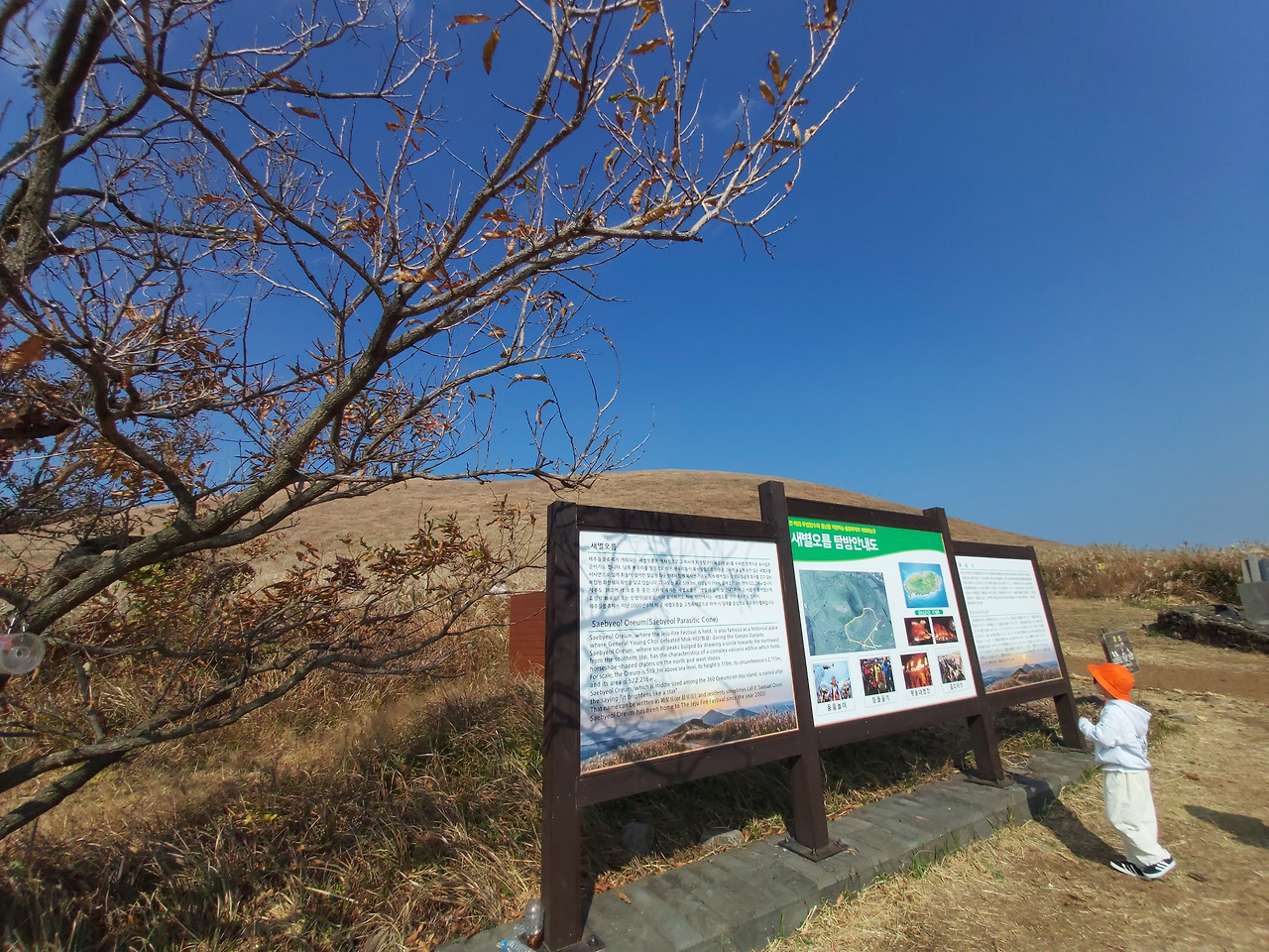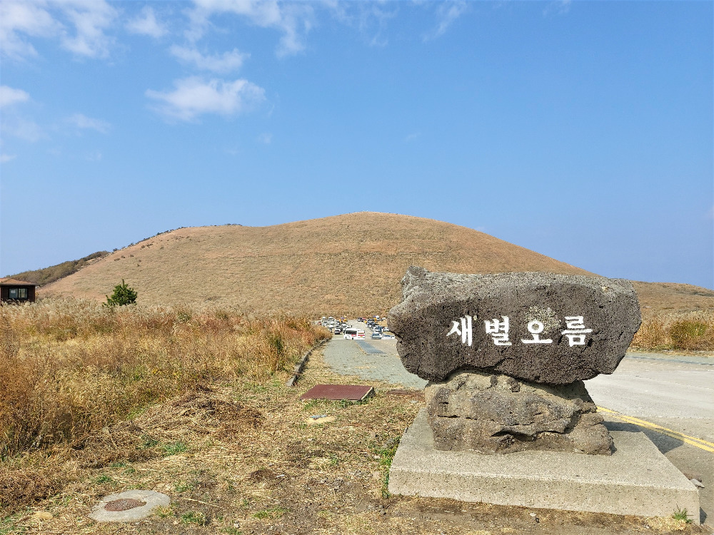 우리 숙소에서 새별오름까지는 1시간 정도가 걸렸다. 예상대로 날씨가 조금 더워서 11월에 차량의 에어컨을 켜고 목적지로 향했다. 애월을 지나서 중산간지역으로 들어가니 눈앞에 거대한 오름 하나가 눈에 들어왔다.