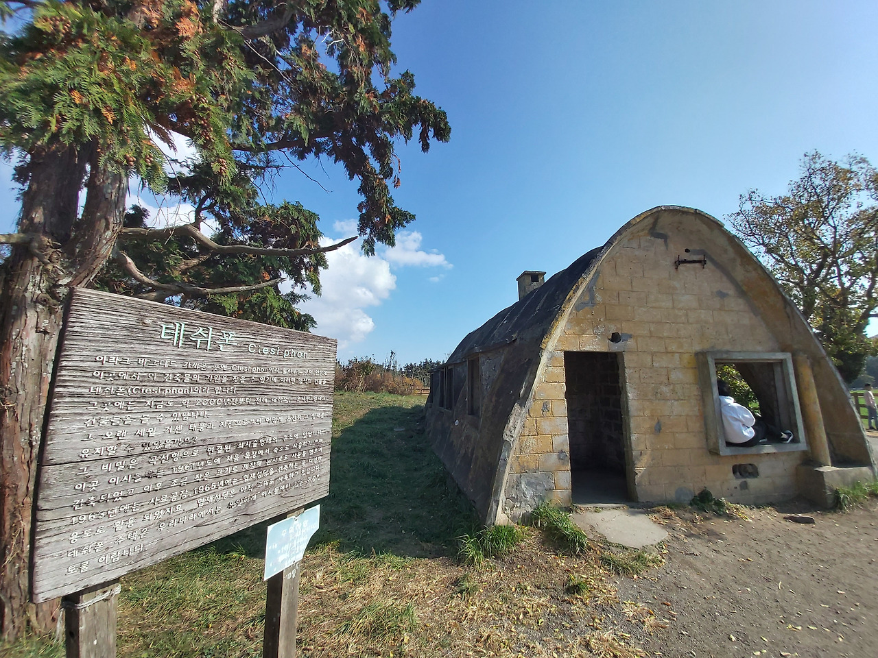 이럴 때마다 제주도에 잘 왔다는 생각이 절로 들었다. 그냥 앉아만 있어도 행복했다. 아무 걱정도 없었다. 잠시 휴식을 취하고 살짝 산책을 했다. 주변에는 테쉬폰이라는 특이한 건축물 하나가 있었는데, 이라크 바그다드 인근 지역의 건축물 양식으로 만들어진 것이라고 했다. 이 건물은 1961년 성이시돌 목장에서 숙소로 사용하기 위해 만들었고, 나중에서 돼지 사육을 위해 활용했으며 지금은 멋진 사진의 배경으로 활용되고 있었다.