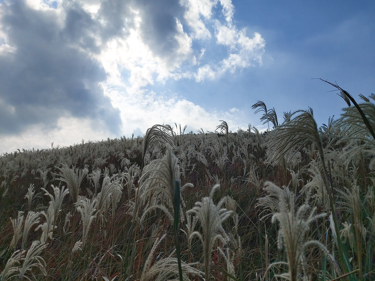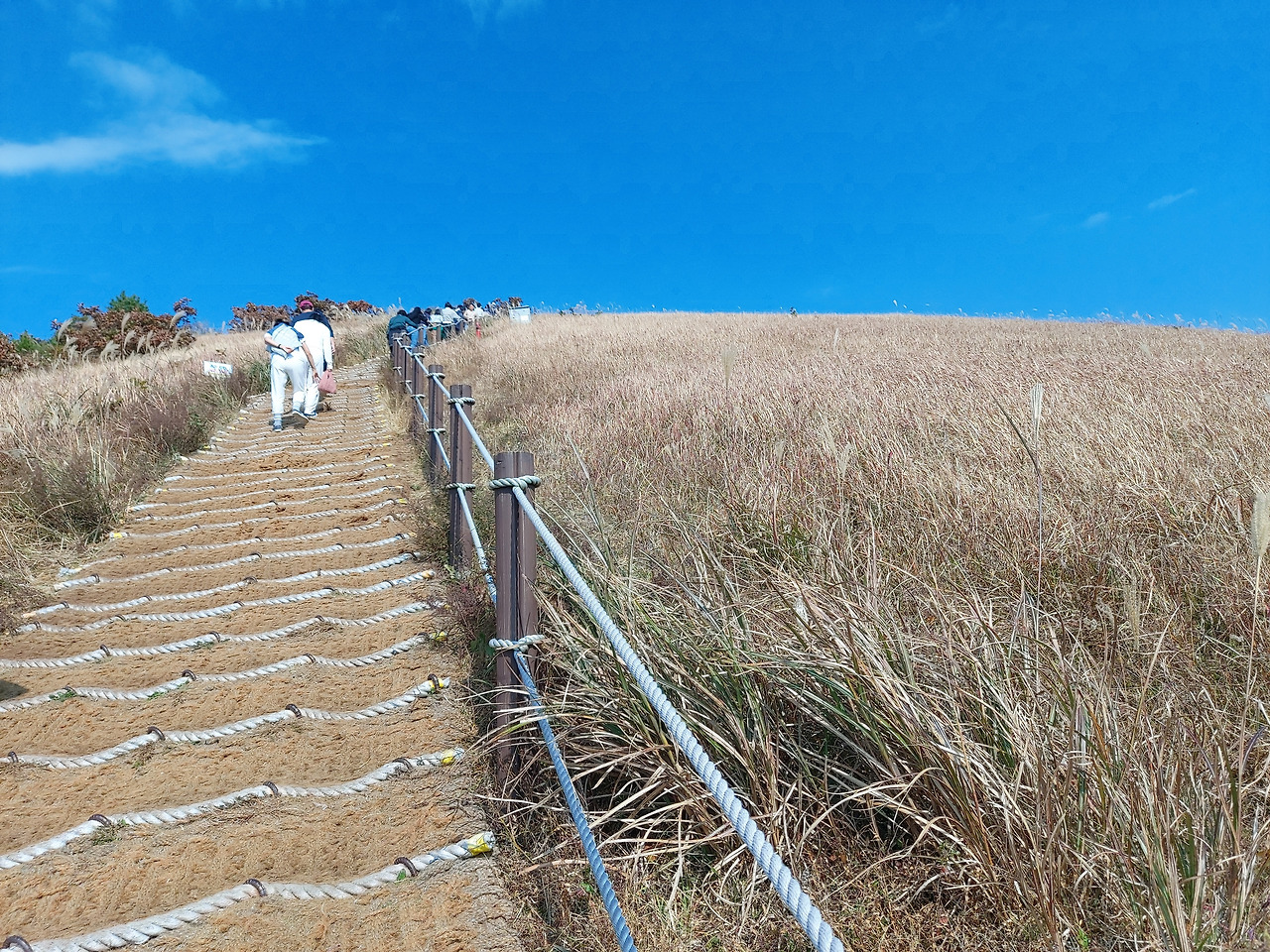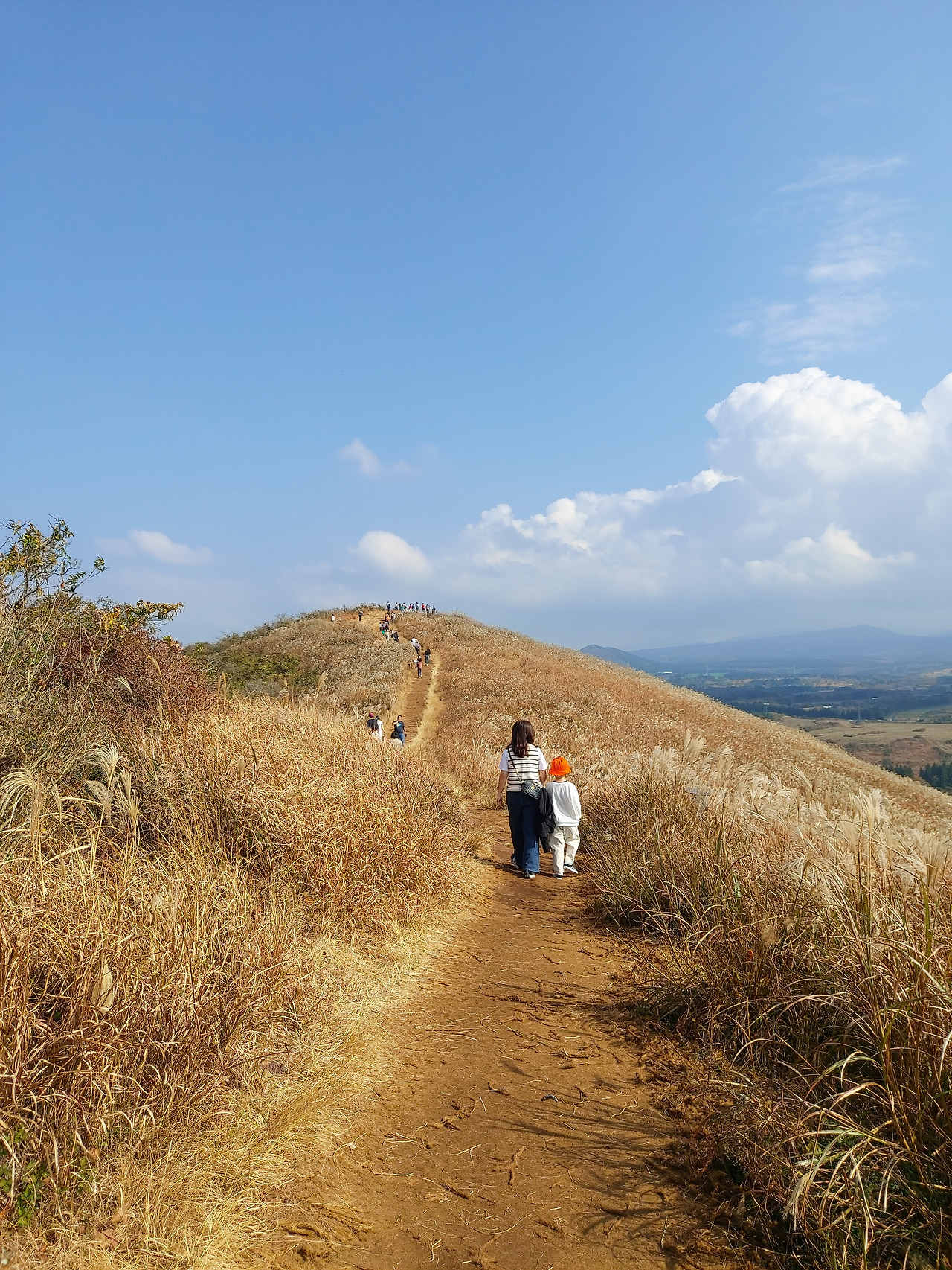 새별오름은 오른쪽과 왼쪽 두 개의 길이 있는데, 왼쪽은 경사가 있지만 짧고, 오른쪽은 조금 길지만 경사도가 조금 완만하다. 우리는 왼쪽으로 가서 오른쪽으로 내려왔지만, 그 반대로 가는 것이 조금 편해 보였다. 내려오는 길은 골프장 뷰로 한결 정결한 풍경이었다. 그리고 오른편으로 억새밭이 펼쳐지는데, 바람이 불 때마다 한 폭의 그림 그 자체였다. 너무나 아름다웠다. 많은 사람들이 억새밭으로 들어가서 사진을 찍느라고 정신이 없었다. 새별오름은 제주도의 가을을 대표하는 장소임이 틀림없었다. 최고였다. 시간이 난다면 아침이나 해 질 녁에도 최고의 산책로라는 생각이 되었다.