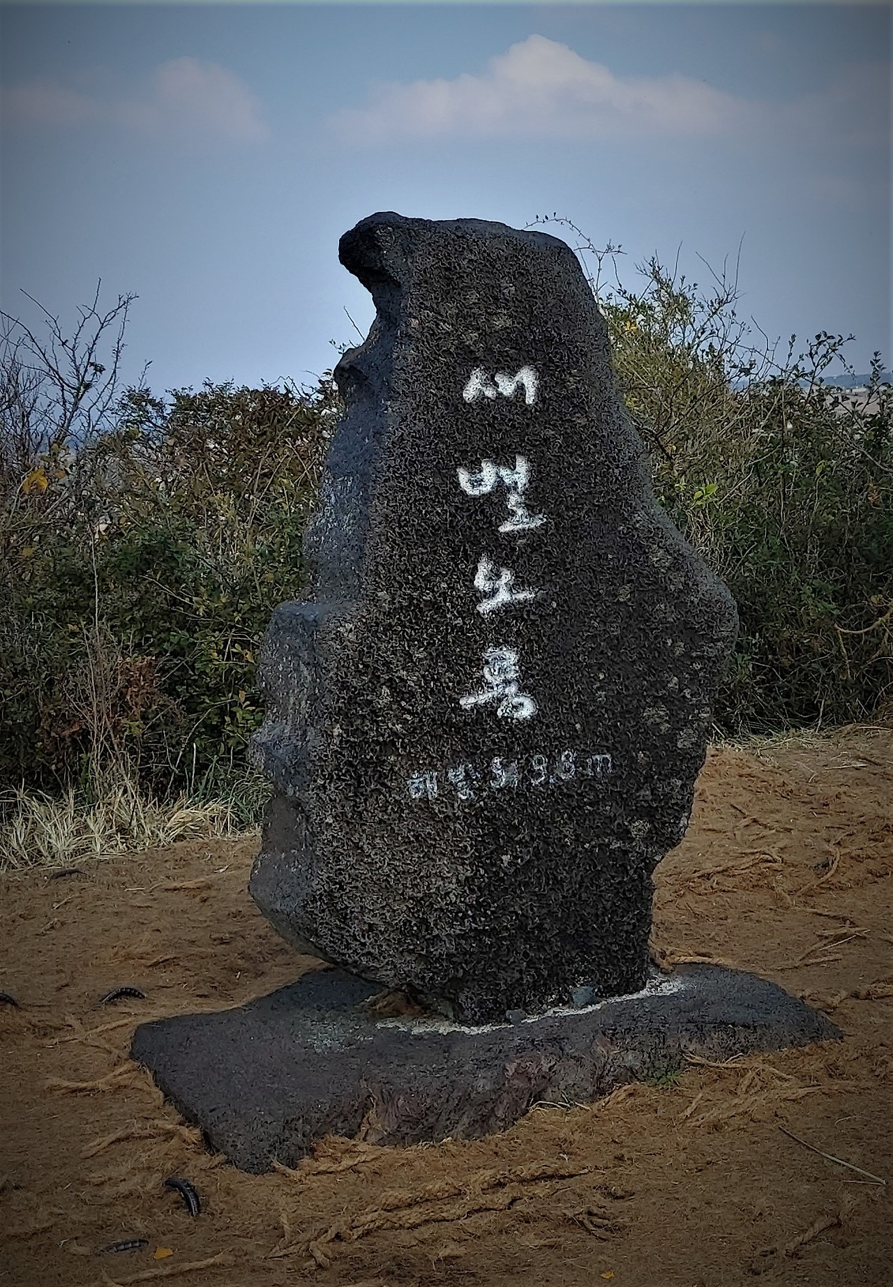 먼저 7살 아들이 오르기 시작했다. 한라산을 가뿐히(?) 오른 초보 산악인답게 아이는 잘도 앞사람들을 따라서 올랐다. 날씨가 예상외로 더웠고 바람도 거의 없어서 땀이 많이 흘렀다. 그리고 작은 벌레들도 상당히 많았기에 살짝 짜증도 났다. 두어 번 휴식을 취한 후에 우리 가족은 정상 능선에 오를 수 있었다. 고개를 돌려 서쪽을 바라보니 오름 몇 개와 바다가 보였고, 동쪽을 바라보니 한라산이 보였다. 하지만 오늘은 구름에 가려서 한라산 정상부가 보이지 않았다. 등선 길을 2분 정도 걸으면 바로 정상이 나왔다. 새별오름 정상석을 배경으로 가족사진을 찍었다. 주위의 멋진 풍경을 즐겼다. 더 있고 싶었지만 배가 고프고 힘들다는 아이의 투정에 바로 하산을 시작했다.