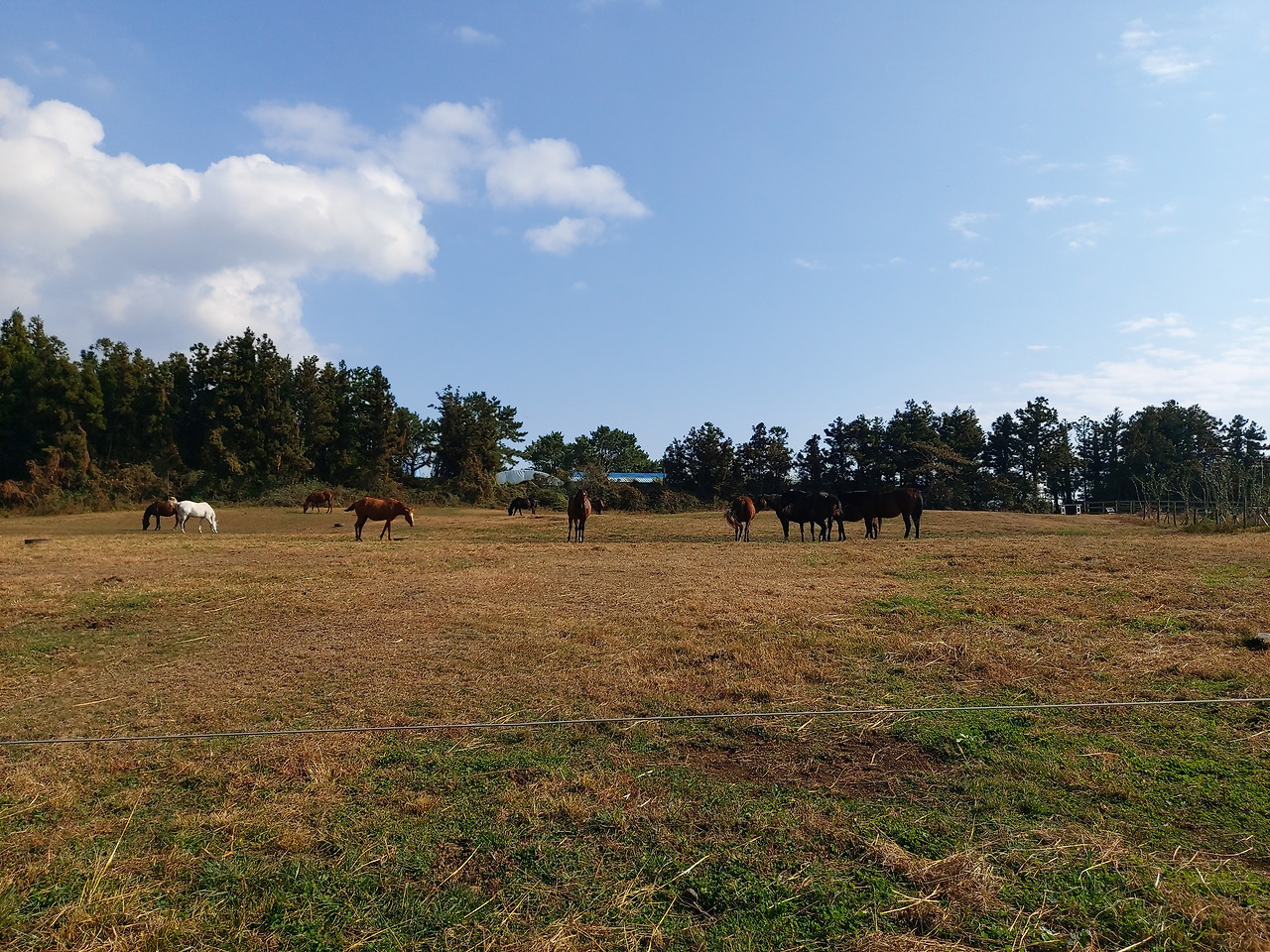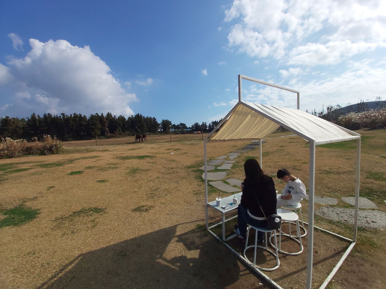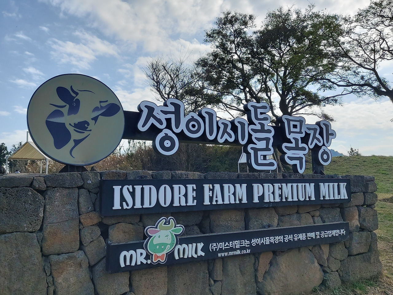 빠르게 나 홀로 나무를 사진에 담고 다음 목적지로 향했다. 우리는 제주도의 대표 목장인 성이시돌 목장으로 향했다. 5분 정도 차량으로 이동하니 주차장이 보였고, 이곳에 차를 세우고 목장으로 들어갔다. 향긋한(?) 자연의 말똥 냄새가 우리를 맞아 주었다. 우선 아들이 배가 고프다고 하여 우유부단이라는 카페로 들어갔다. 신선한 우유와 밀크셰이크 2잔을 사서 밖에 목장이 보이는 예쁜 테이블에 앉았다. 우리는 말들이 뛰어다니는 푸른 목장을 바라보면서 음료를 마셨다. 따사로운 햇살과 푸른 평원이 마치 스위스 목장에 앉아 있는 기분이었다.
