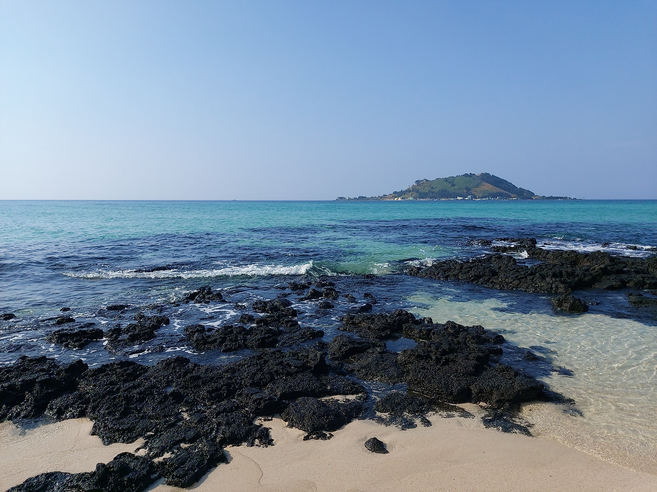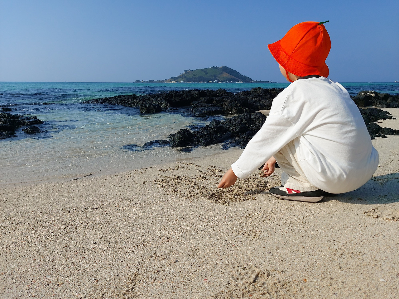 오늘도 역시 우리에게 멋진 풍경을 선물해 주었다. 투명한 물과 에메랄드 빛 바다 색이 우리 가족을 맞아주었다. 우리 아이는 모래사장에 앉아서 모래 놀이를 하기에 여념이 없었다.나와 아내도 저 멀리 비양도를 바라보며 한껏 여유를 즐겼다. 날씨가 더워서일까? 몇몇은 바다에 들어가서 수영을 즐기는 모습도 볼 수 있었다. 23도 정도의 기온이니 충분히 그럴 만도 했다.