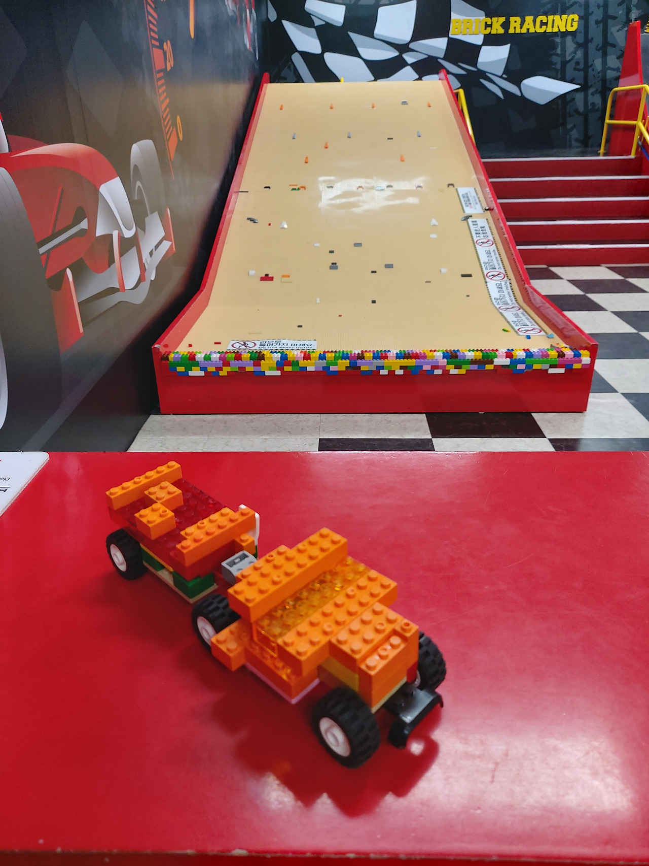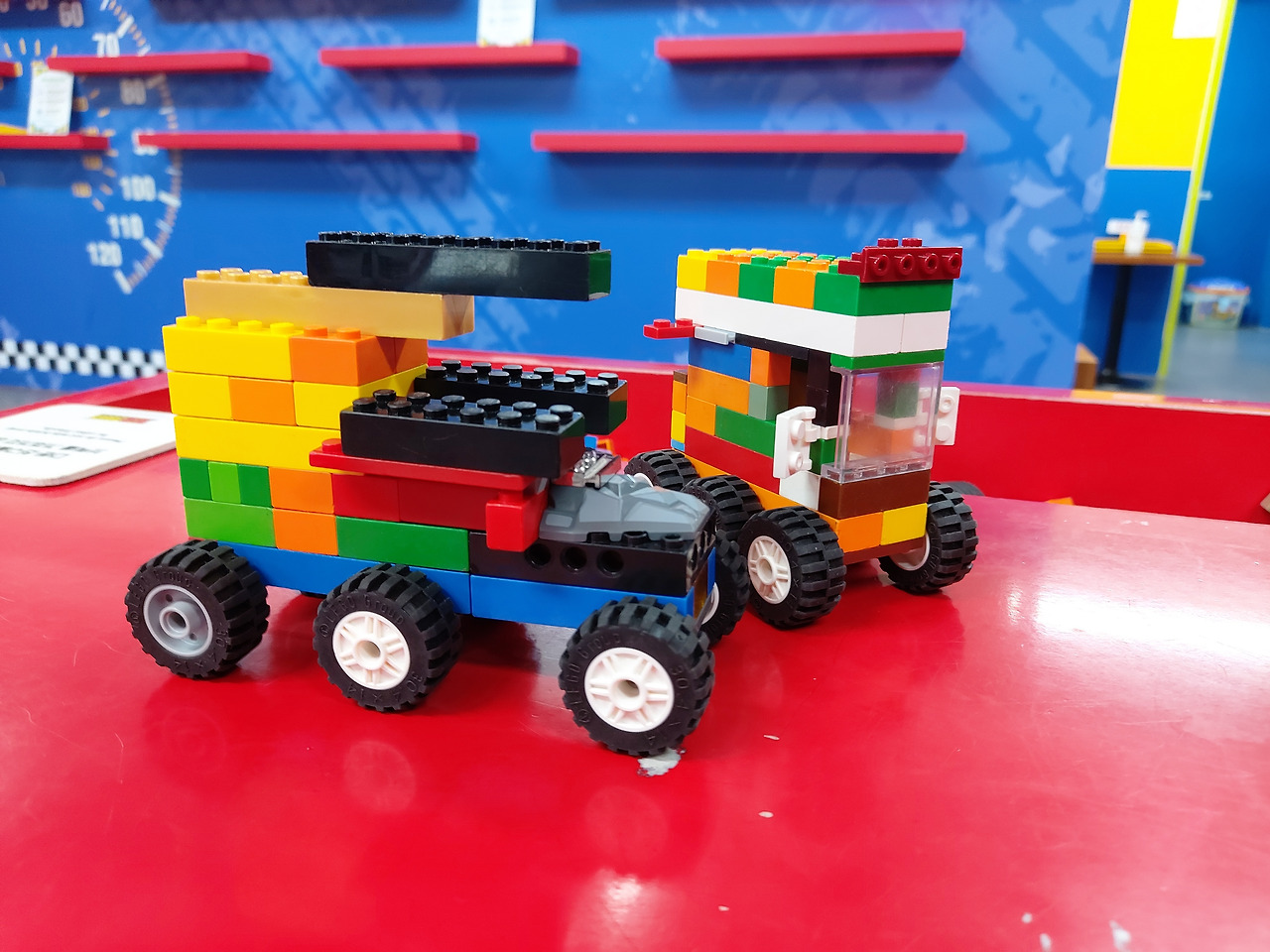 다음으로 2층으로 올라가서 자동차를 만들었다. 가족 3명이 각자의 특성을 살려서 브릭 자동차를 제작했다. 나는 귤을 나르는 6륜형 화물 자동차를 만들었고, 아이와 아내도 아담하고 강건한 자동차를 만들었다. 실제로 굴려보는 테스트를 했는데, 나의 차는 너무 약했는지 무참히 부서졌고, 아들의 차만이 튼튼하게 잘 버틸 수 있었다.