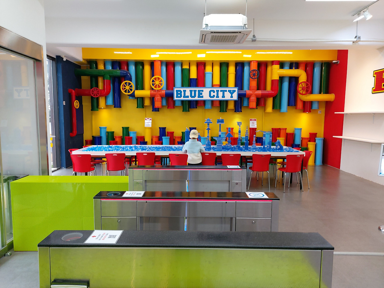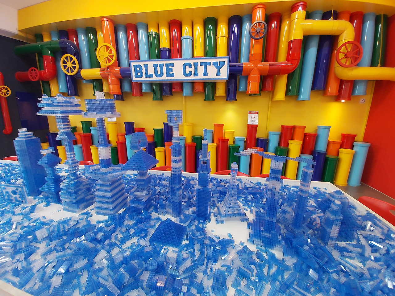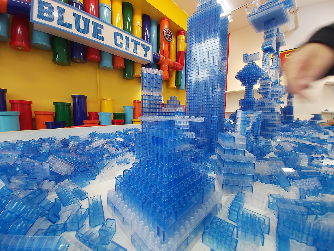 우선 우리 가족은 블루 시티로 가서 푸른색과 투명 브릭으로 건물을 만들었다. 아이는 피라미드 형식으로 창의적인 건물을 만들었고, 나와 아내는 형이상학적인 모양의 도시적인 건물을 만들었다. 자리에 앉아 열심히 건물 모형을 만든 후에 우리 작품도 도시 속 일부가 되어 한 자리를 차지했다.