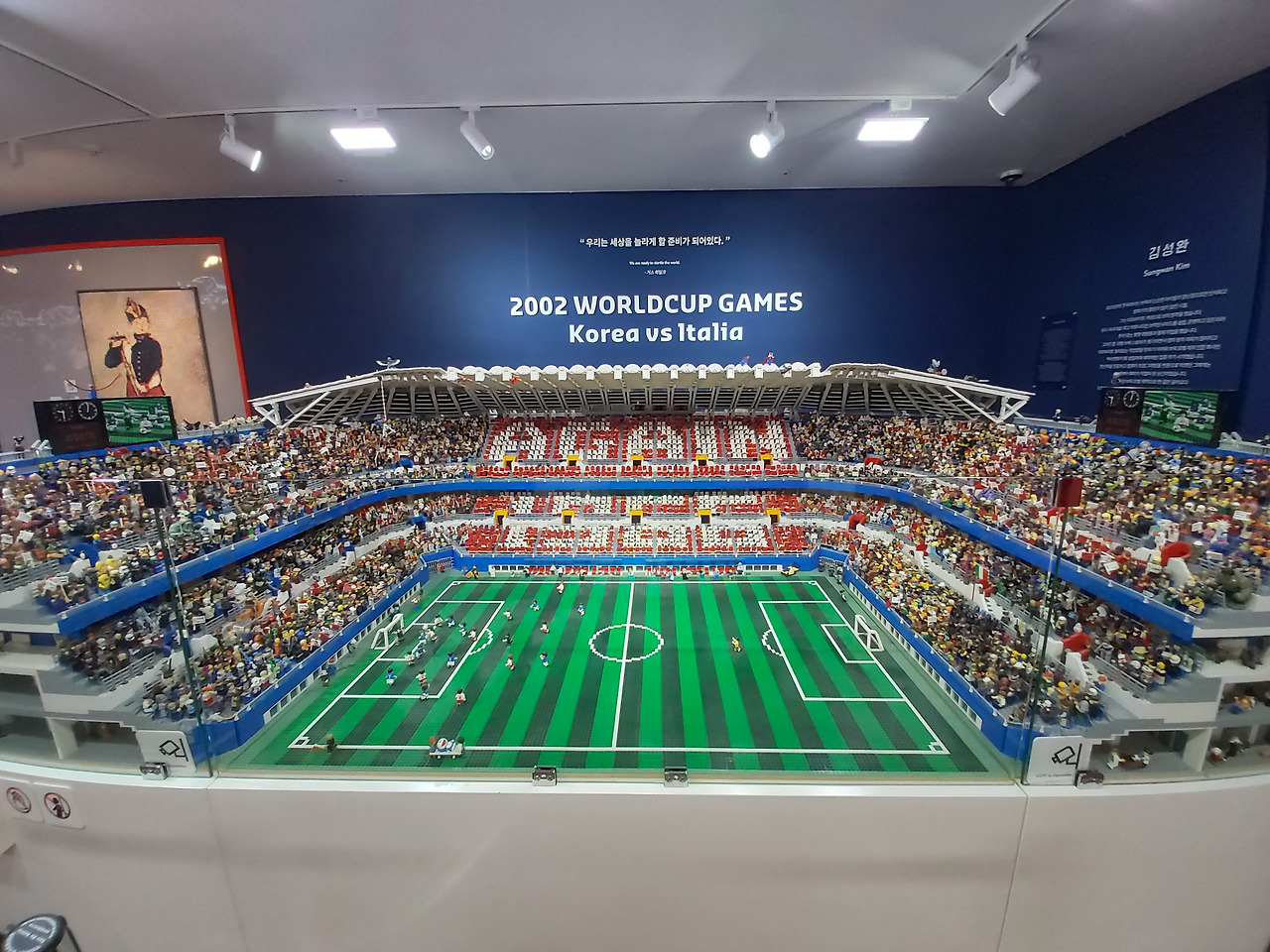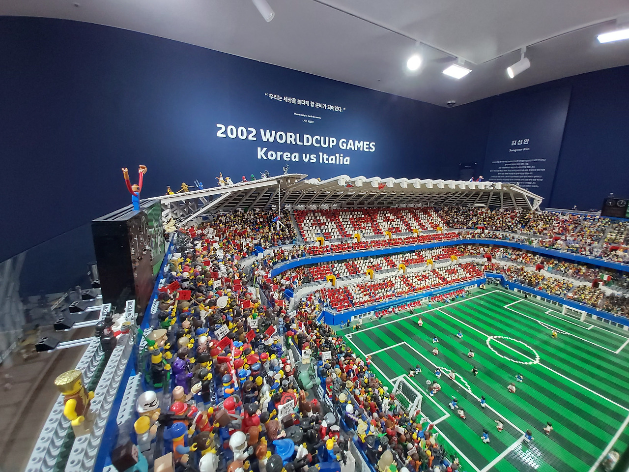 그리고 우리를 또 한 번 놀라게 한 것은 2002년 월드컵 이탈리아와의 경기를 브릭으로 만들어 놓은 것이었다. 실제 경기장을 비롯하여 관중들을 그대로 브릭으로 옮겨놓았다. 작은 조각들만으로 어떻게 이런 작품을 만들 수 있을까 우린 계속 감탄사만을 연발하며 사진을 찍을 수밖에 없었다. 정말 대단했다. 시간과 노력, 상상럭이 놀라웠다. 레고 블록 만들기를 좋아하는 우리 아이는 이런 것들을 둘러보며 웃음이 끊이지 않았다. 하나하나 작은 것까지 살펴보며 너무 행복한 표정이었다.