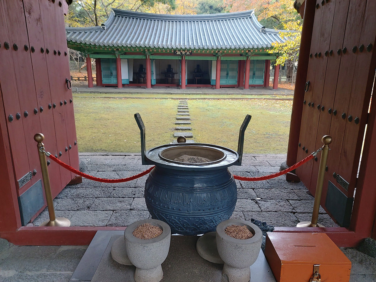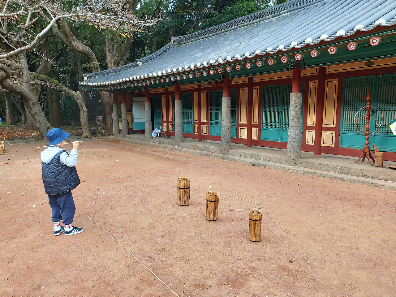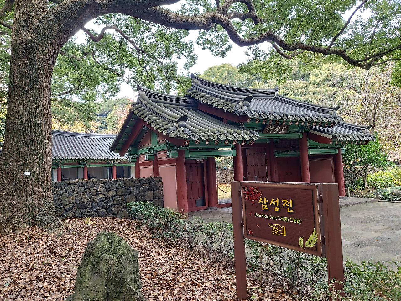 전시관을 나와서 삼성혈 주위를 둘러보았다. 가을 풍경을 제대로 느낄 수 있는 산책로와 사진 찍기 좋은 연리목, 그리고 아이들이 전통놀이를 할 수 있는 공간까지 아기자기하게 잘 구성되어 있었다. 삼성전이라고 하여 시조들에게 제사를 지내는 장소도 나타났다. 제주 도심 속에서 잔잔한 숲의 여유를 느낄 수 있는 신비스럽고 성스러운 공간이었다.