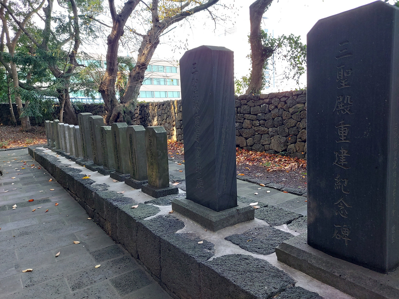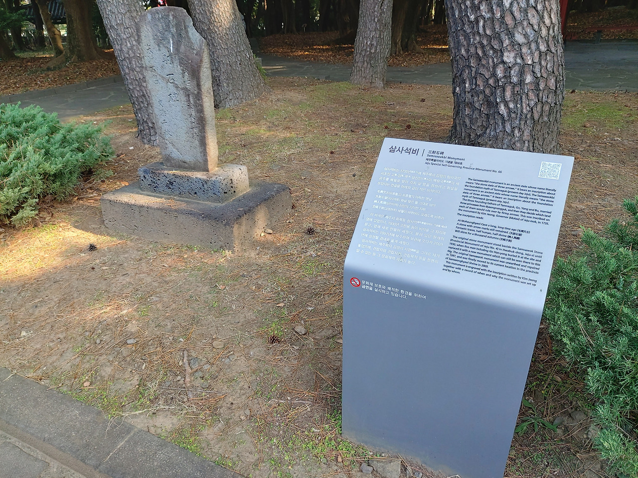 도심 속에 위치한 삼성혈 입구에는 가을 낙엽이 수북이 쌓여있었다. 여기저기에서 관리하시는 분들이 열심히 낙엽을 치우고 계셨고, 우리 그분들 사이로 삼성혈 입구로 들어갔다. 입구를 들어서는 순간, 오래된 나무들이 가득한 숲 속에서 뭔가의 신비스러운 기운이 느껴졌다. 그 나무들 사이로 깔끔하게 정리된 산책로가 있었고, 오래된 비석들도 보였다. 전시관 쪽으로 발걸음을 옮기니 가장 먼저 눈에 띈 것은 삼사석비였다. 이 비석은 1735년 제주목사 김정이 탐라국의 시조의 이야기를 적어 놓은 비석이었다. 비석에는 고씨, 양씨, 부씨 3명의 시조가 벽랑국의 세 공주를 배필로 맞아 각자 살 땅을 정하려고 화살을 쏘았다는 전설이 적혀 있었다. 원래는 화북동 삼사석 옆에 있다가 2009년 삼성혈로 옮긴 것이었다. 내용을 보니 이곳이 탐라 시조들에 대한 특별한 장소임이 짐작되었다.