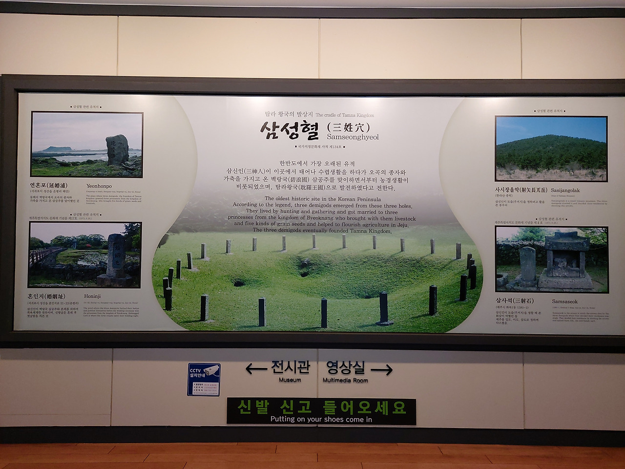 바로 앞에 전시장으로 들어갔다. 그곳에는 삼성혈에 대한 설명이 더 자세히 되어있었다. 여기는 탐라왕국의 발상지로, 한반도에서 가장 오래된 유적이고 삼신인이 이곳에서 태어났다는 신성한 신화의 중심지였다. 전시관에 들어가서 제주도 여기저기에 있는 신화에 대한 장소들을 둘러볼 수 있었다. 영상실에서는 그 신화를 약 13분 정도의 애니메이션으로 상영하고 있었다. 방문하는 사람이 많지 않기에, 직접 상영 버튼을 누르면 바로 영상을 확인할 수 있었다. 우리 가족 3명은 오붓하게 자리에 앉아서 영상을 관람했다. 삼신인의 등장부터 제주도에서의 생활, 그리고 결혼과 농경생활의 시작, 영역의 분할과 탐라왕국의 설립까지 자세히 설명되어 있었다. 이제야 삼성혈이 어떤 곳인지 제대로 느낄 수 있었다.