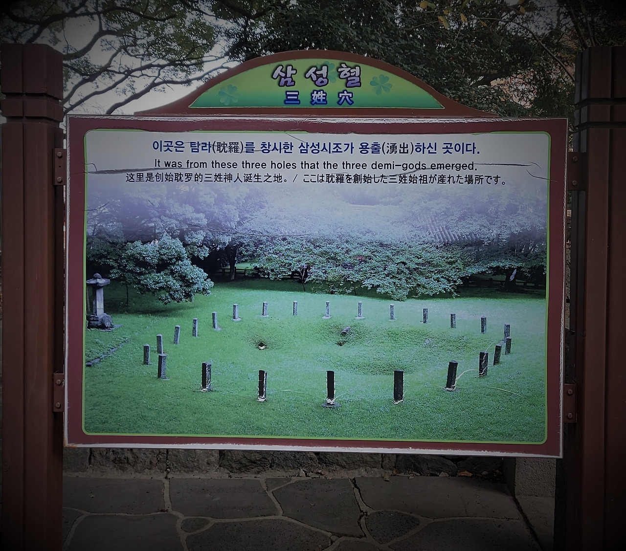 산책로 전체를 둘러보고 삼성혈 중심을 멀리서 지켜볼 수 있었다. 안내판에는 이곳이 탐라를 창시한 삼성 시조(제주고씨, 제주양씨, 제주부씨)가 용출하신 곳이라고 적혀 있었다. 자세히 보니 둥근 비석들 사이에 3개의 땅속 구멍이 있었고, 하늘에서 세 삼신인이 이곳으로 내려왔다고 전해진다고 했다. 참으로 신비스러운 곳이었다. 아주 오래전 우리 조상들의 창의적 상상력과 스토리텔링 능력에 대해서 다시 한번 감탄할 수밖에 없었다.