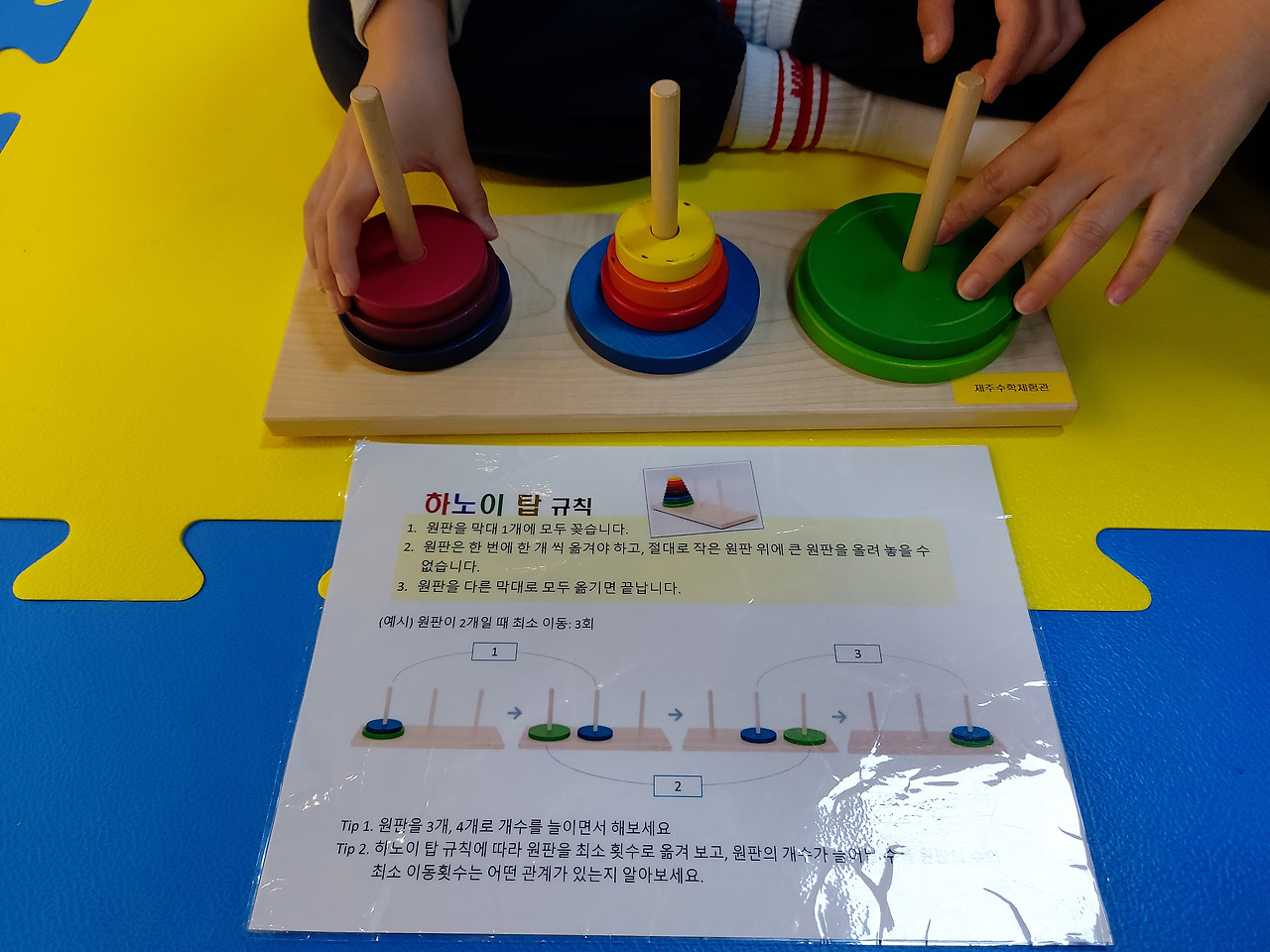 하노이 탑 게임마지막에는 하노이의 탑 게임에 도전했다. 원판을 순서대로 크기별로 옮기는 게임으로, 한 번에 하나씩만 가능하고, 절대로 작은 원반 위에 큰 원반을 놓을 수 없는 규칙이 있었다. 왠지 복잡해 보이는 게임이었는데, 아이가 4개의 원반까지 실수 없이 옮기는 것이었다. '오우'라는 놀랄 수밖에 없었다. 하지만 그다음부터는 시행착오의 반복. 아내가 아이를 도와서 7개까지는 성공을 했다. 하지만 마지막 2개는 내가 불가능하다며 말릴 수밖에 없었다. 인터넷을 검색해 보니 그것을 성공하는 최소의 수가 2의 N제곱에서 1을 뺀 것이었다. 6개라면 63번이면 가능하고, 7개라면 127번이면 가능하지만, 8개부터는 255회, 9개는 최소 515번이 걸린다. 너무 오래 걸리는 게임이었기에 중단시킬 수밖에 없었다. 7개라도 아마도 150번 정도를 이동했으니 어머어마한 노력을 한 것이었다. 이 게임을 마지막으로 우리는 수학체험관을 나왔다. 4층에서 가상현실 쳬험을 해보고 싶었지만, 공사 중이라는 말에 발걸음을 돌릴 수밖에 없었다. 아이는 아쉬워했지만, 다음을 기약해야 했다.