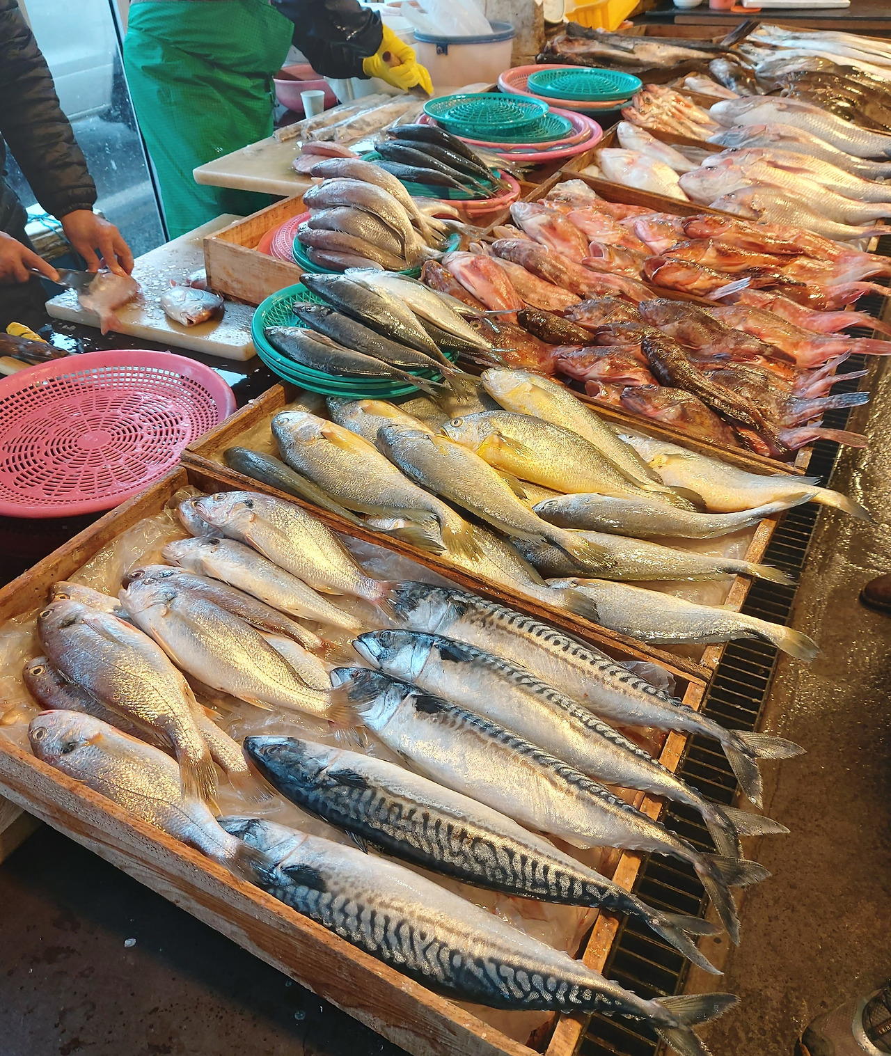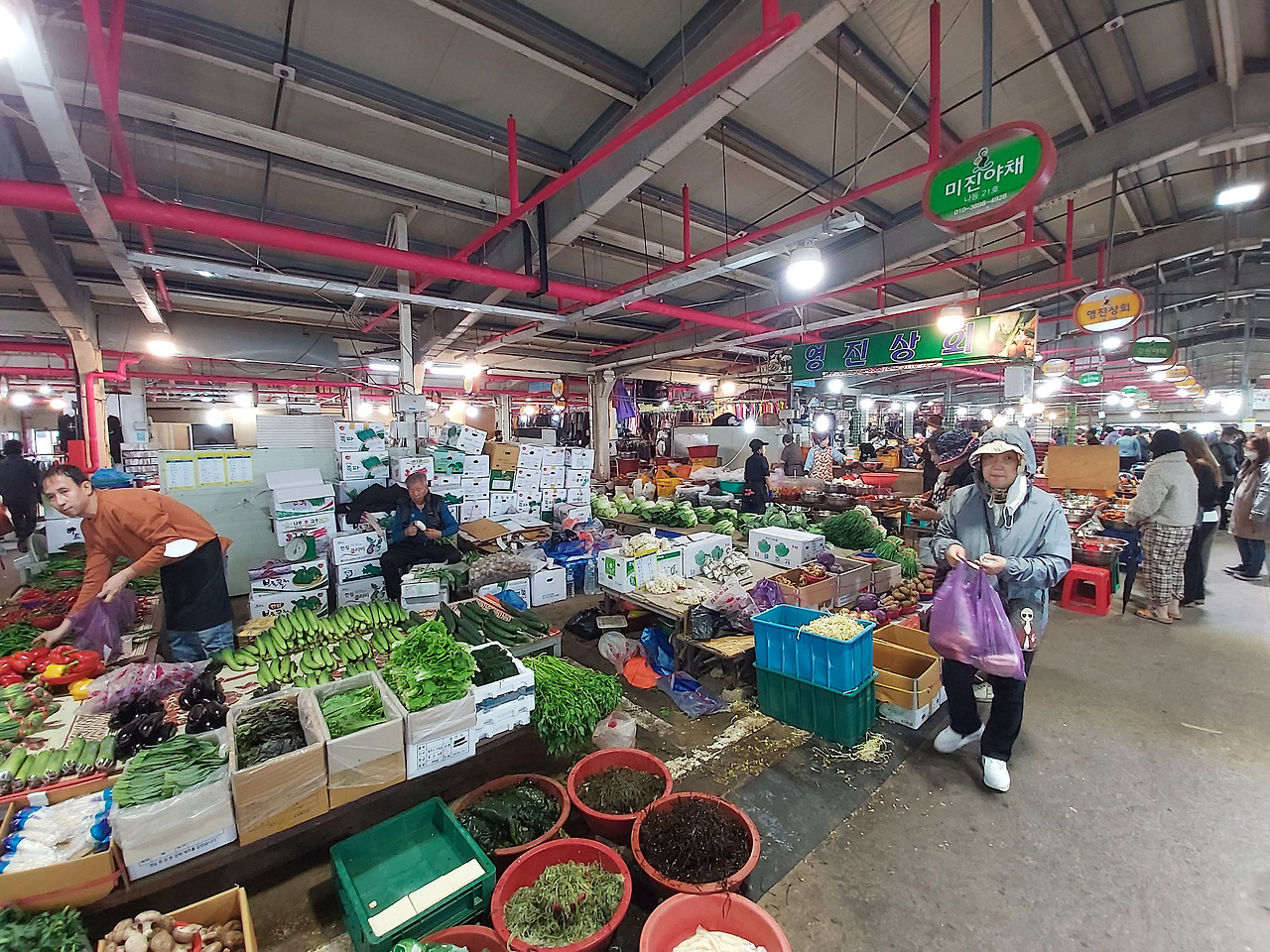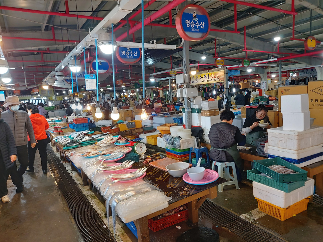 세화 오일장 풍경제주도 북동부의 최고 재래시장답게 시장의 규모는 근처의 여느 시장과 다르게 커 보였다. 싱싱한 생선부터 과일, 채소까지 없는 것이 없었다. 우리는 여기저기를 둘러보면서 시장 구경을 시작했다. 필요한 반찬류와 음식 재료 몇 가지를 구매한 후에 음식 장터 쪽으로 갔다. 가장 인기를 끄는 것은 호떡이었다. 할머니와 할아버지가 함께 호떡을 구우시면서 "제주 유일의 쑥 호떡"이라고 강조하시는 사장님. 긴 줄을 보니 역시 세화장의 핫한 아이템 같아 보였다. 호떡과 함께 떡볶이와 순대, 붕어빵 등을 사서 우리는 집으로 돌아왔다. 비도 오고 사람도 많았기에 집에서 오붓하게 점심을 먹기로 한 것이었다.