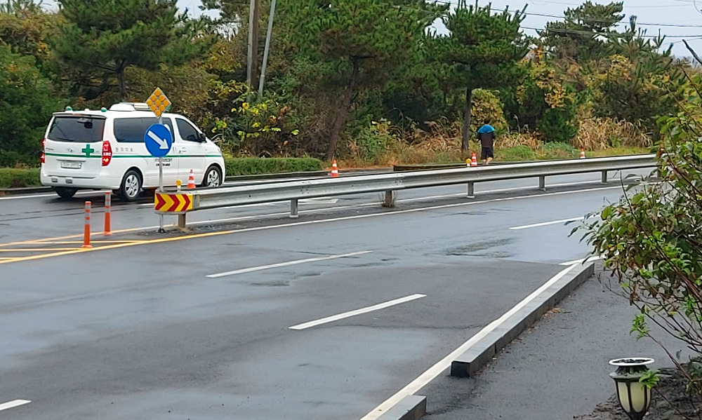 아침식사를 하고 비 내리는 창 밖을 바라보며 커피 한 잔을 했다. 근데 경찰차를 비롯한 몇 대의 행사 차량이 지나가면서 도로 1개 차선이 통제되기 시작하는 것이었다. 문뜩 며칠 전 보았던 도로 통제 안내판이 생각났다. 오늘 제주에서 열리는 제주국제감귤마라톤 대회를 위해 9시 30분부터 14시 30분까지 도로 통제를 한다는 내용이었다. 아침부터 비가 많이 와서 행사가 취소될 것이라고 생각했는데 그대로 열리는 듯했다. 대회 홈페이지 들어가서 우리 숙소의 위치를 확인해 보니 8km 구간에 우리 숙소가 위치해 있었다. 시간을 보니 10시가 조금 넘은 시각. 원래 계획대로 행사가 진행된다면 잠시 후에 풀코스 선두 주자들이 지나갈 듯했다. 혹시나 하는 생각에 거실 앞에 데크로 나가서 도로를 살폈다. 아니나 다를까 저 멀리서 경찰차와 기록차가 달려오고 있었다. 그리고 뒤를 따라서 젖은 길을 가르며 마라톤 선두주자들이 힘차게 달려오고 있었다. 비가 엄청나게 내리고 있는 상황에서 빠른 속도로 선두팀은 우리 숙소를 지나갔다. 그리고 얼마가 지났을까. 몇몇 선수들이 줄지어서 지나갔다. 그리고 10여분이 지나니 수많은 사람들이 뒤를 따르기 시작했다. 아마도 하프 코스를 뛰는 일반 동호회인들인 듯했다. 한 명, 두 명, 서너 명이 줄을 지어서 빗 속에서 달리고 있었다.