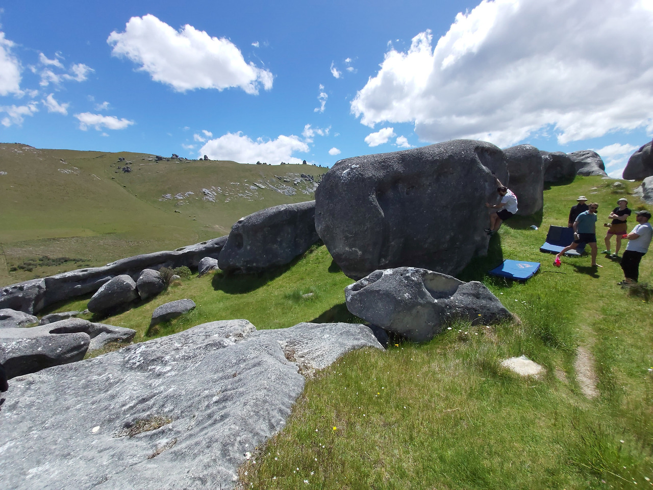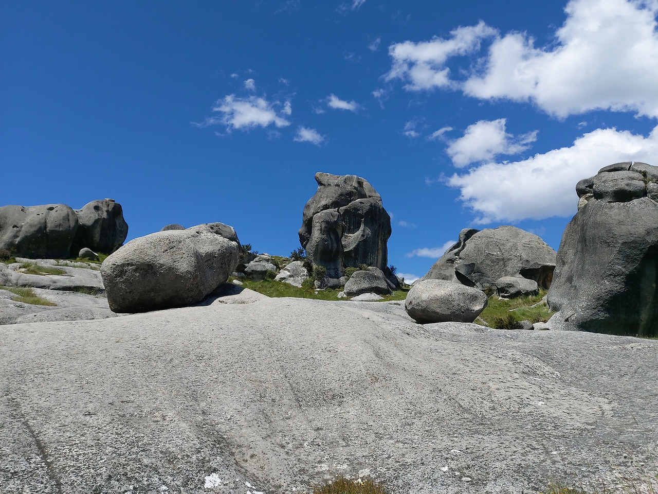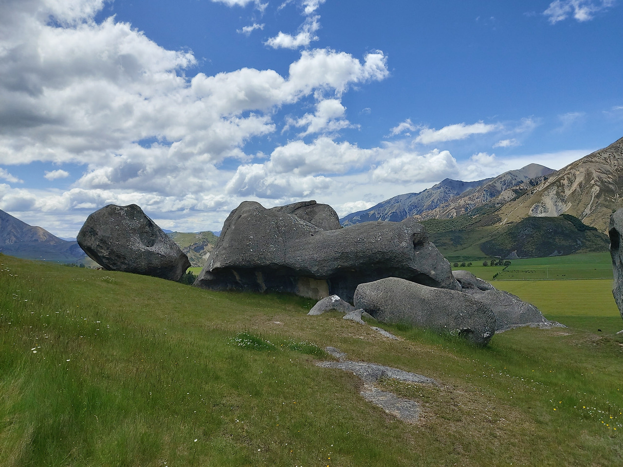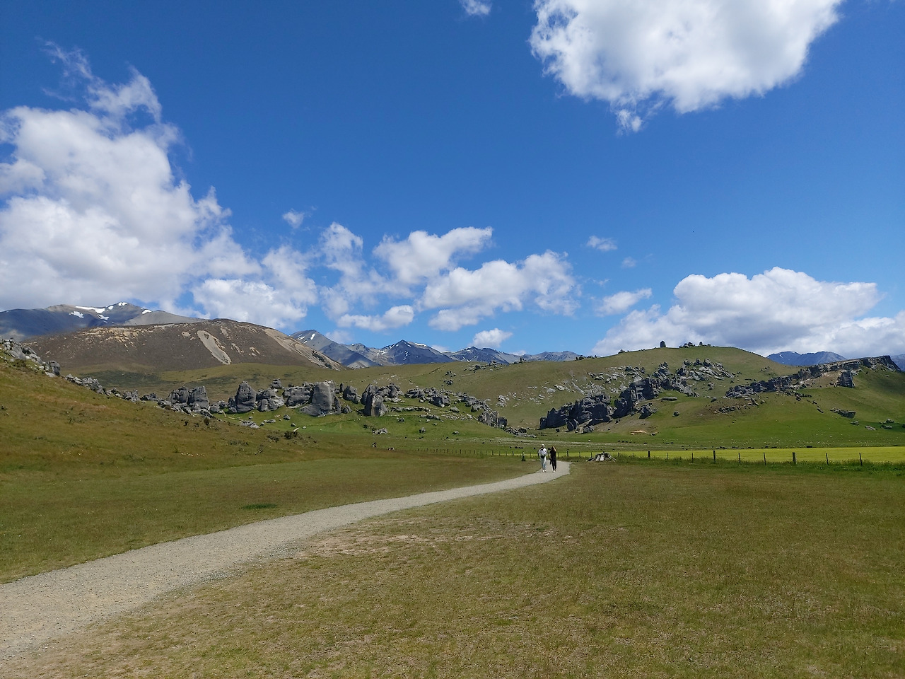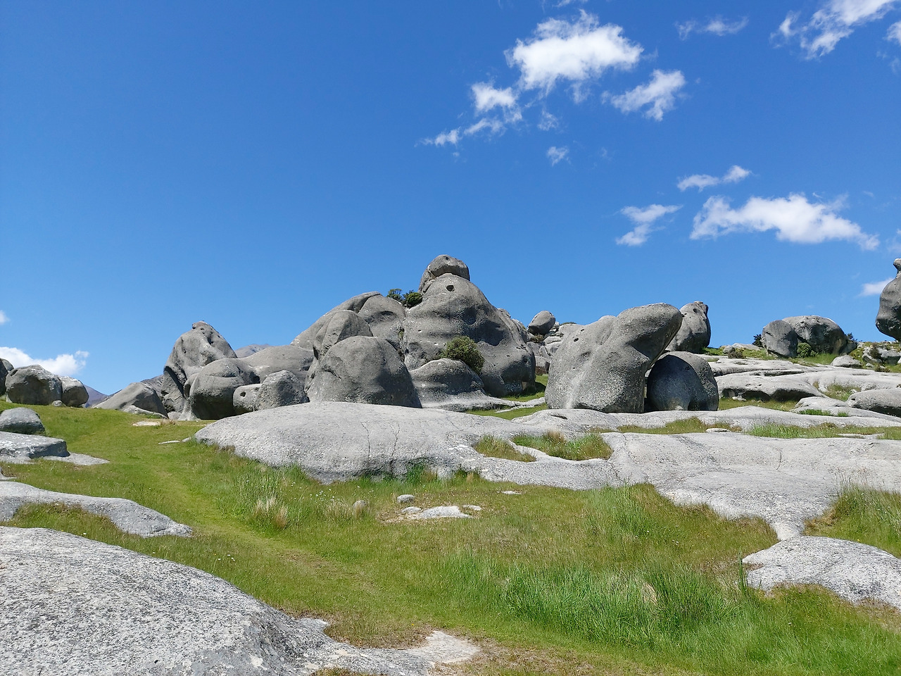 캐슬힐 가는 길1시간 정도를 달리니 스프링 필드(springfield) 라는 남섬 중부의 조용한 시골 마을이 지났고, 여기부터는 서서히 산악 지형이 나타나기 시작했다. 눈이 녹아서 만들어진 계곡을 따라서 조금씩 고도를 높여나갔다. 자동차로 구불구불 5분 정도 산길을 오르니 포터스 패스(Porters Pass)가 나왔다. 우리나라의 고갯길과 유사한 곳이었다. 여기서부터 약 10분을 더 달려서 우리의 목적지인 캐슬 힐 주차장에 도착할 수 있었다. 캐슬힐 주위에는 거대한 초원이 펼쳐져 있었고, 그 주위를 멀리서 산들이 둘러싸고 있었다. 차에서 내리니 저 멀리 거대한 바위 덩어리들이 우리 눈에 들어왔다.