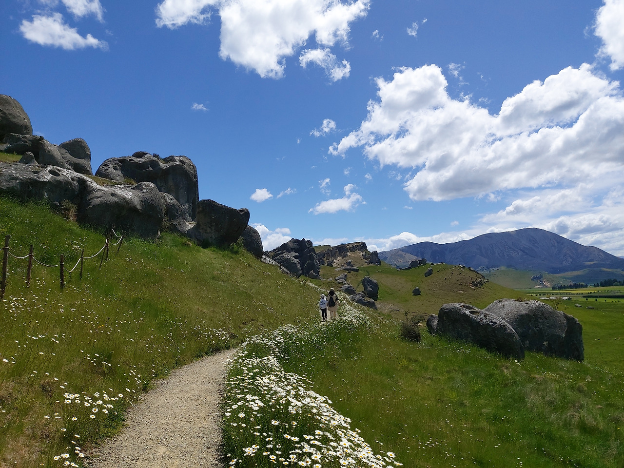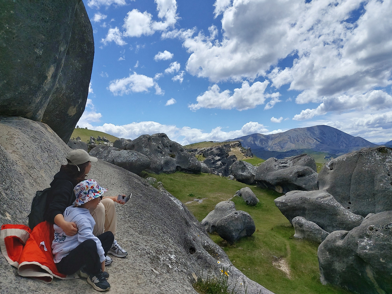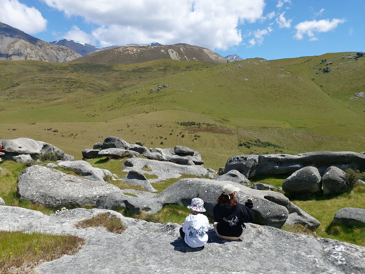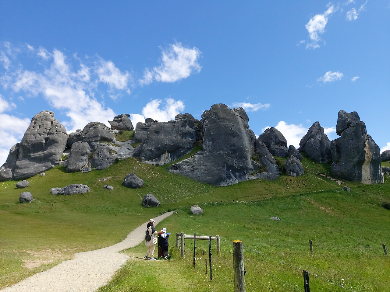 캐슬힐 앞에서 아내와 아이우리는 반시계 방향으로 캐슬힐을 둘러보기로 했다. 먼저 정면을 둘러보면서 오른쪽으로 걸어 올라갔다. 실제로 가까이에서 지켜본 바위는 10여 미터 이상의 거대한 바위들이었다. 그 하나하나의 형상이 형언할 수 없을 정도로 기이한 모습을 하고 있었다. 기암괴석과 야생화로 이어진 탐방로를 따라서 그 안쪽으로 들어갔다. 단지 몇 개의 돌들이라고 생각했지만 안으로 들어오니 수십에서 수백 개의 돌들이 초원 위에 차리잡고 있었다. 우리는 암석 사이로 정상부로 올라갔다. 그리고 저 멀리 펼쳐지는 초원과 산들의 풍경들을 감상했다. 뉴질랜드에 와서 보는 최고의 풍경들이었다. 언덕 아래에는 소와 양들이 방목되고 있었고, 저 멀리 눈이 살짝 쌓인 거대한 산들이 한눈에 들어왔다.