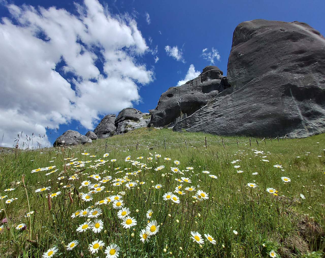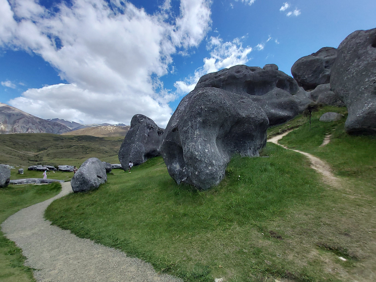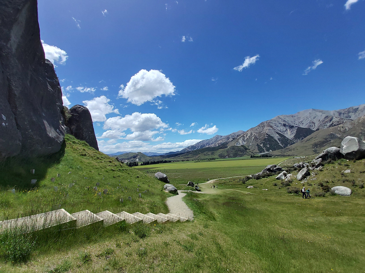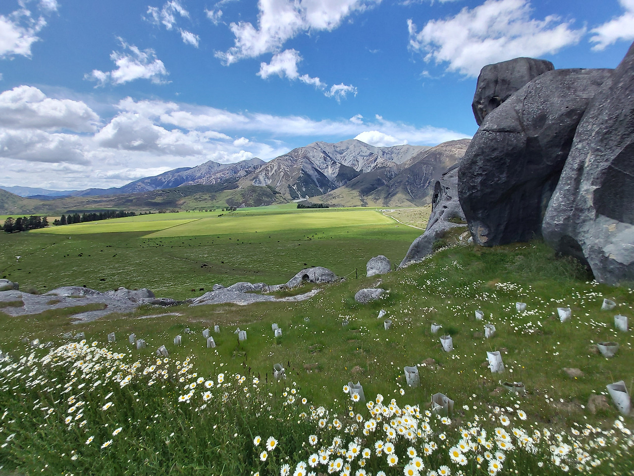 캐슬힐 앞에서 아내와 아이우리는 반시계 방향으로 캐슬힐을 둘러보기로 했다. 먼저 정면을 둘러보면서 오른쪽으로 걸어 올라갔다. 실제로 가까이에서 지켜본 바위는 10여 미터 이상의 거대한 바위들이었다. 그 하나하나의 형상이 형언할 수 없을 정도로 기이한 모습을 하고 있었다. 기암괴석과 야생화로 이어진 탐방로를 따라서 그 안쪽으로 들어갔다. 단지 몇 개의 돌들이라고 생각했지만 안으로 들어오니 수십에서 수백 개의 돌들이 초원 위에 차리잡고 있었다. 우리는 암석 사이로 정상부로 올라갔다. 그리고 저 멀리 펼쳐지는 초원과 산들의 풍경들을 감상했다. 뉴질랜드에 와서 보는 최고의 풍경들이었다. 언덕 아래에는 소와 양들이 방목되고 있었고, 저 멀리 눈이 살짝 쌓인 거대한 산들이 한눈에 들어왔다.