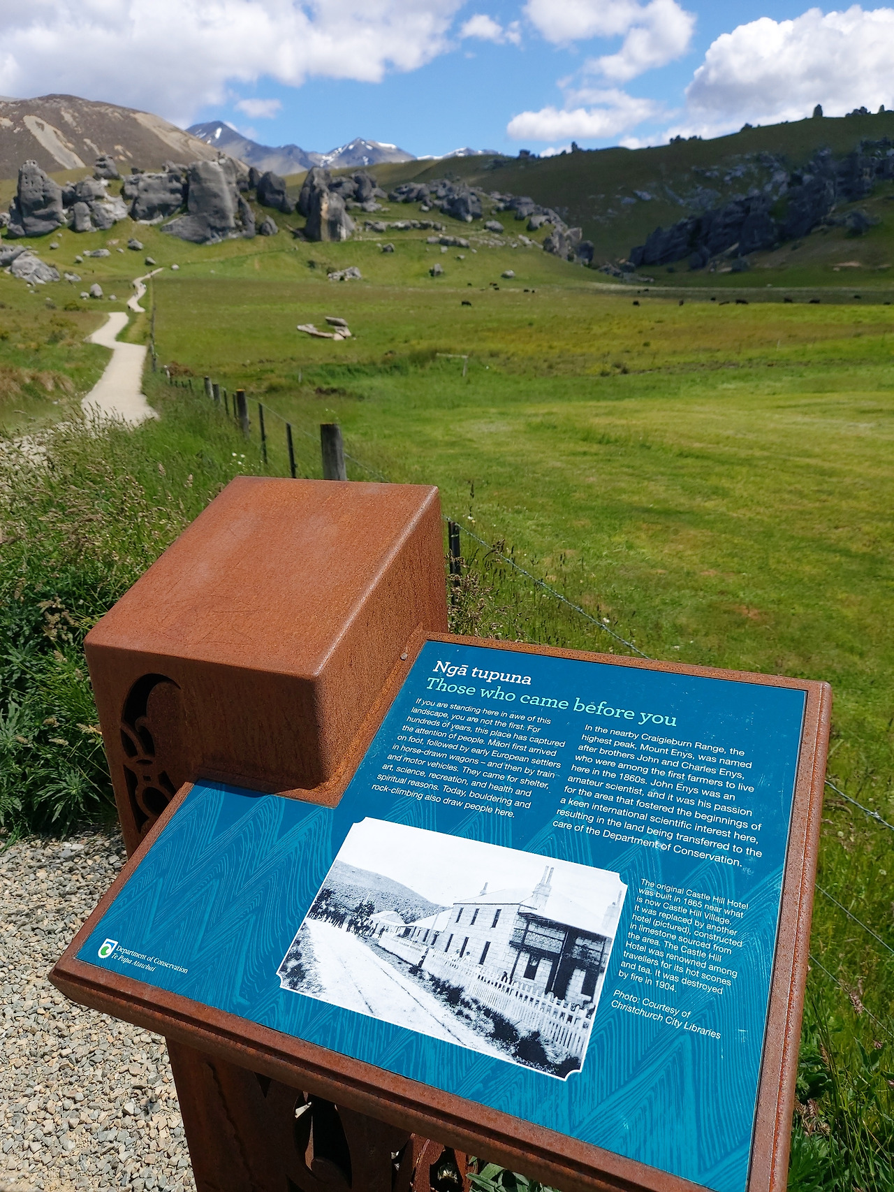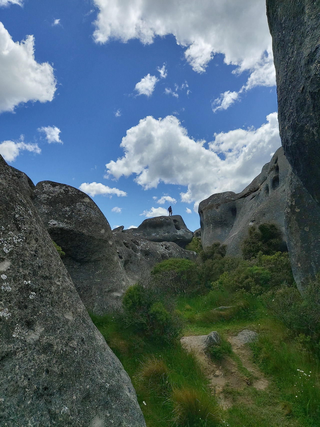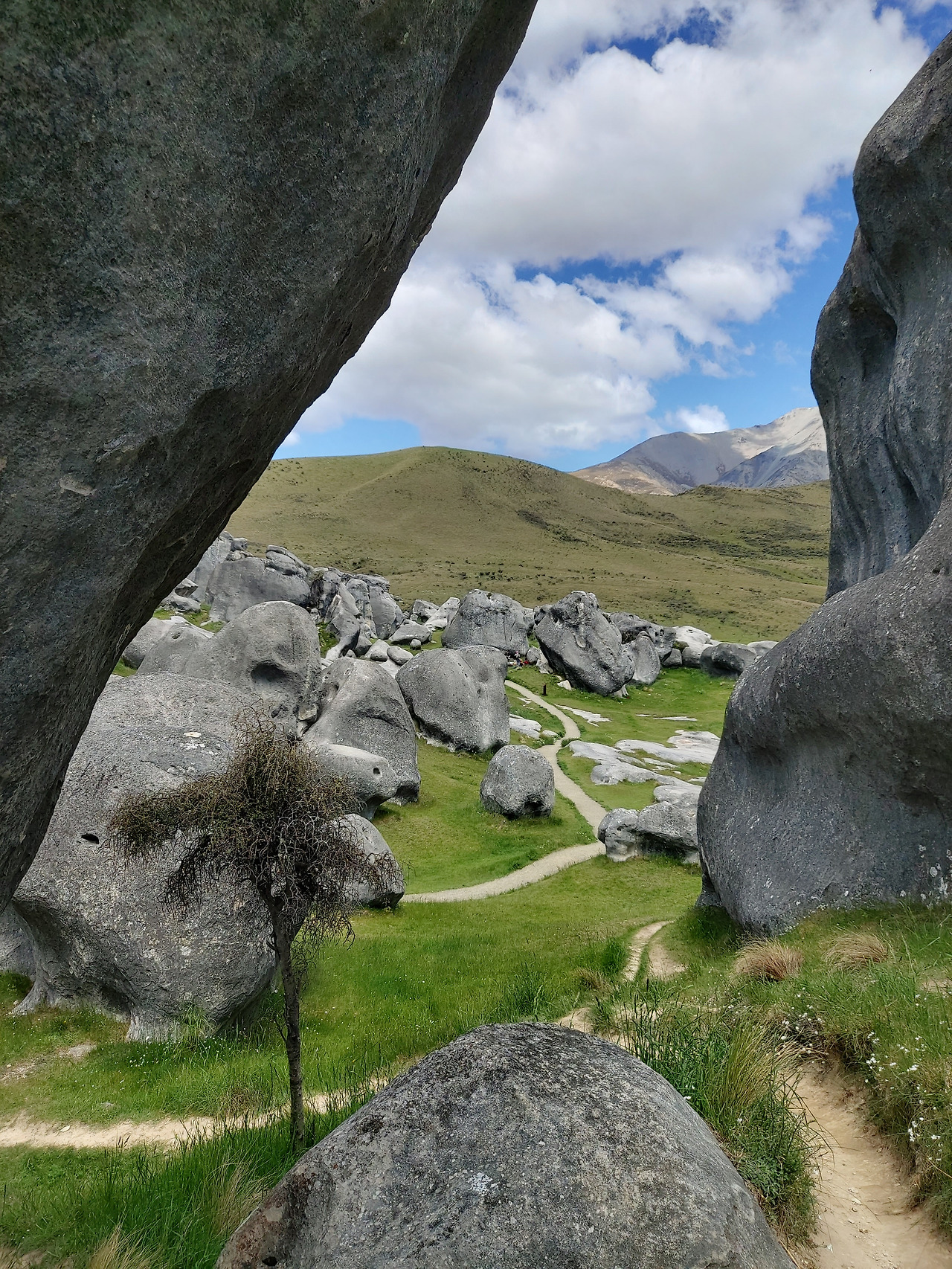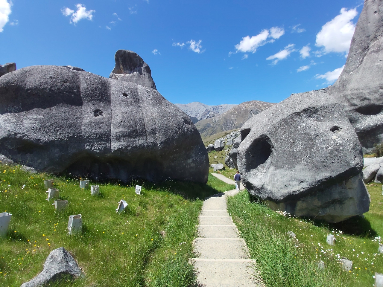 캐슬힐 앞에서 아내와 아이우리는 반시계 방향으로 캐슬힐을 둘러보기로 했다. 먼저 정면을 둘러보면서 오른쪽으로 걸어 올라갔다. 실제로 가까이에서 지켜본 바위는 10여 미터 이상의 거대한 바위들이었다. 그 하나하나의 형상이 형언할 수 없을 정도로 기이한 모습을 하고 있었다. 기암괴석과 야생화로 이어진 탐방로를 따라서 그 안쪽으로 들어갔다. 단지 몇 개의 돌들이라고 생각했지만 안으로 들어오니 수십에서 수백 개의 돌들이 초원 위에 차리잡고 있었다. 우리는 암석 사이로 정상부로 올라갔다. 그리고 저 멀리 펼쳐지는 초원과 산들의 풍경들을 감상했다. 뉴질랜드에 와서 보는 최고의 풍경들이었다. 언덕 아래에는 소와 양들이 방목되고 있었고, 저 멀리 눈이 살짝 쌓인 거대한 산들이 한눈에 들어왔다.